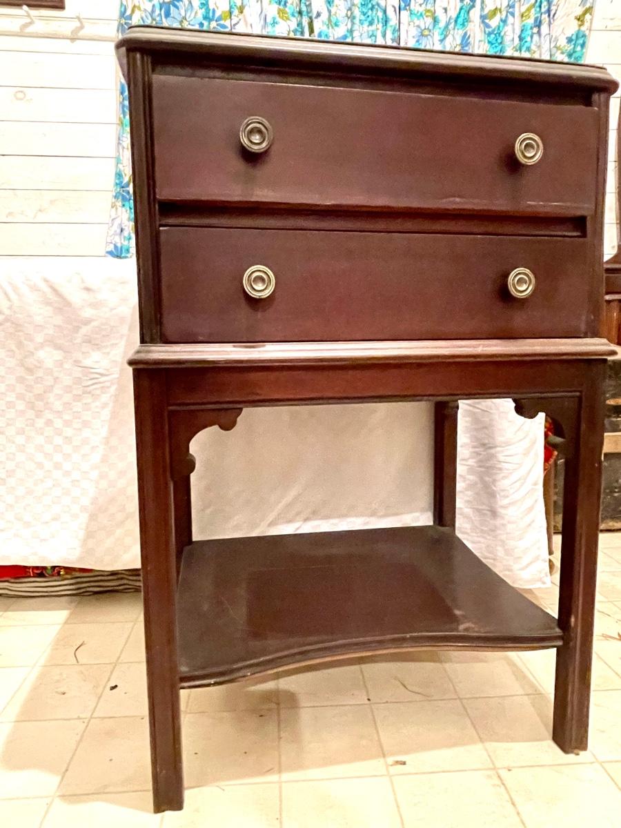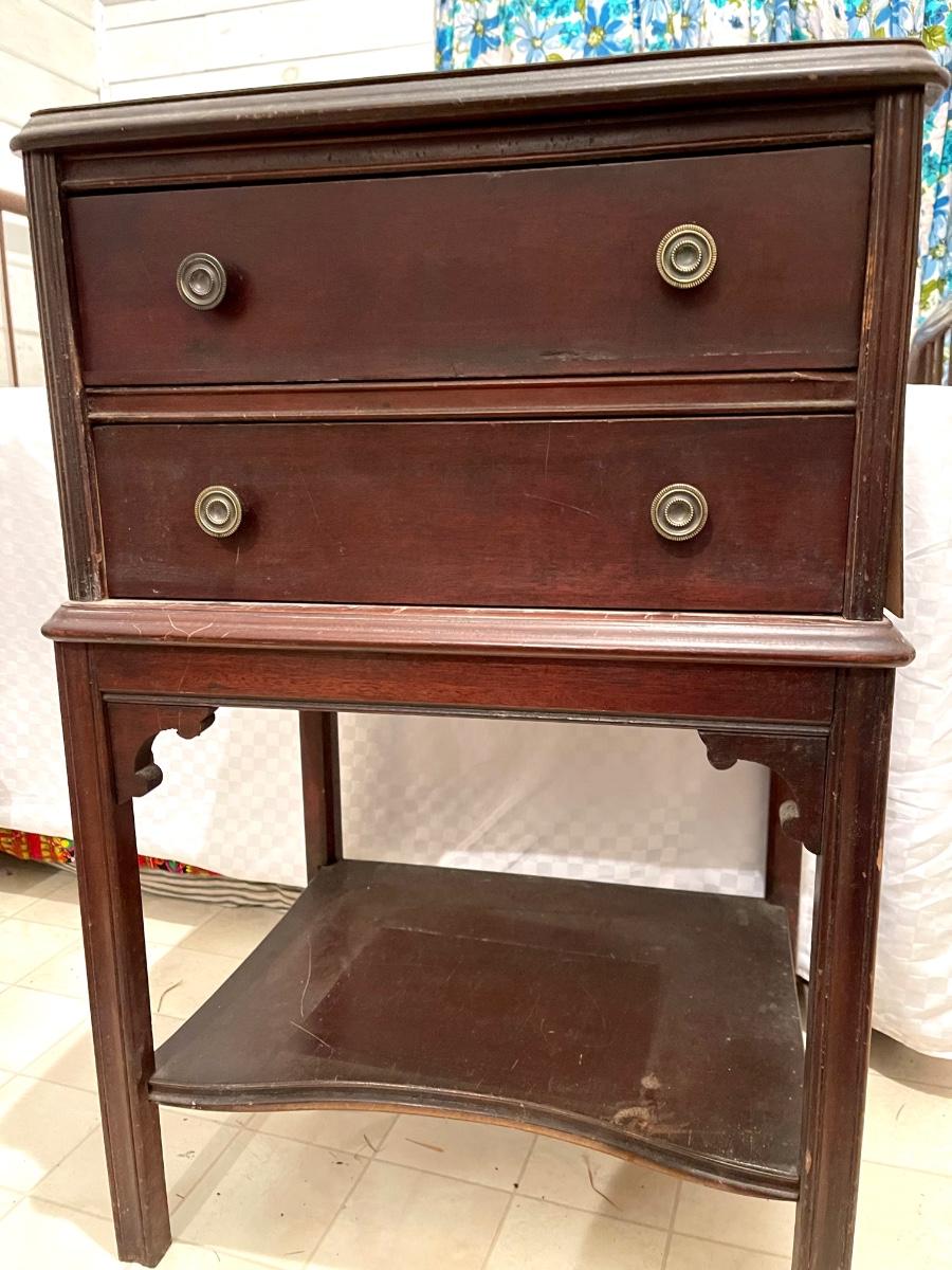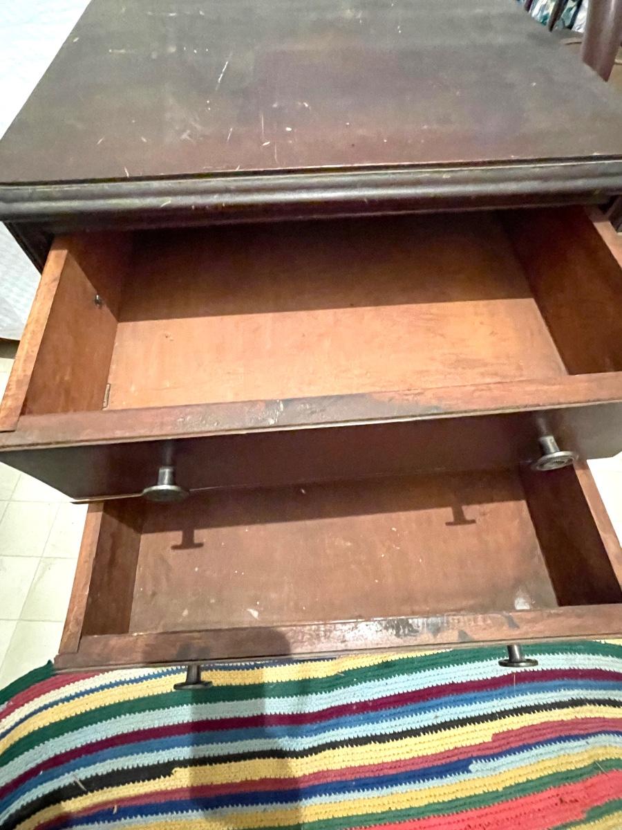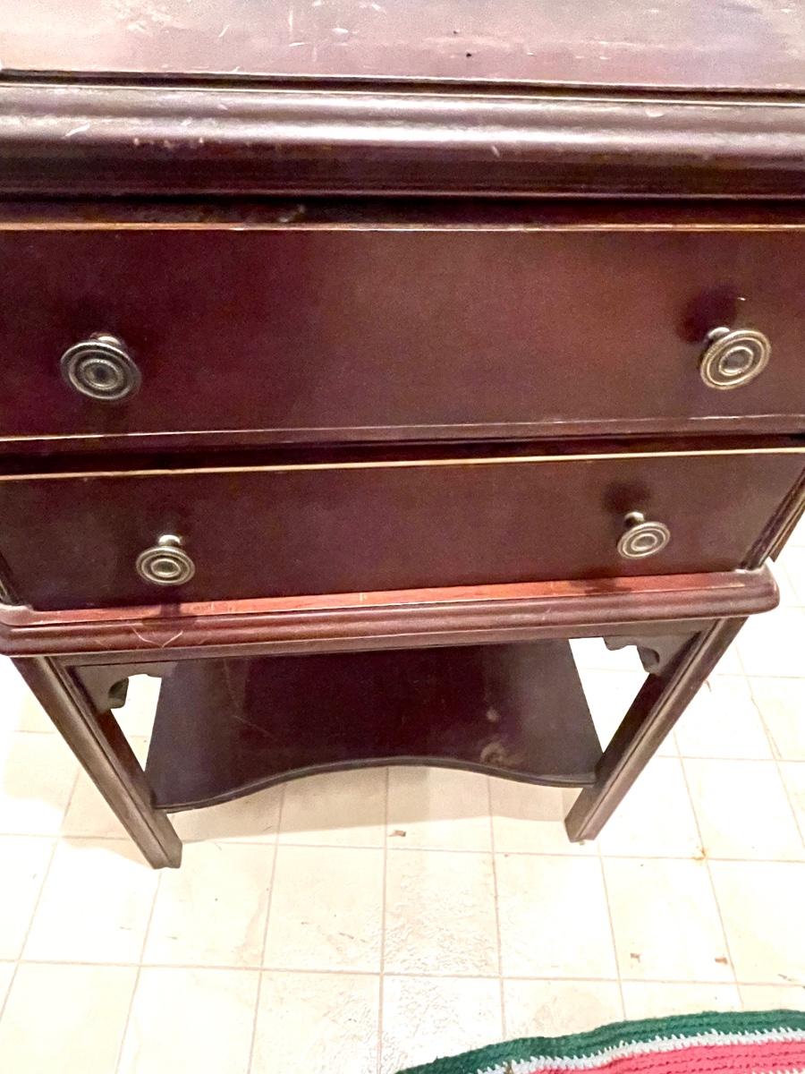 This small 2 drawer table could be used anywhere. It looks nice but a very close inspection will show that veneer is come apart on the side and the top. It’s not very noticeable on the top as it has only separated a bit across the front but it didn’t split which I believe is why it’s not as noticeable. The sis has become a bit more detached. Please see pics. Easy project piece but honestly can be polished up and used as is.