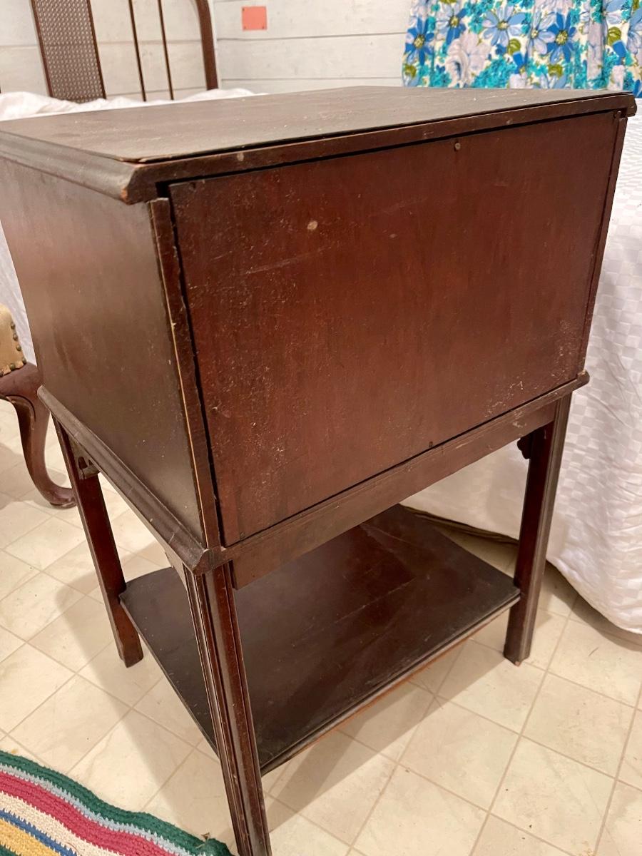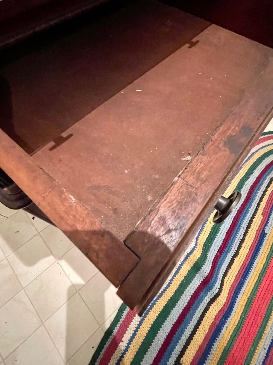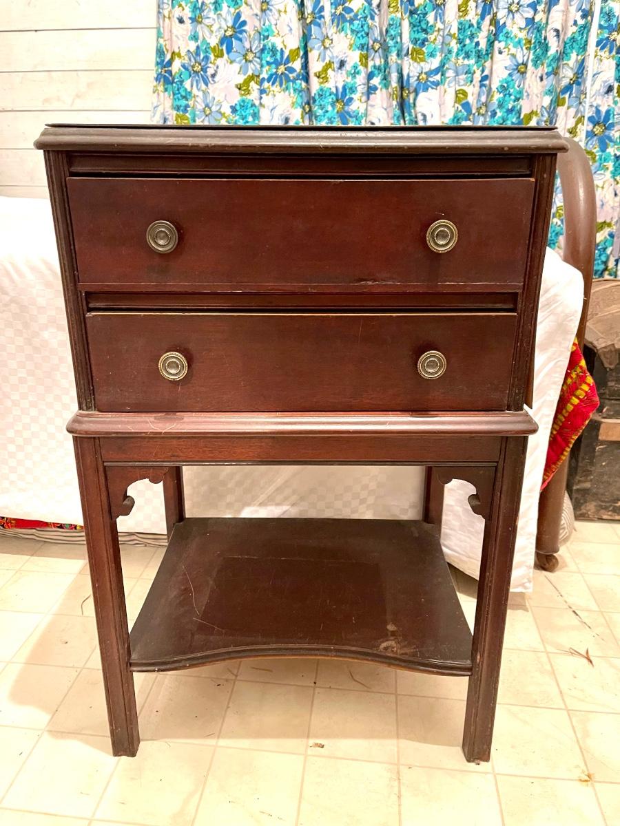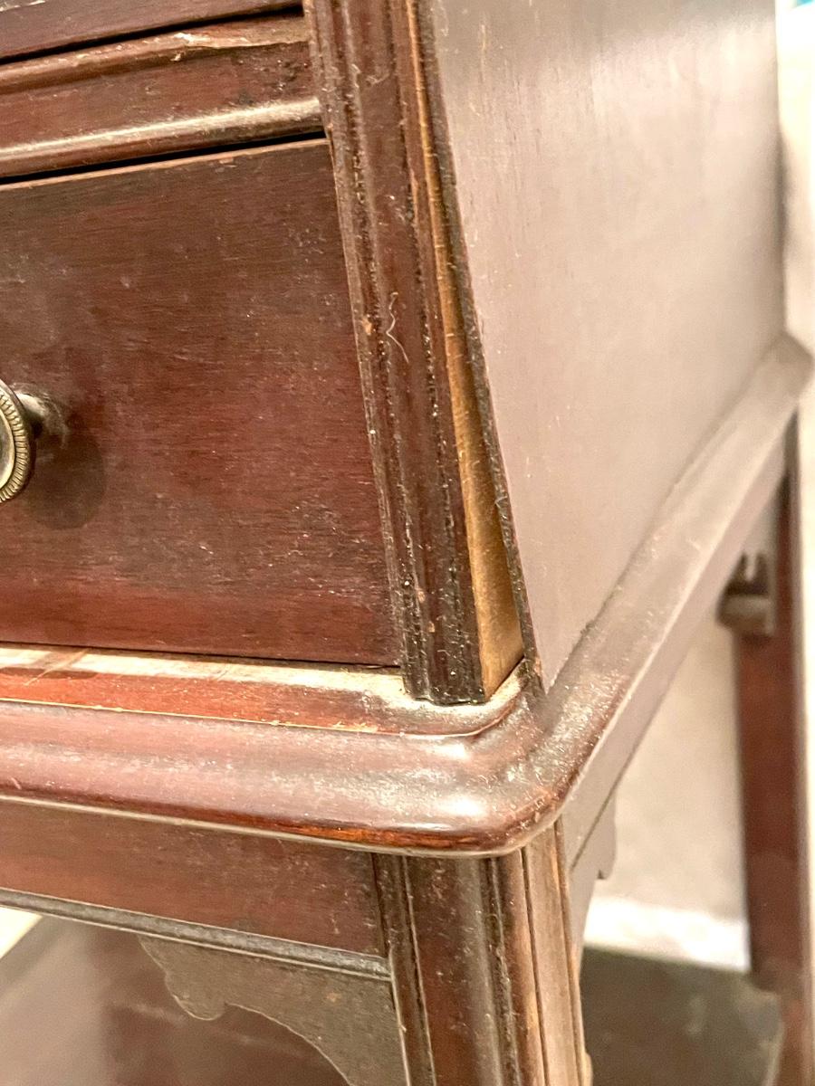 This small 2 drawer table could be used anywhere. It looks nice but a very close inspection will show that veneer is come apart on the side and the top. It’s not very noticeable on the top as it has only separated a bit across the front but it didn’t split which I believe is why it’s not as noticeable. The sis has become a bit more detached. Please see pics. Easy project piece but honestly can be polished up and used as is.