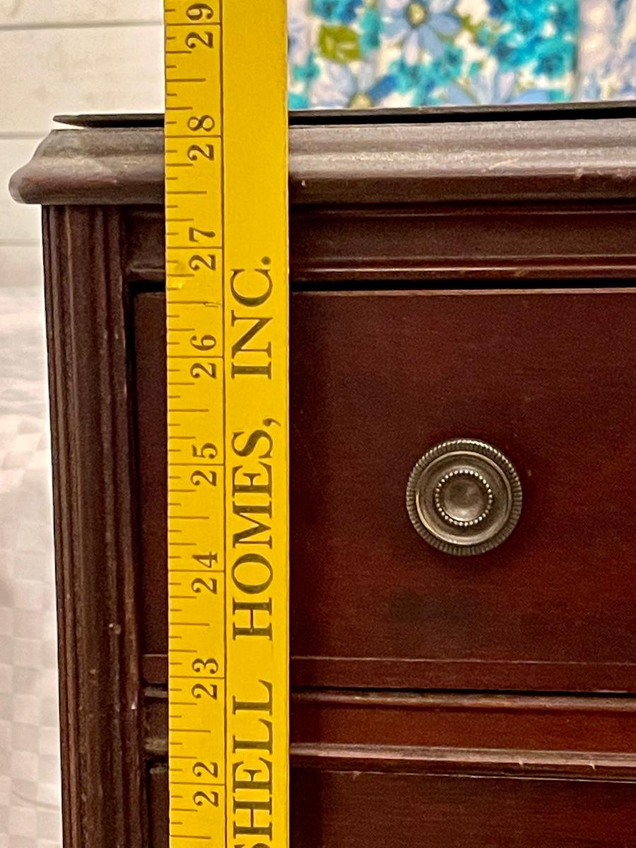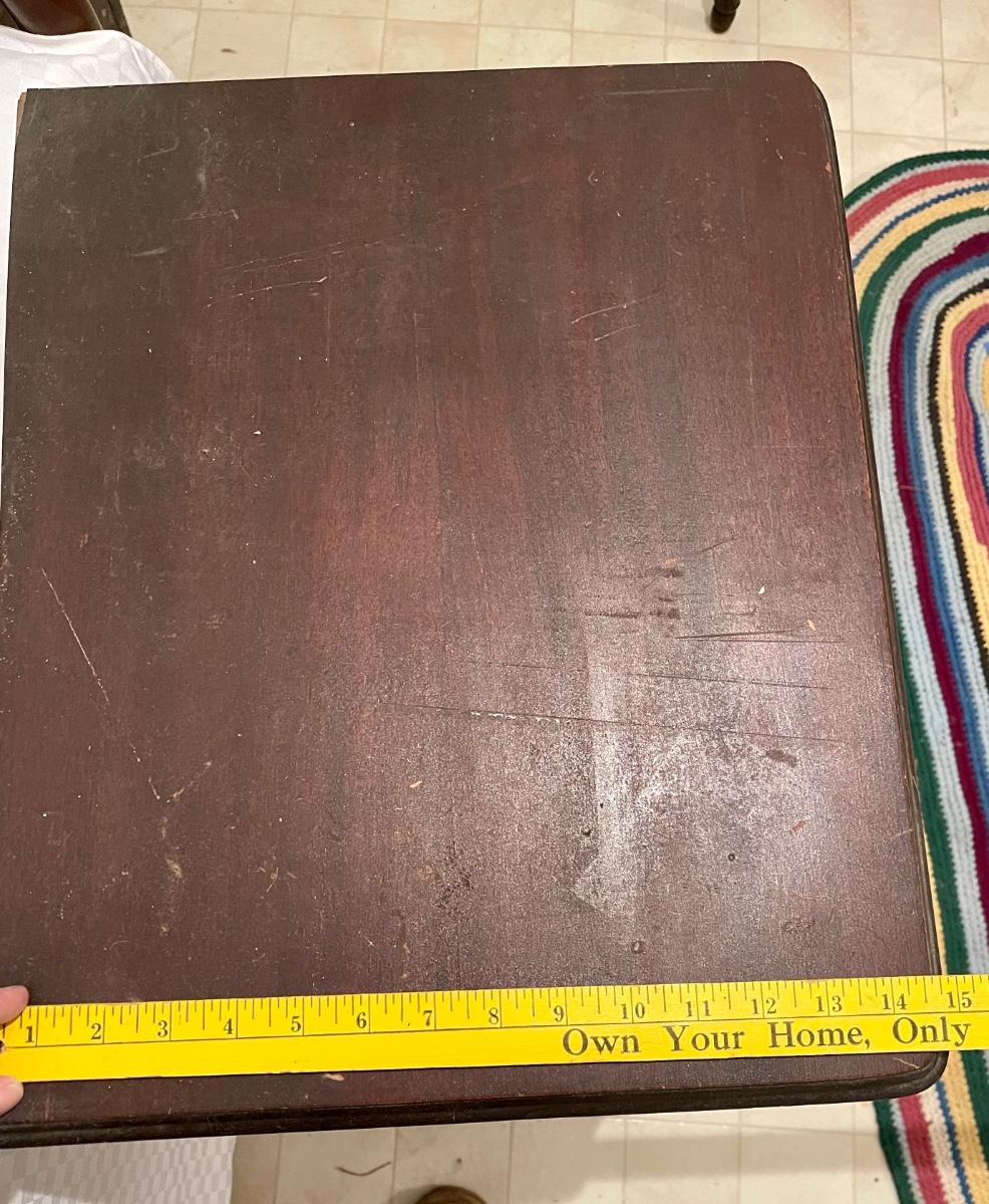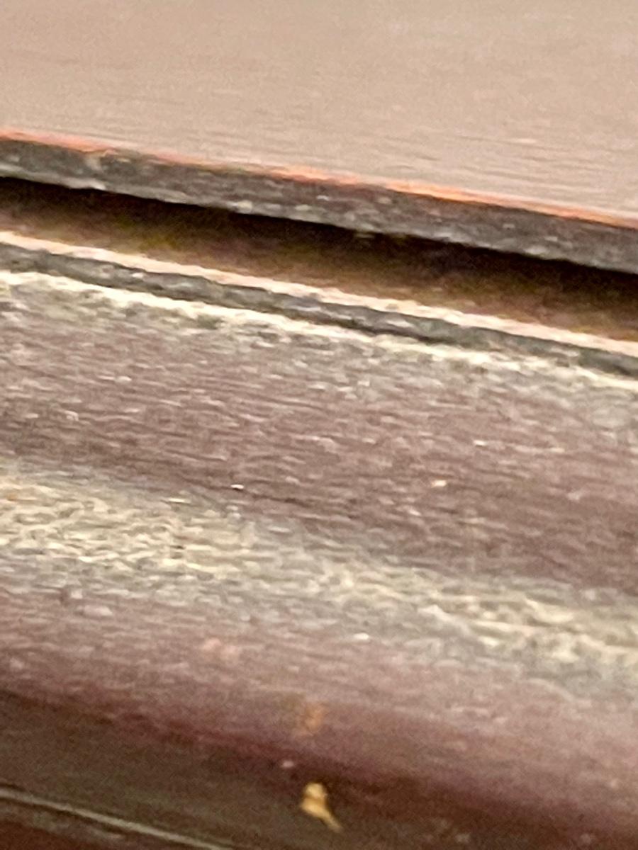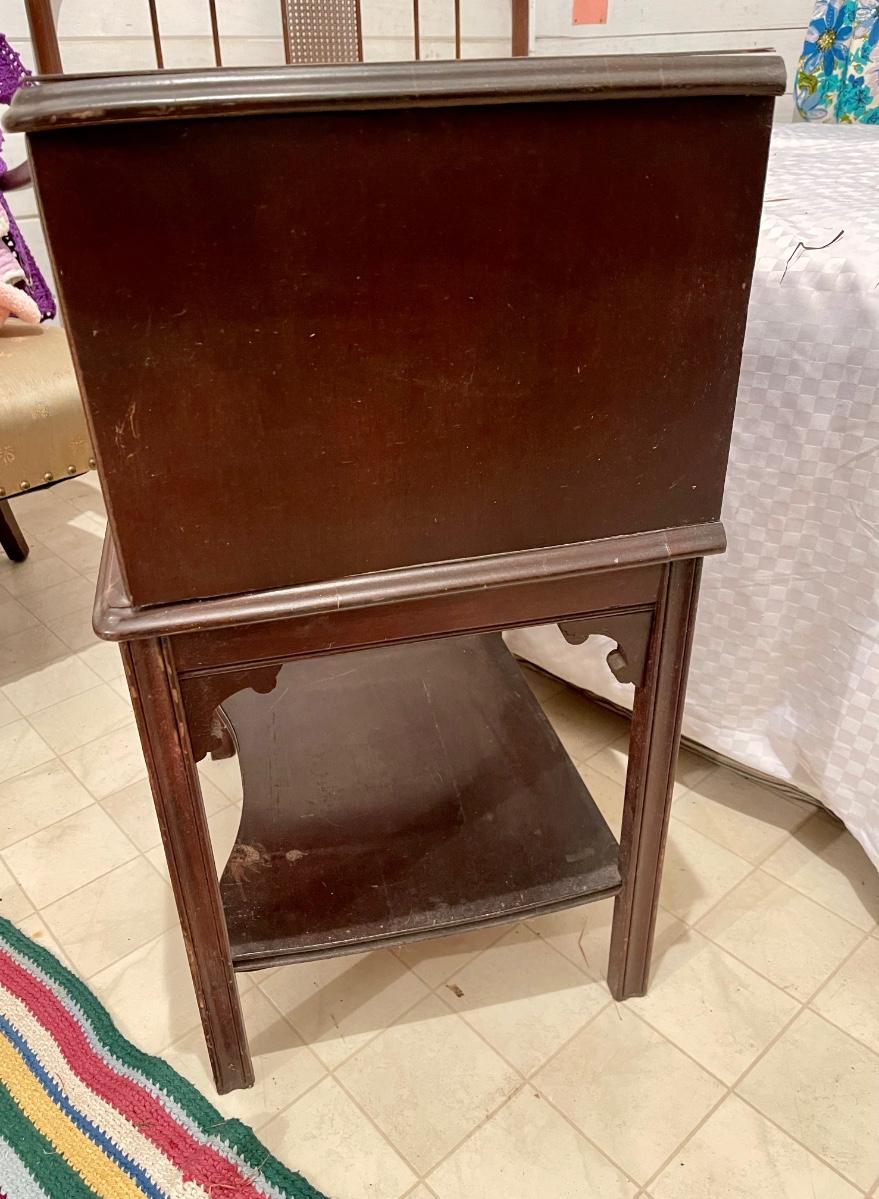 This small 2 drawer table could be used anywhere. It looks nice but a very close inspection will show that veneer is come apart on the side and the top. It’s not very noticeable on the top as it has only separated a bit across the front but it didn’t split which I believe is why it’s not as noticeable. The sis has become a bit more detached. Please see pics. Easy project piece but honestly can be polished up and used as is.