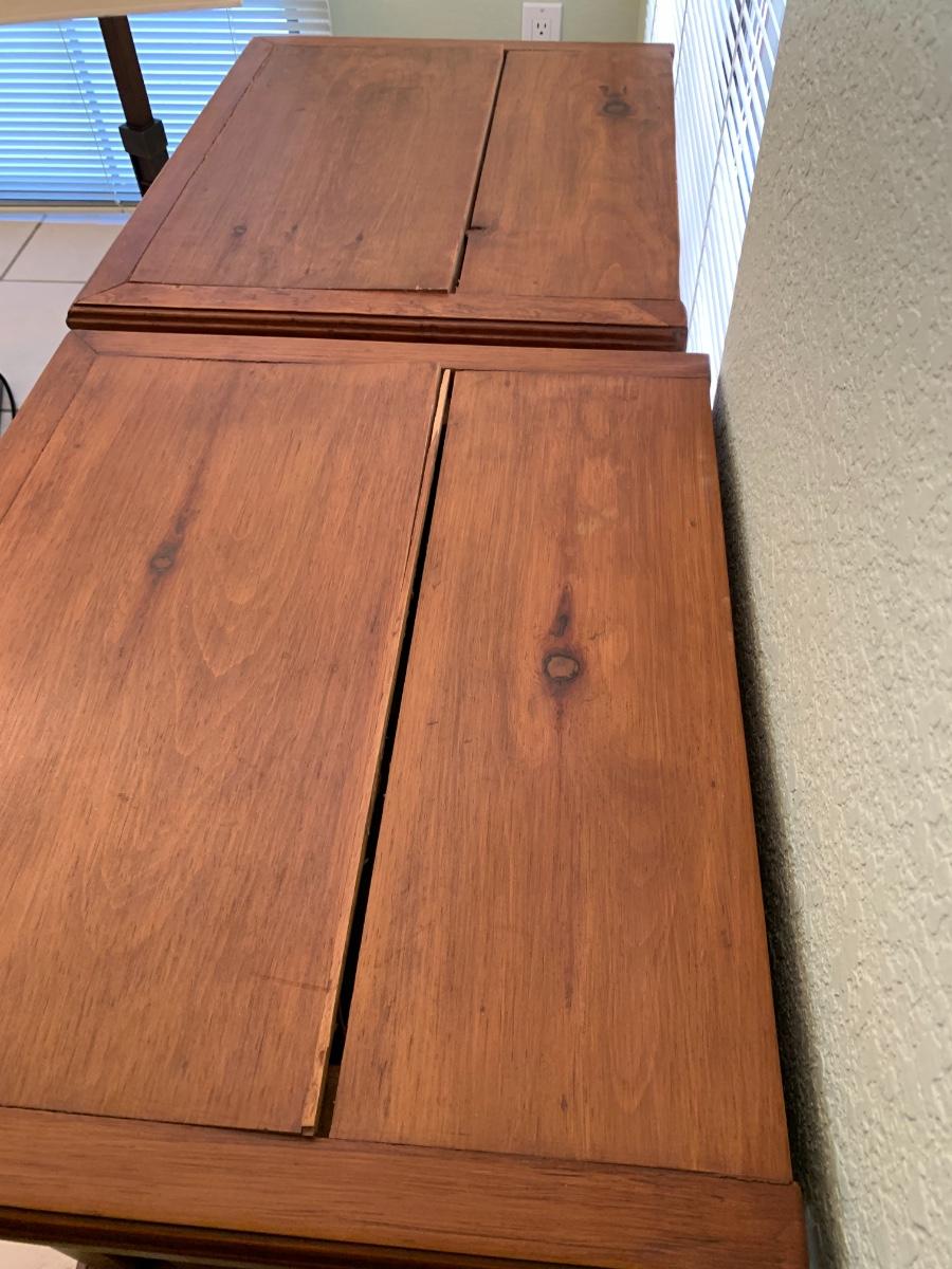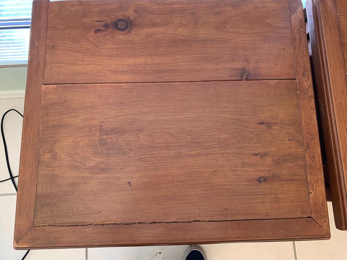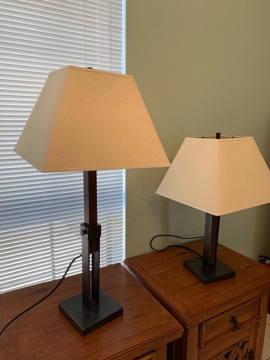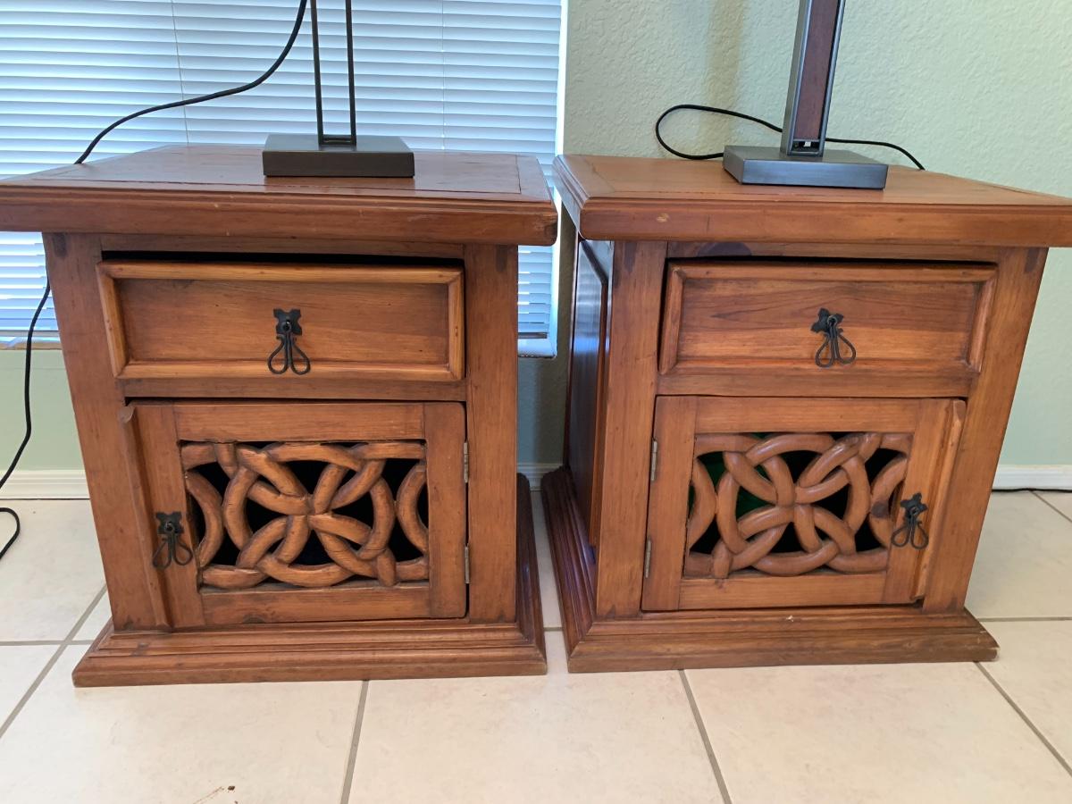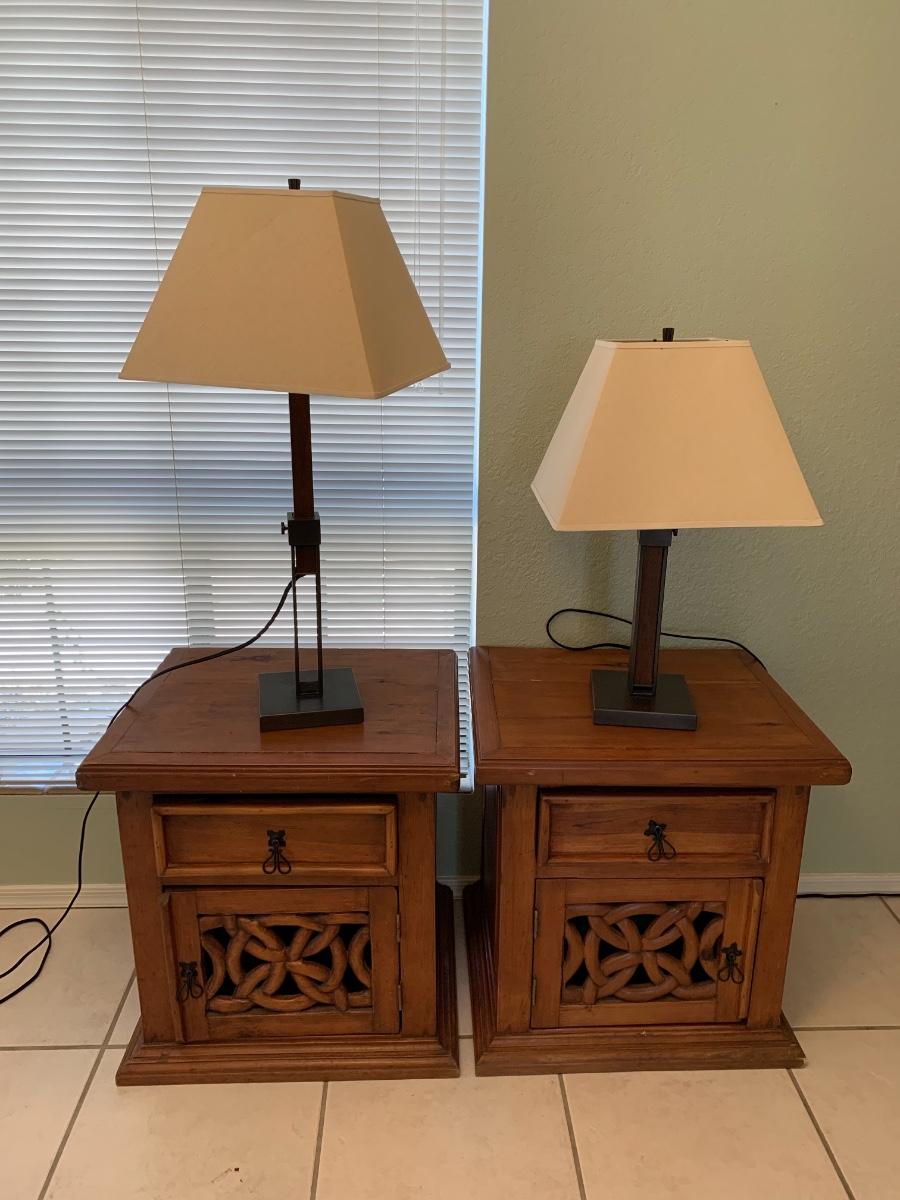 Includes a pair of wood night stands with drawer and cabinet and interlocking ring design that matches the King bed in lot 84. There IS some damage to the tables, namely separation of the wood on the tops. Right one in the photo has separation in the back as well. Lot also includes two adjustable height metal bedside table lamps with square shades. Lamps are in great condition and both work.