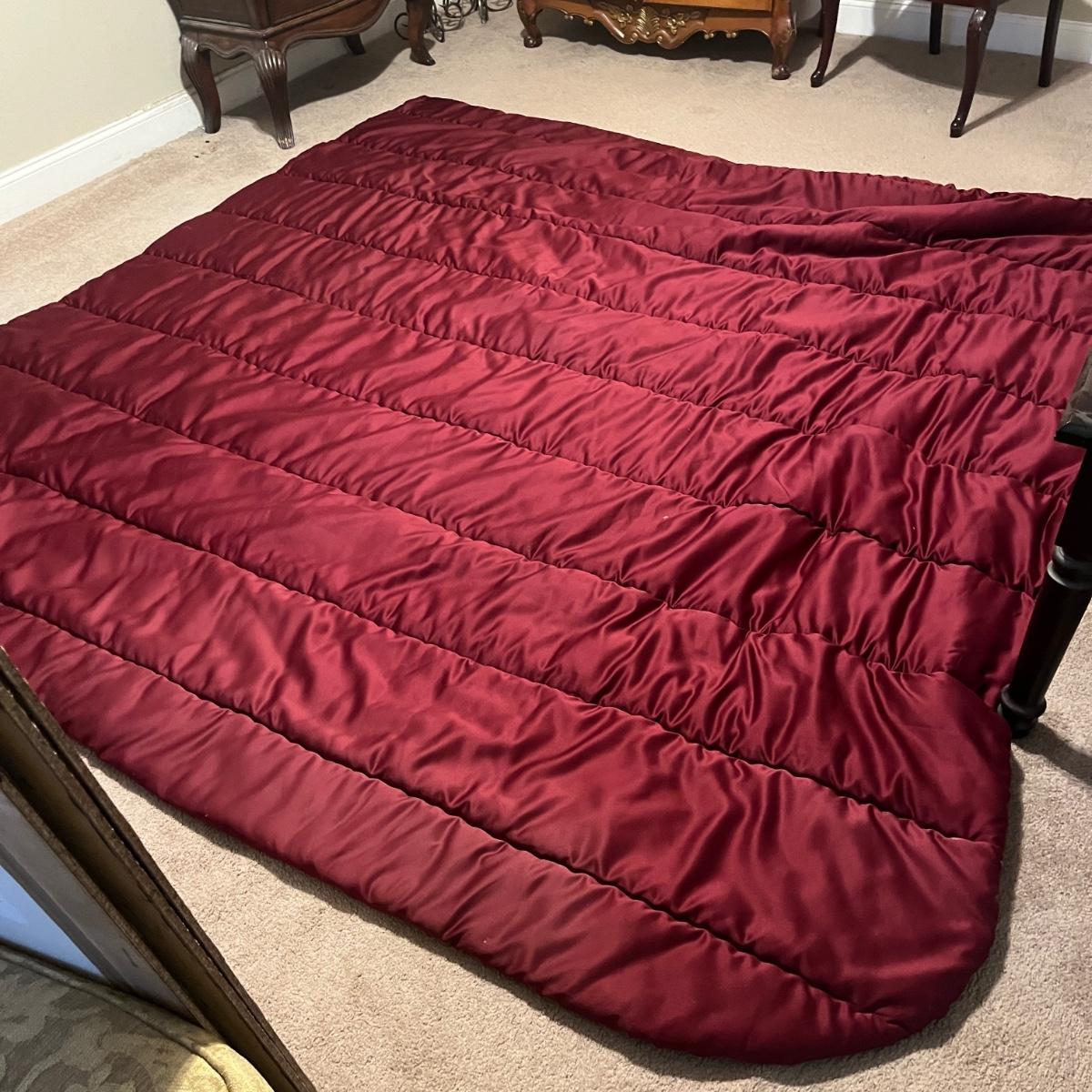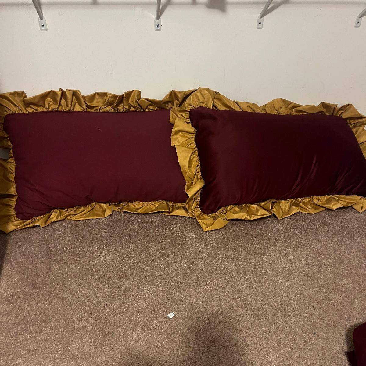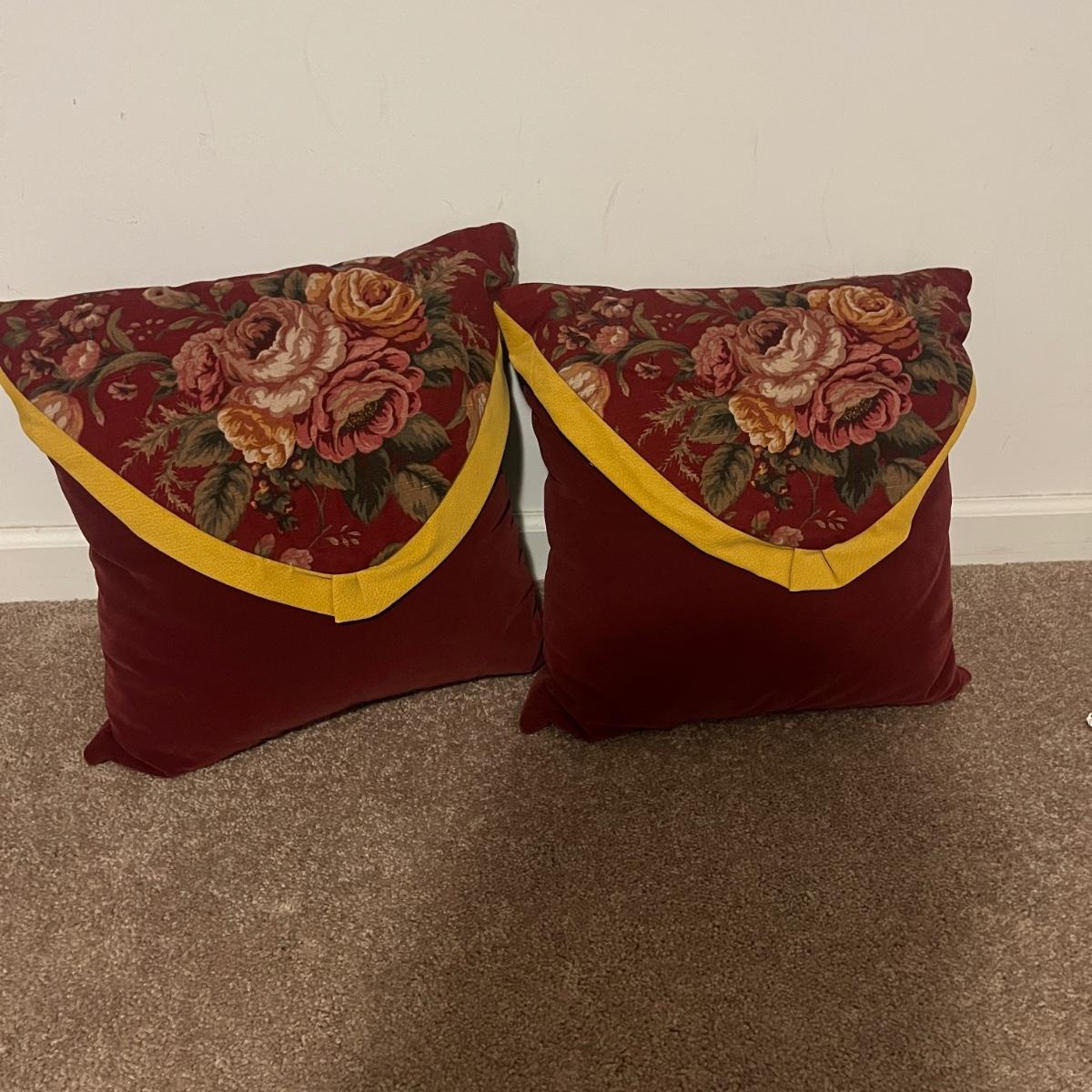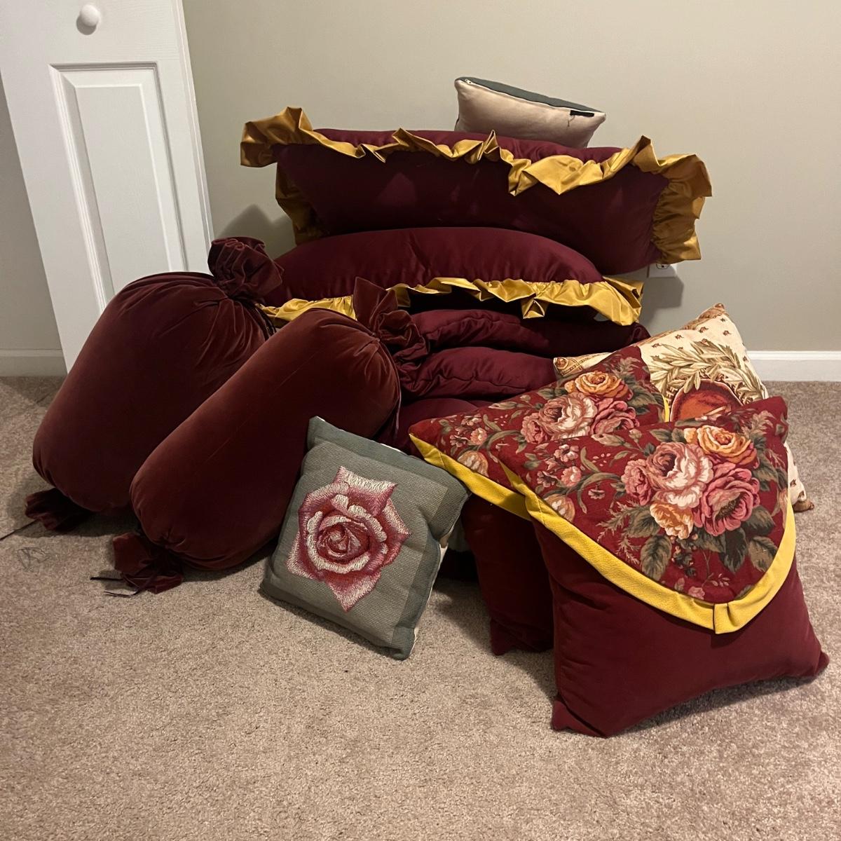 Lot includes a bedspread and matching pillow shams, four floral accent pillows, two maroon square pillows and two round pillows. Also includes NIB queen duvet cover. Bedspread measures 102” x 102” and largest accent pillows measure 18” x 18”.