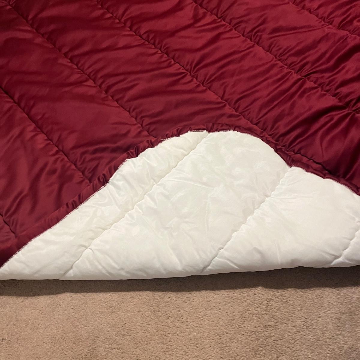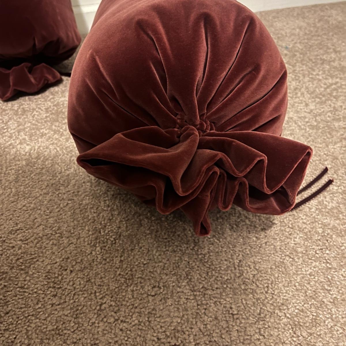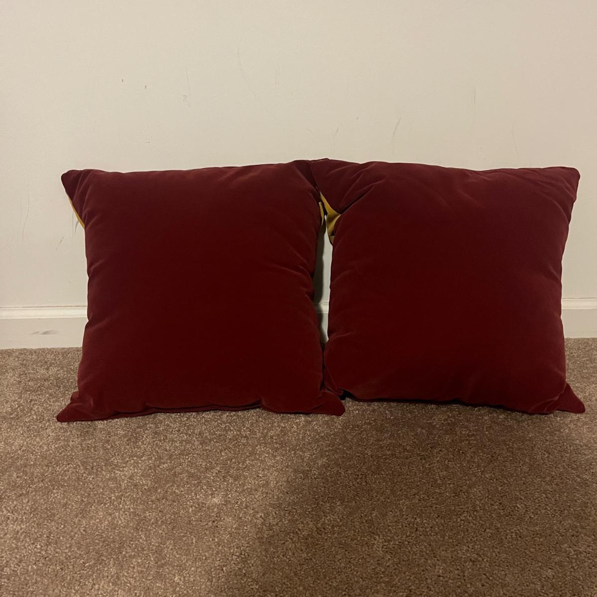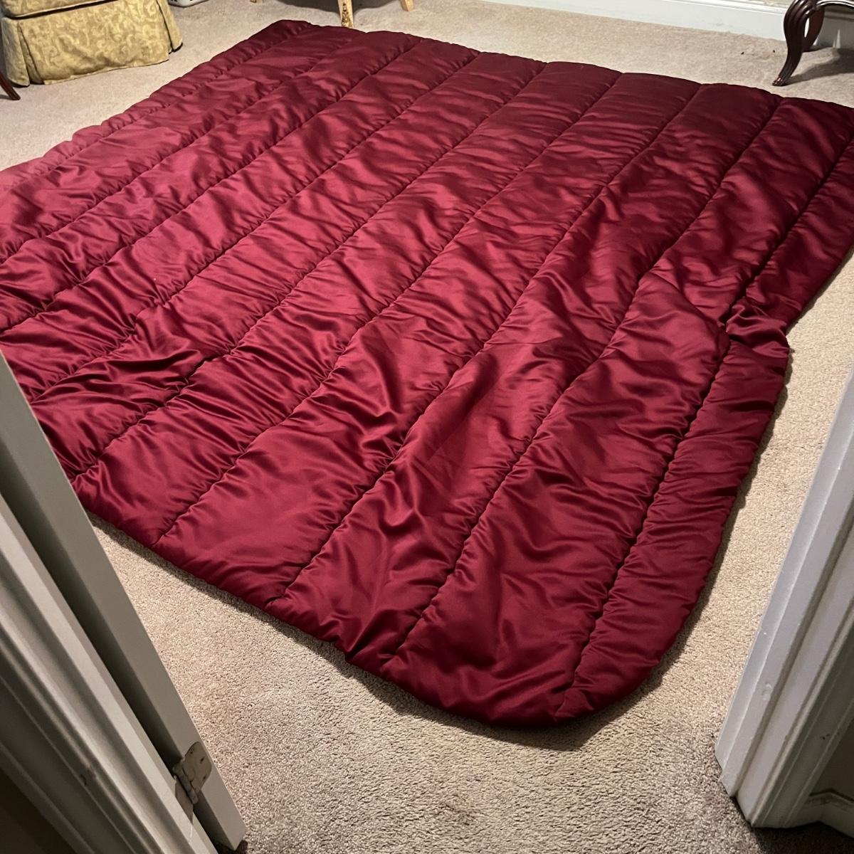 Lot includes a bedspread and matching pillow shams, four floral accent pillows, two maroon square pillows and two round pillows. Also includes NIB queen duvet cover. Bedspread measures 102” x 102” and largest accent pillows measure 18” x 18”.