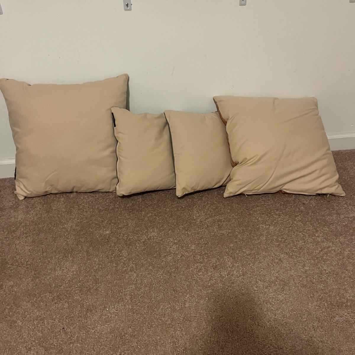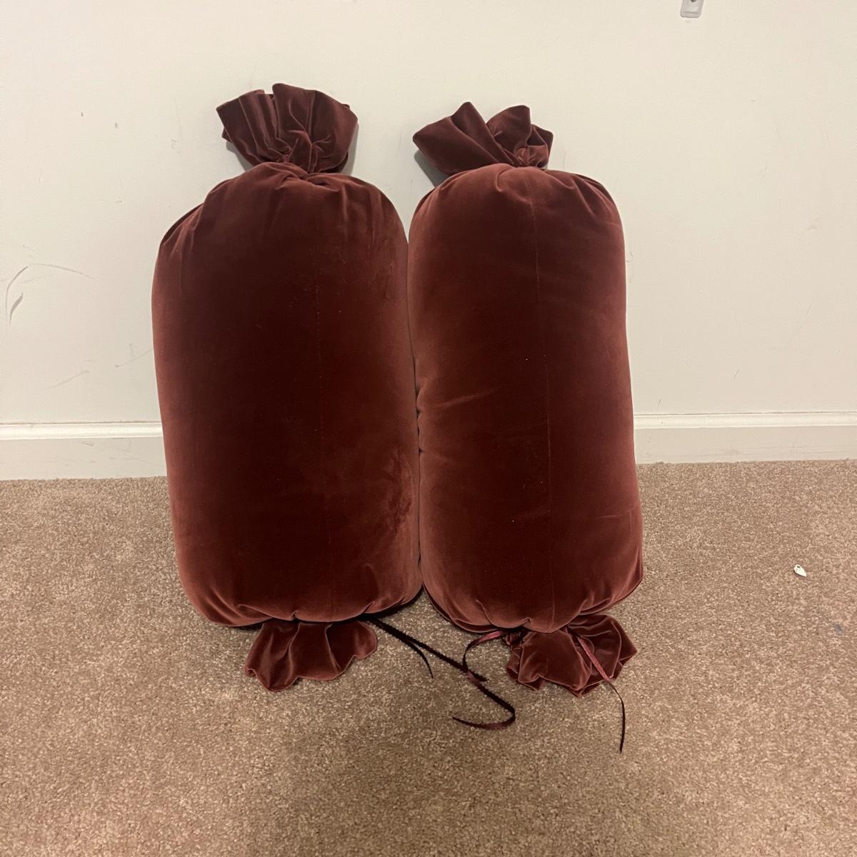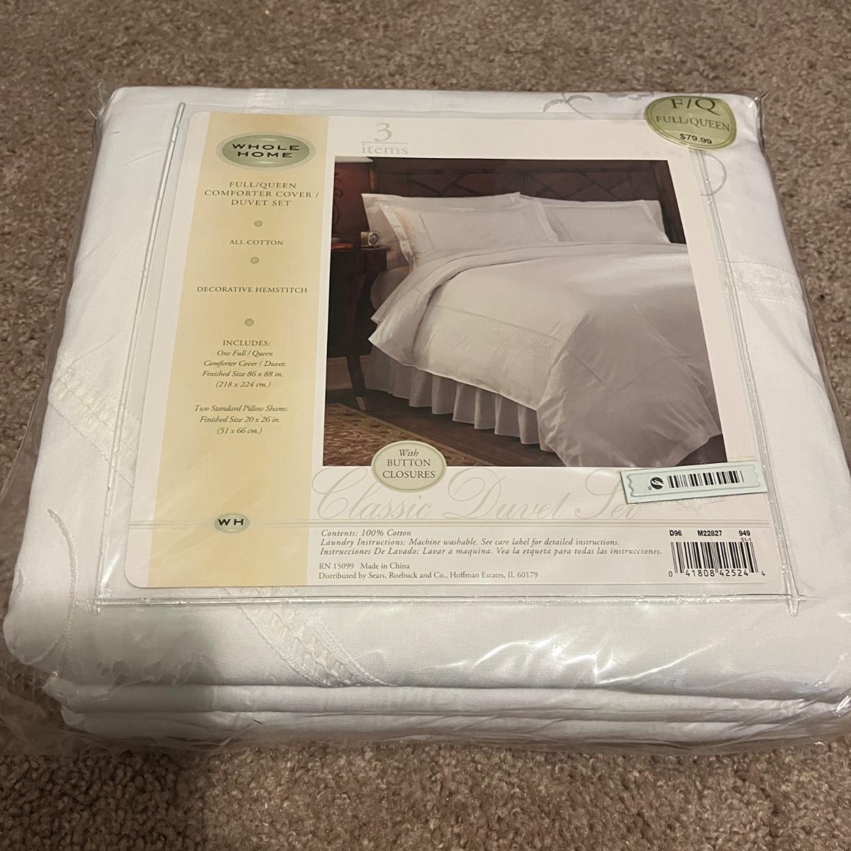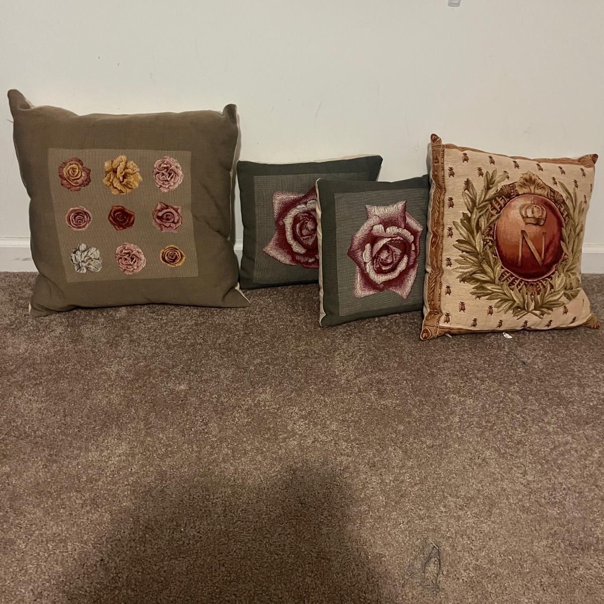 Lot includes a bedspread and matching pillow shams, four floral accent pillows, two maroon square pillows and two round pillows. Also includes NIB queen duvet cover. Bedspread measures 102” x 102” and largest accent pillows measure 18” x 18”.