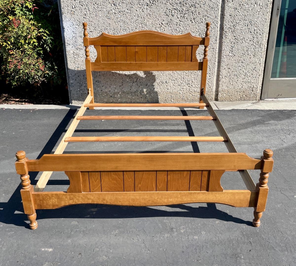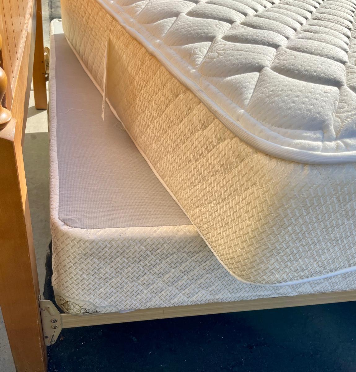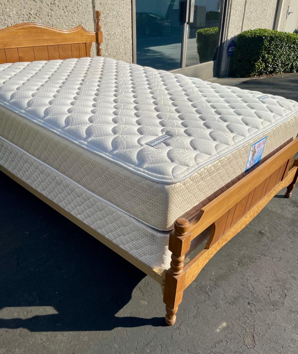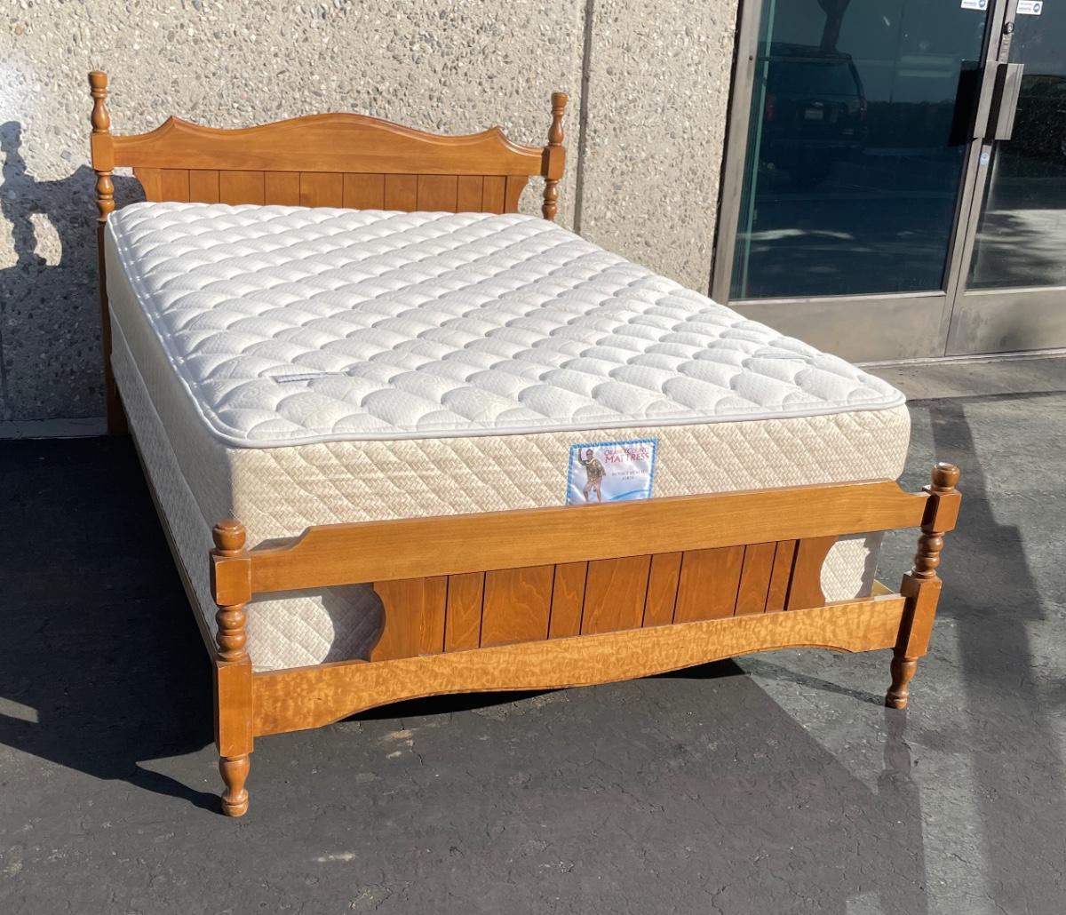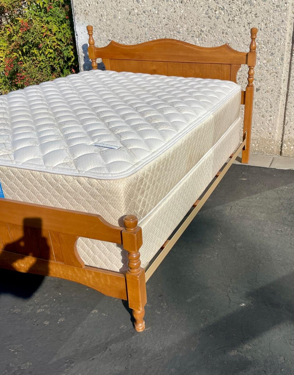 Vintage maple wooden bed frame with steel rails, also a near new condition full size box spring and mattress from Orange County Mattress. Labeled as a "Sunset Beach Firm", size is 53" x 74". No spots, stains or tears in the mattress or box spring set.