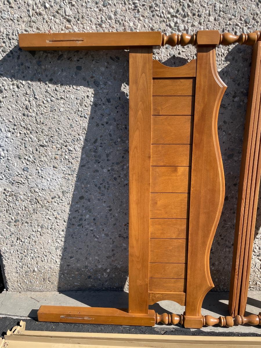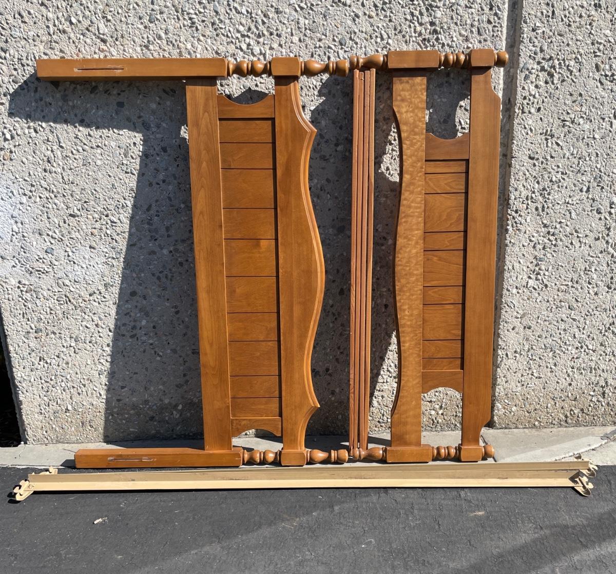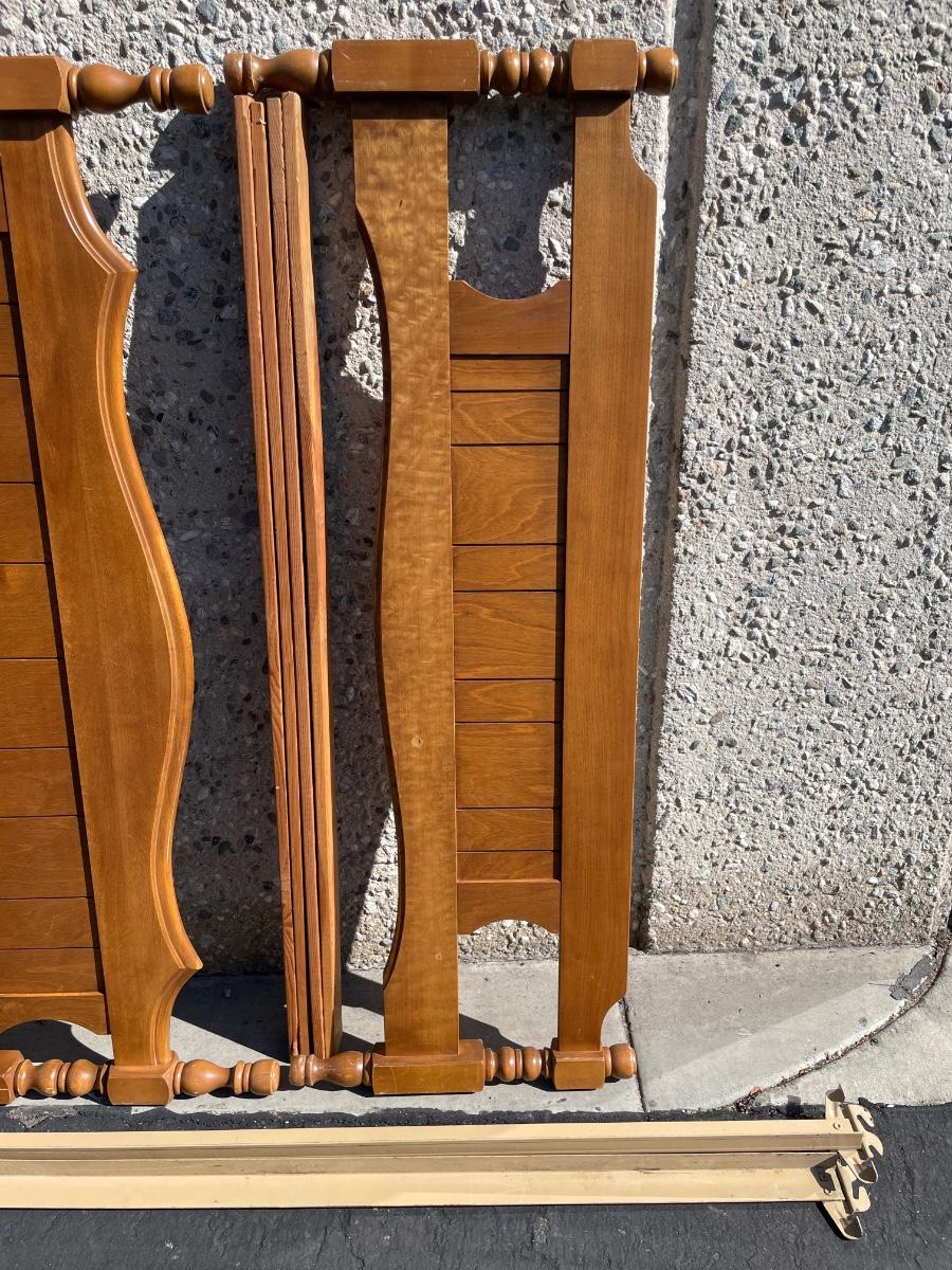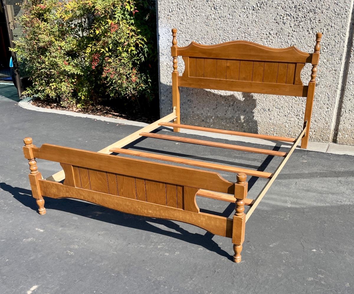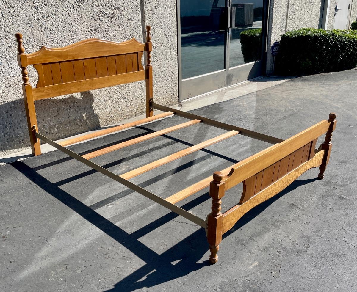 Vintage maple wooden bed frame with steel rails, also a near new condition full size box spring and mattress from Orange County Mattress. Labeled as a "Sunset Beach Firm", size is 53" x 74". No spots, stains or tears in the mattress or box spring set.