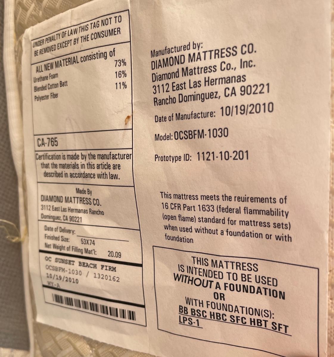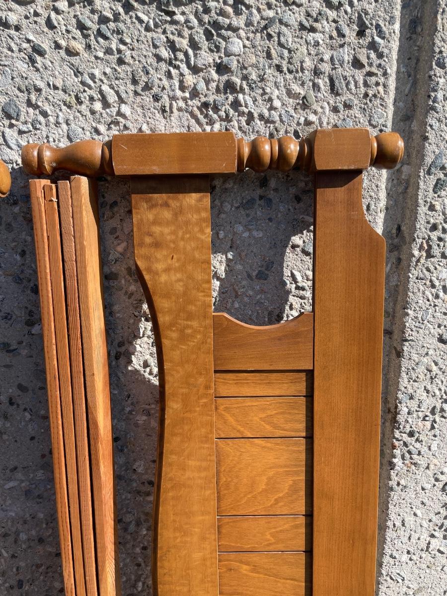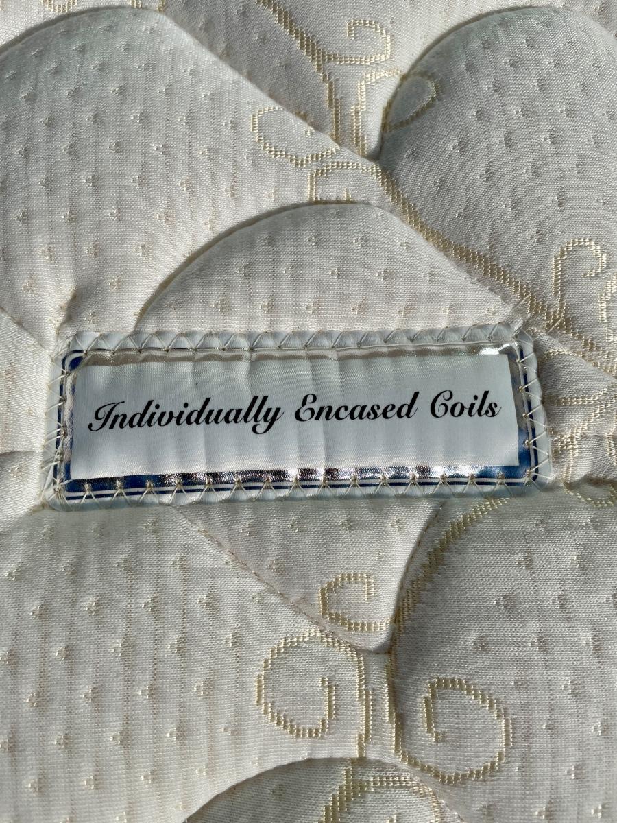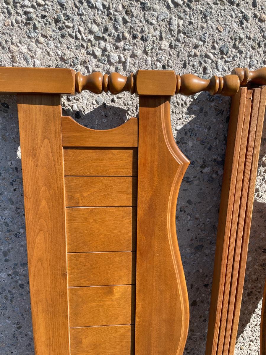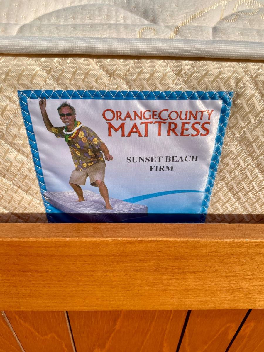 Vintage maple wooden bed frame with steel rails, also a near new condition full size box spring and mattress from Orange County Mattress. Labeled as a "Sunset Beach Firm", size is 53" x 74". No spots, stains or tears in the mattress or box spring set.