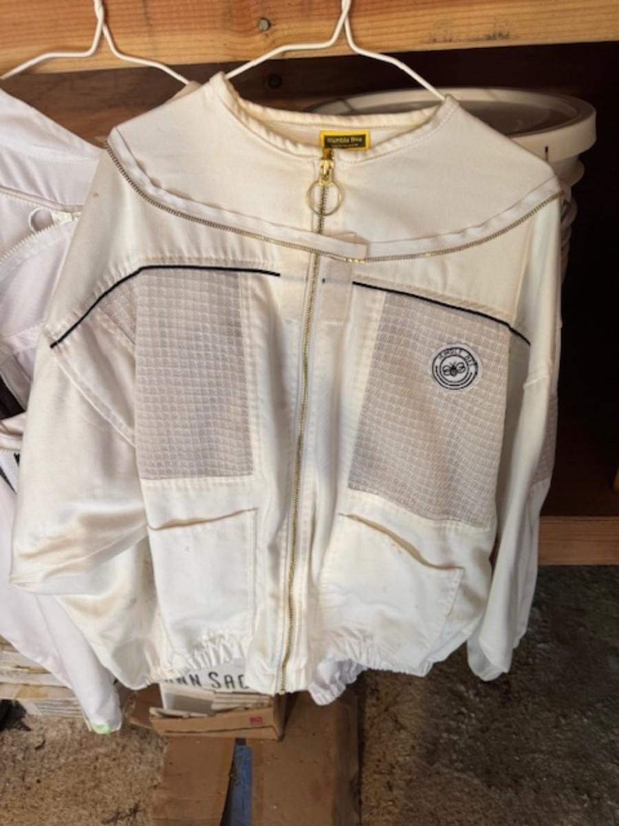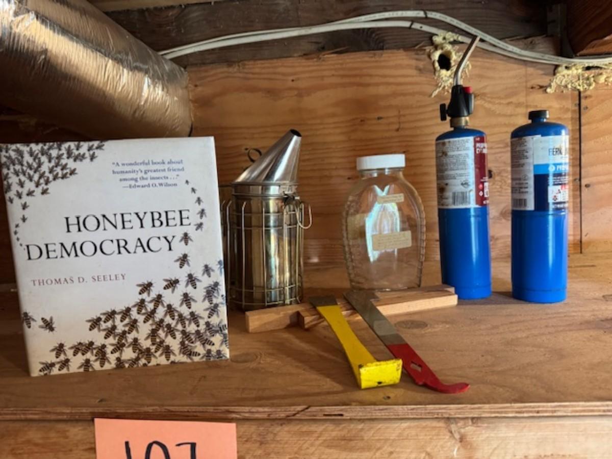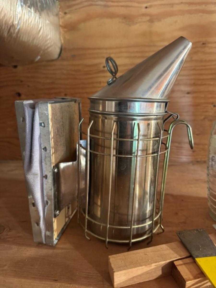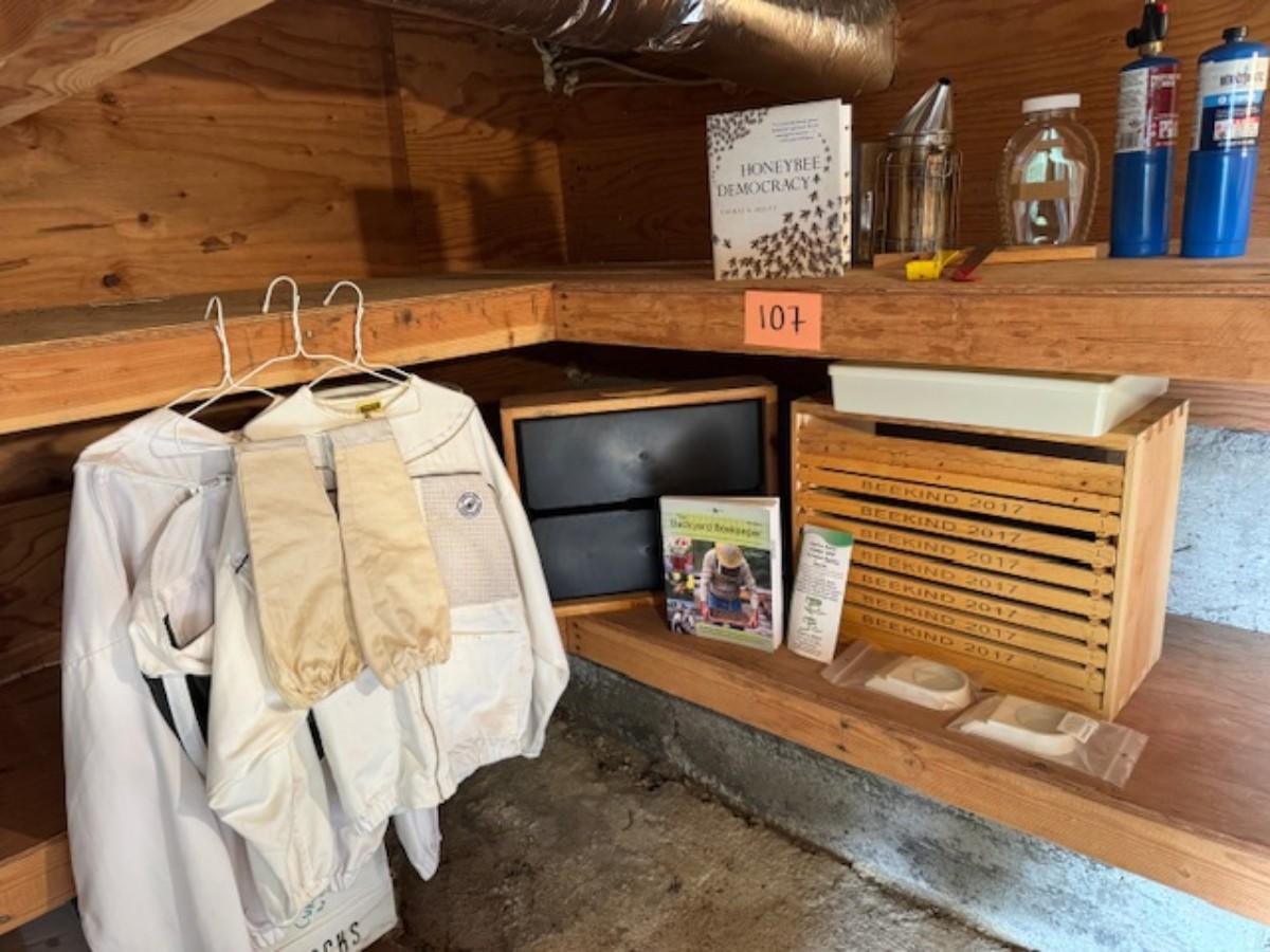 Smoker, tools, glass jar for honey, bee box, bee keeping shirts with hoods one from Humble bee and one pair of gloves. Clothing is as found with a few stains.