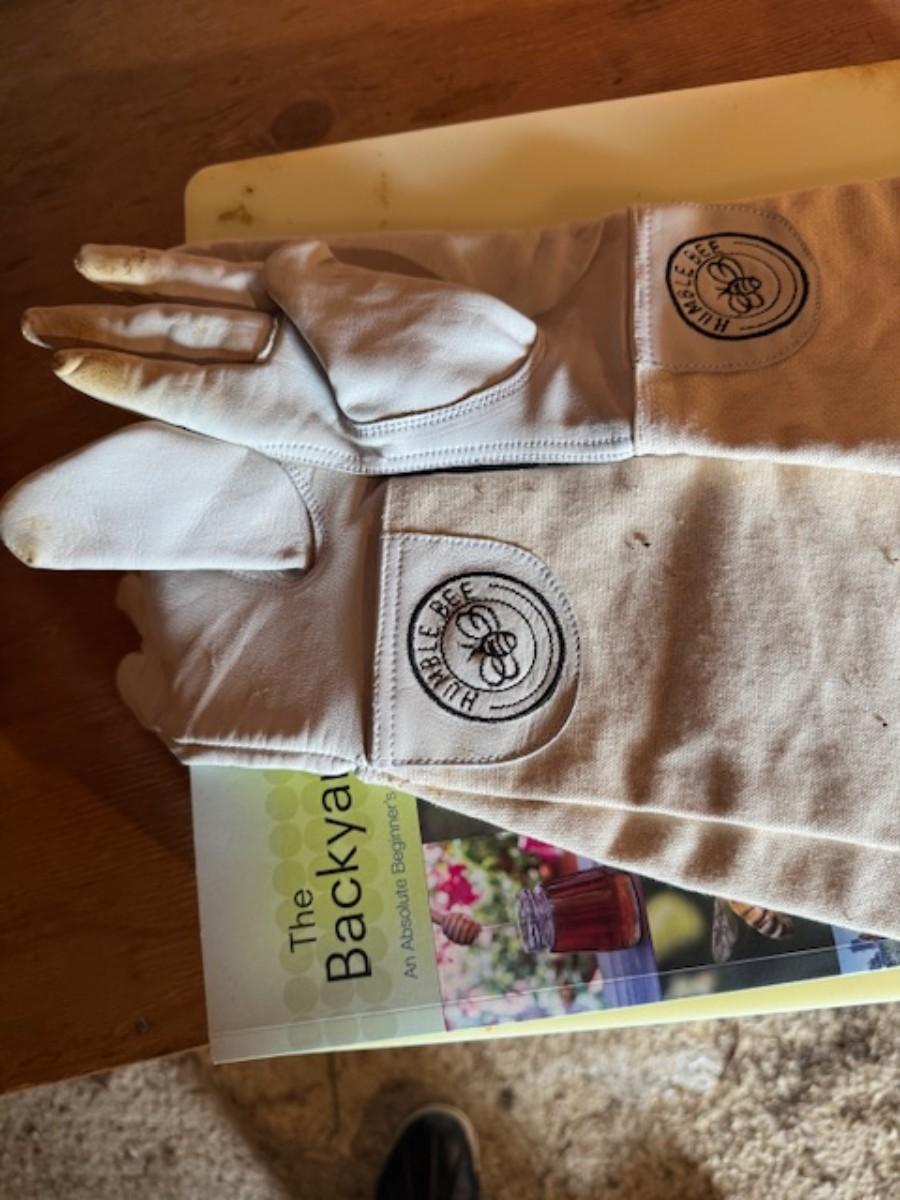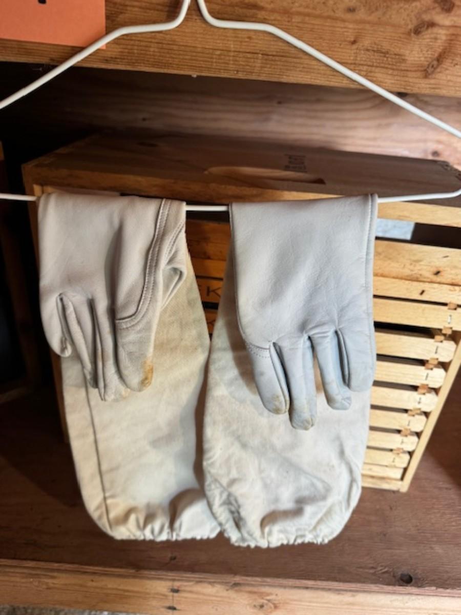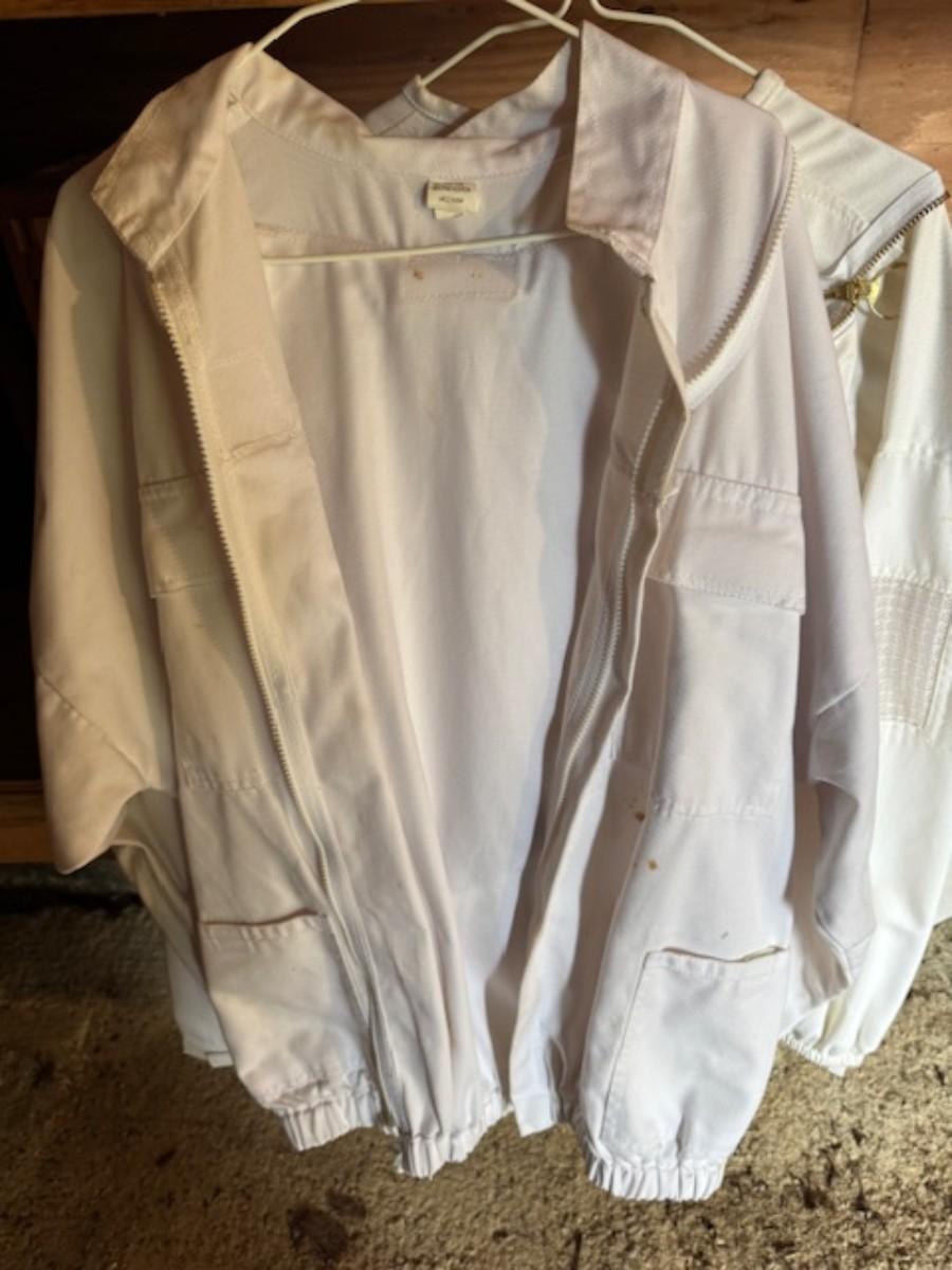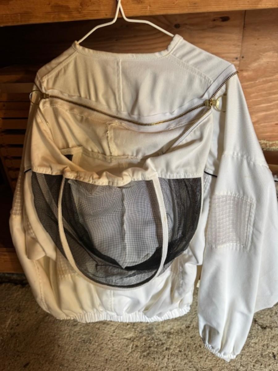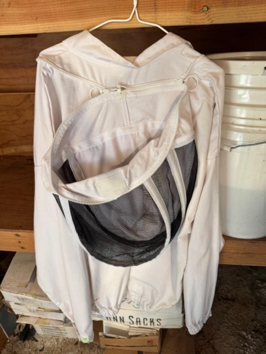 Smoker, tools, glass jar for honey, bee box, bee keeping shirts with hoods one from Humble bee and one pair of gloves. Clothing is as found with a few stains.