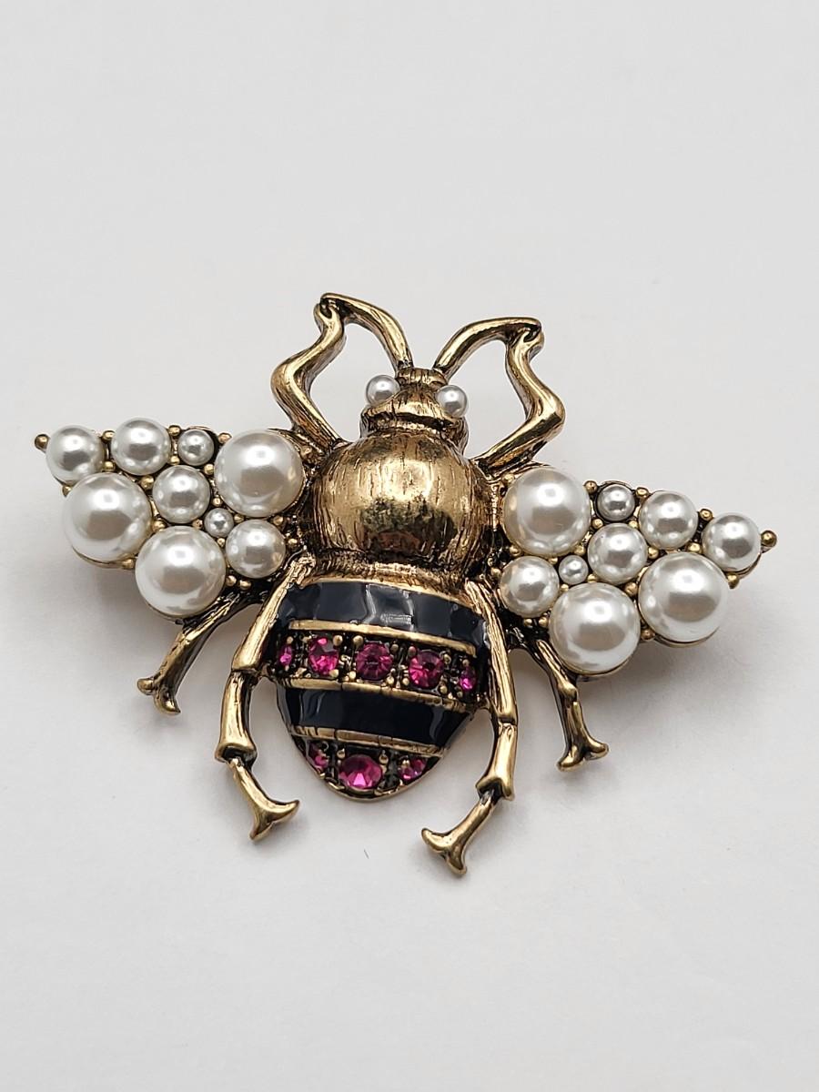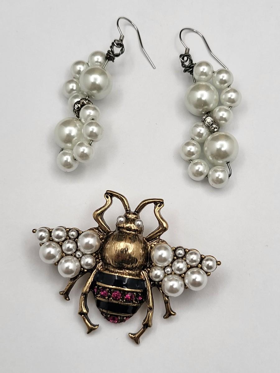 Bee pin features faux pearled wings and eyes and pink rhinestones & enameled body. Set in gold tone metal. Measures 2" x 1.5". Hand crafted faux pearl clusters with clear rhinestone accents pierced earrings, 1.5" long.