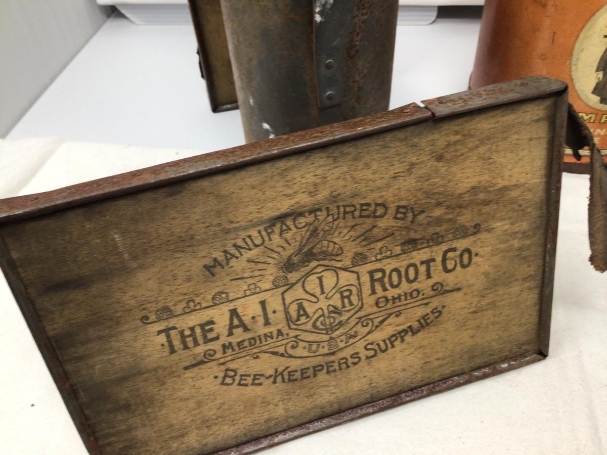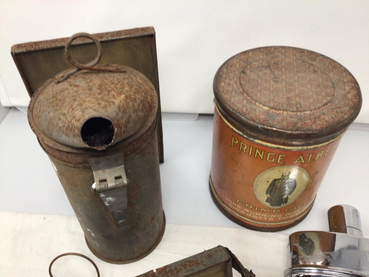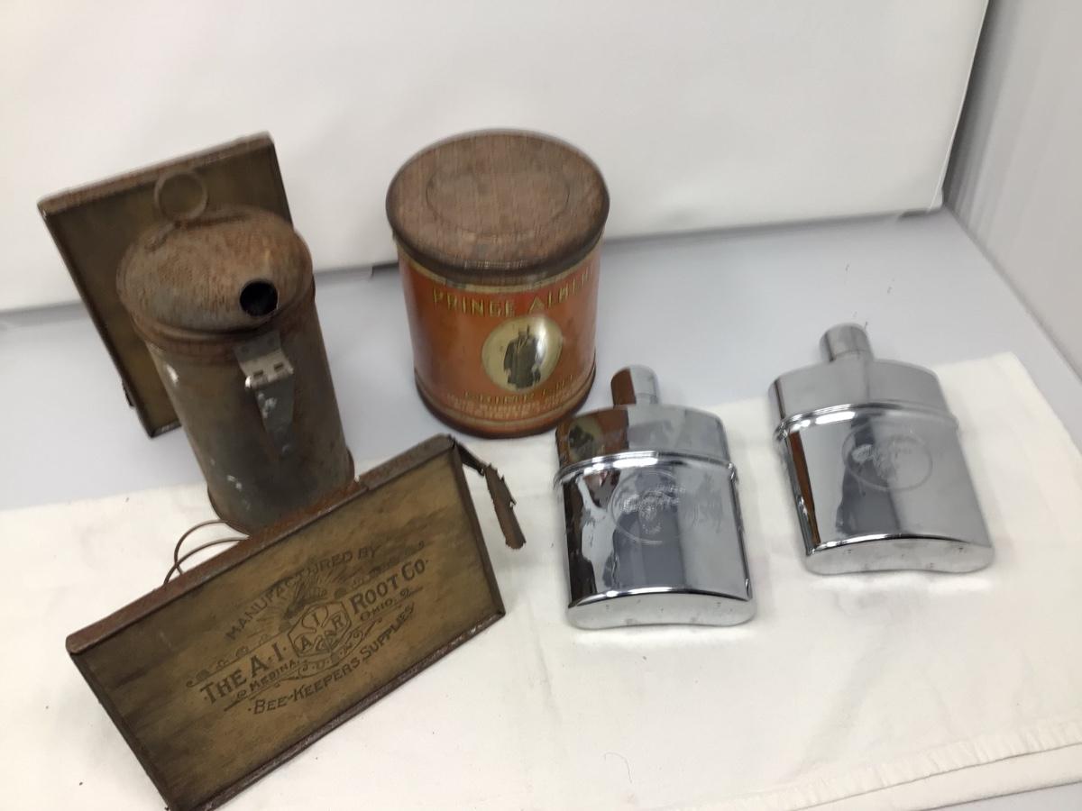 Bee Stoker, Two Metal and Glass Flasks, and Tobacco Tin
