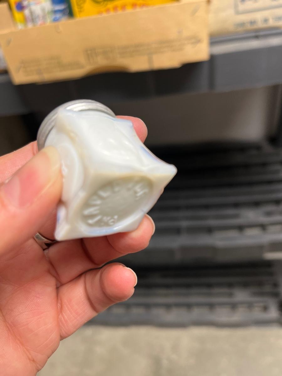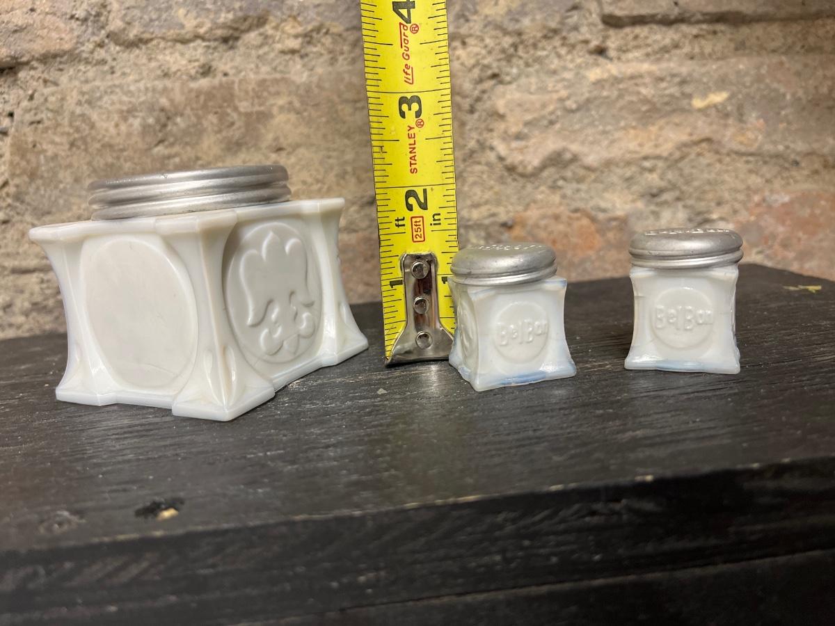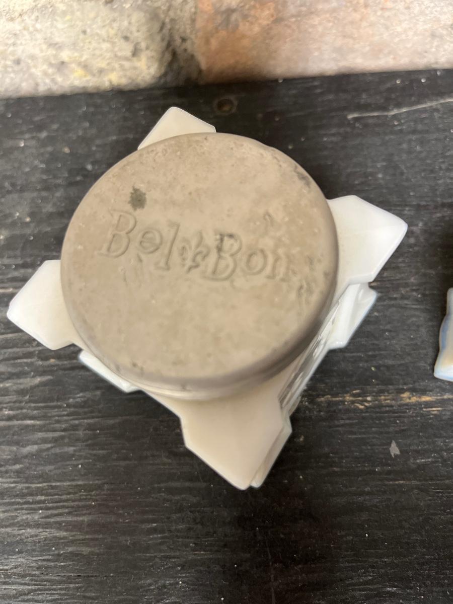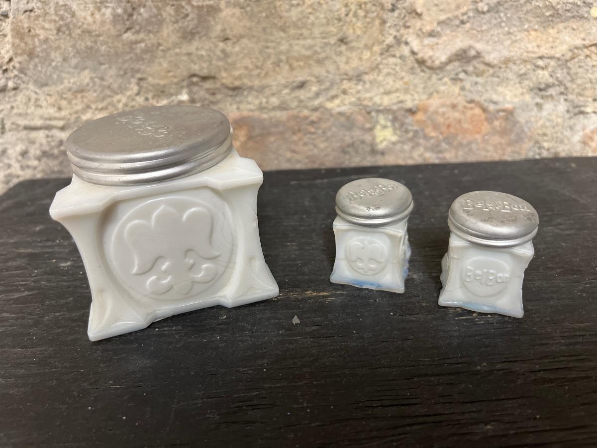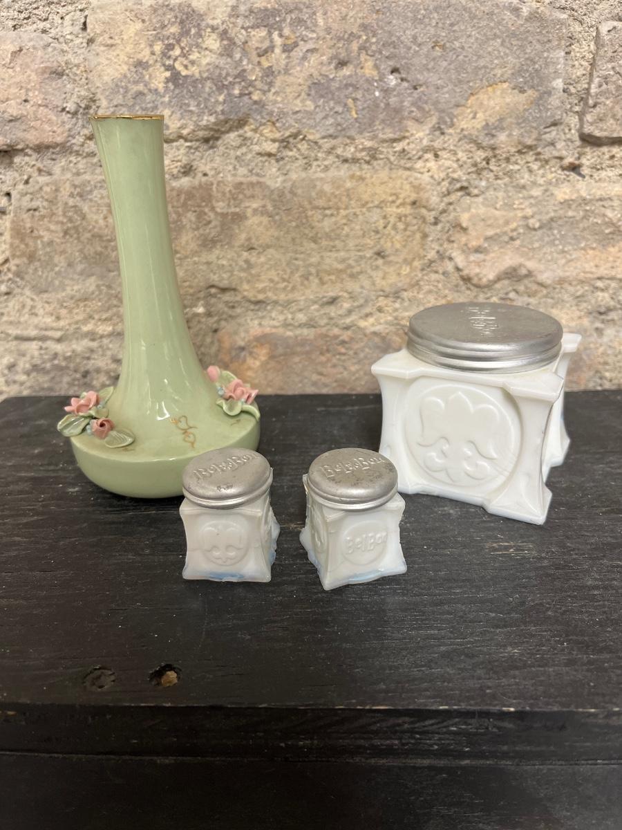 Beebe bud vase and antique Bel-Bon milk glass mini canisters