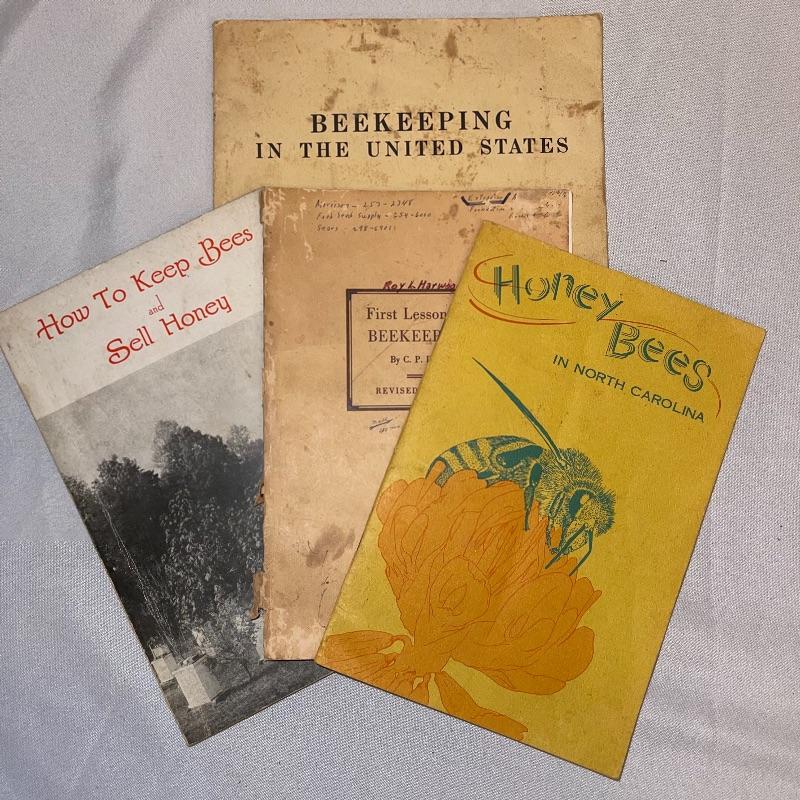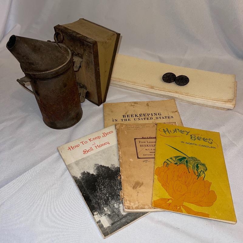 This lot includes beekeeping items such as bee comb foundation, books on beekeeping, and a smoker. Unsure of the age and functionality of the smoker and comb foundation. Great for beekeeper enthusiasts! Shipping available.
