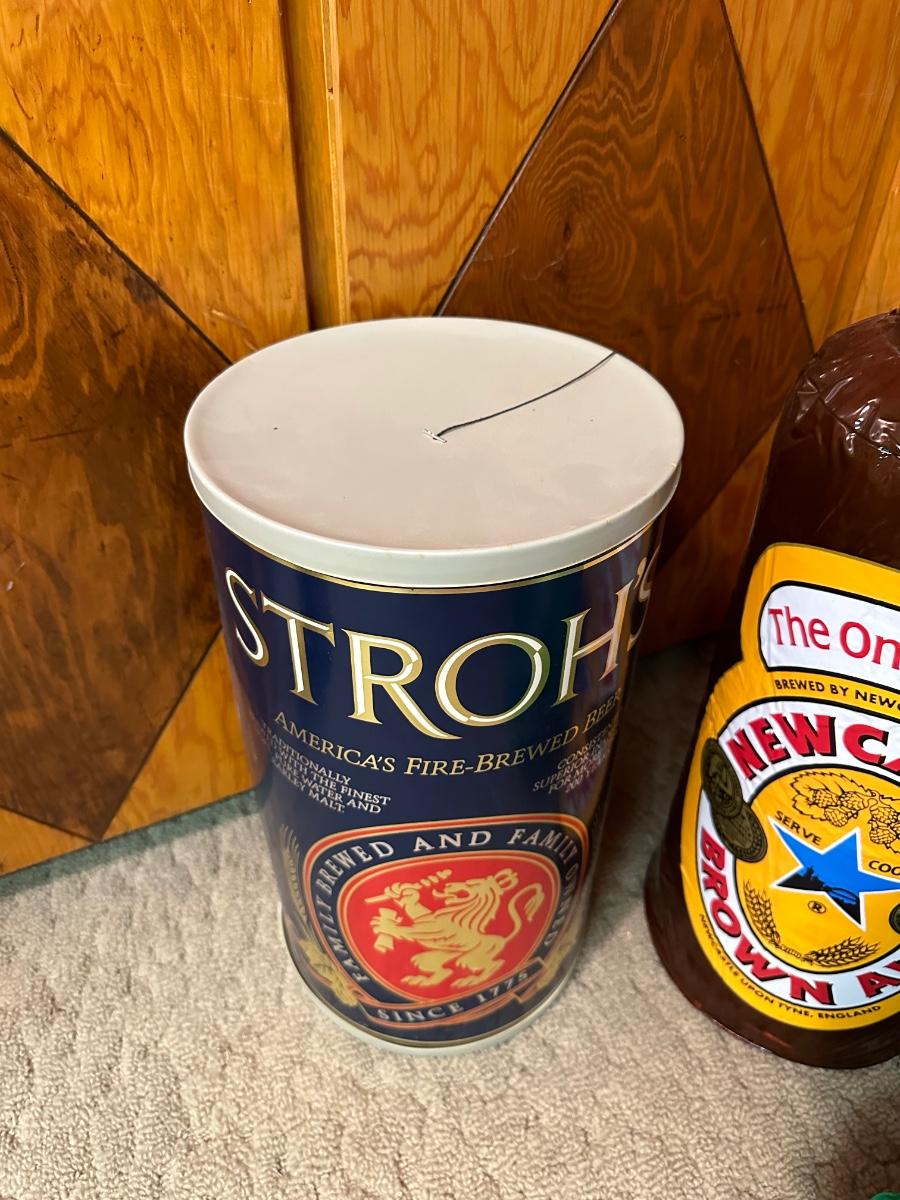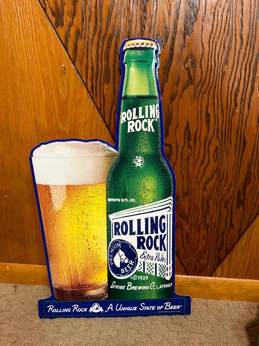 Rolling Rock tin sign measures 27” Tall.