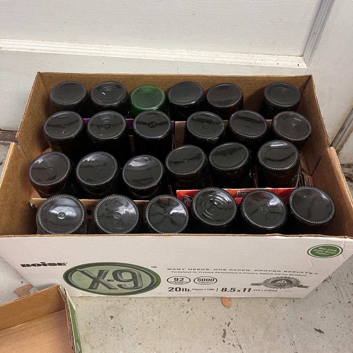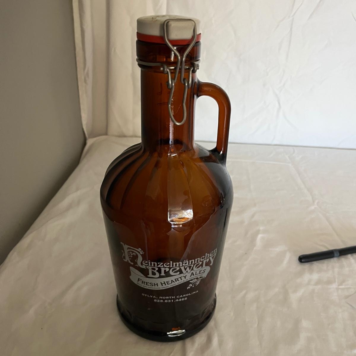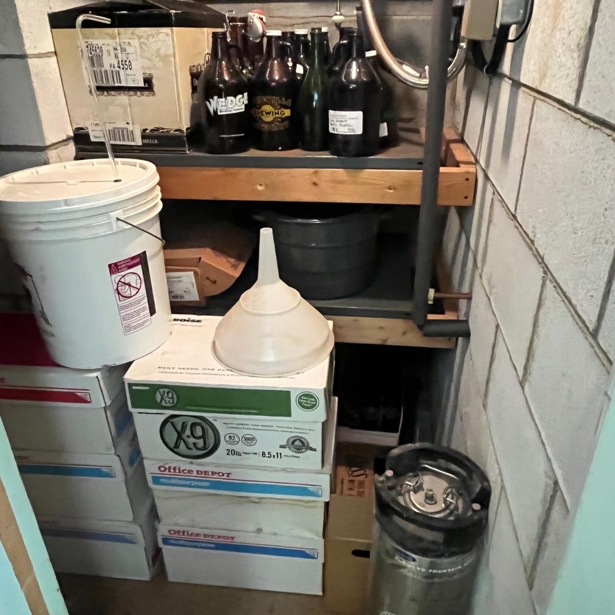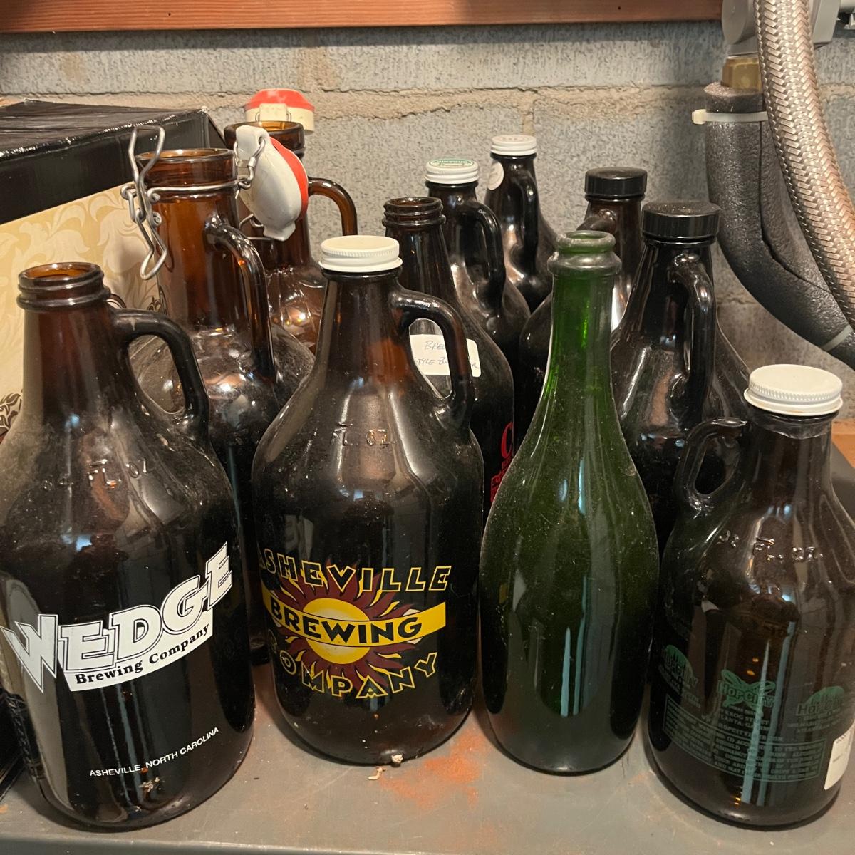 Lot contains a plethora of beer bottles and brewing gear that includes over 150 beer bottles, Corny keg, growlers, bottle caps and capper, brewing bucket and more. Largest growler measures 6”D x13”H.
