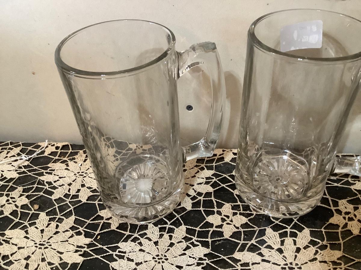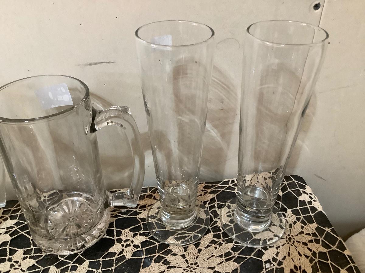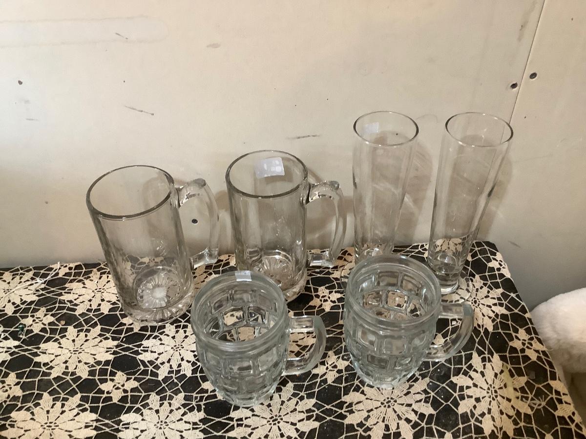 Two glass beer mugs, 2 Pilsner beer glasses, 2 beveled square beer mugs.