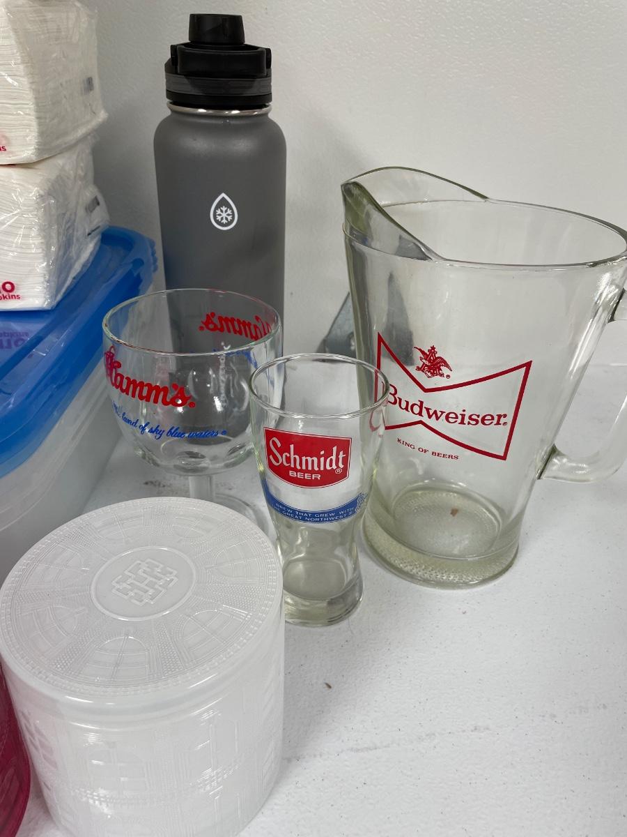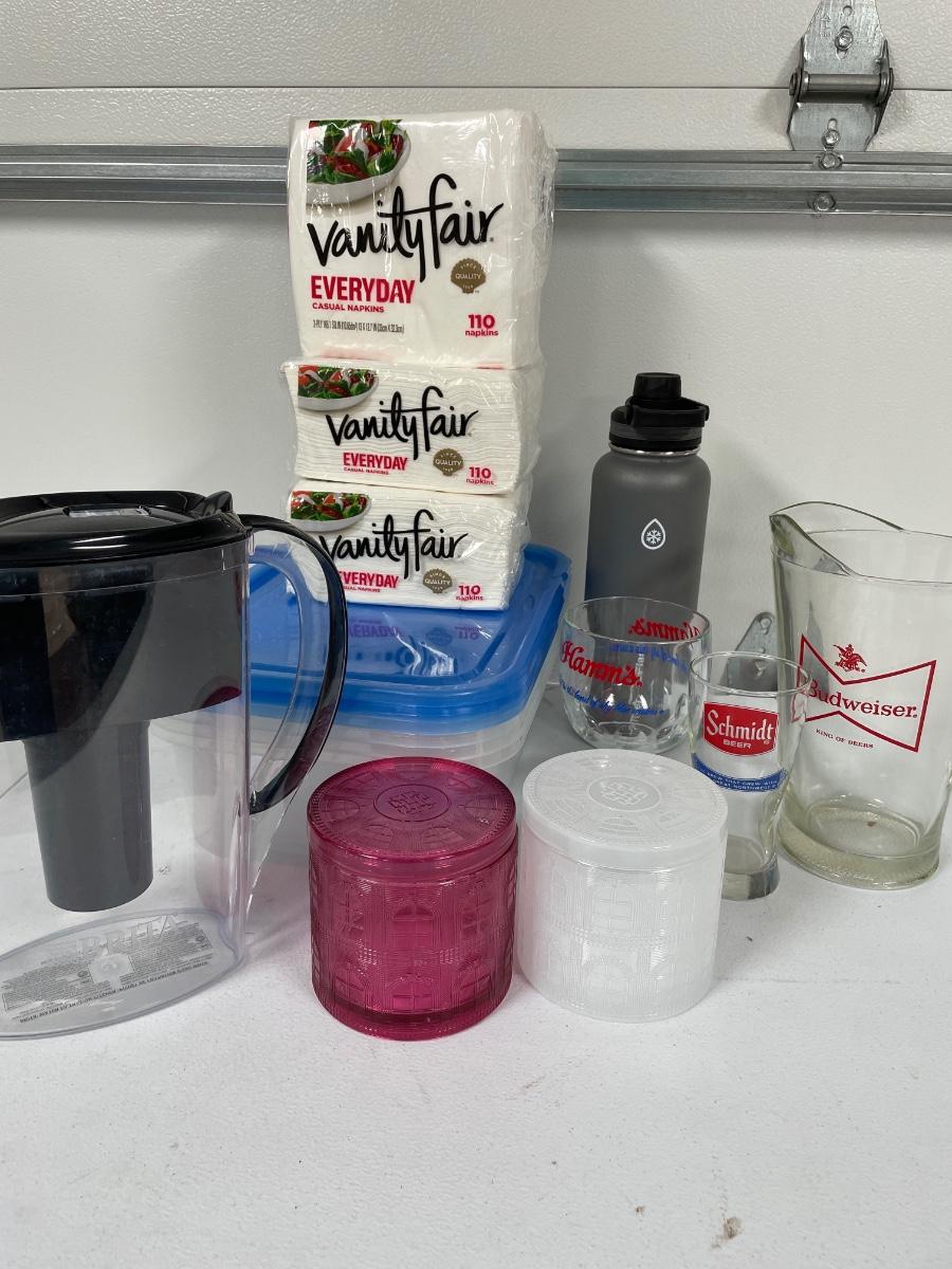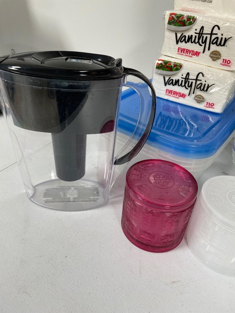 Brita pitcher, and glasses, plastic containers, napkins, Britta, water, pitcher, and more