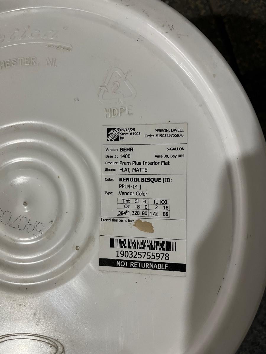 5 gallons of Behr interior flat paint and primer. Paint has been mixed for a beige color and the color code is indicated on the label. Brand new and never opened.
