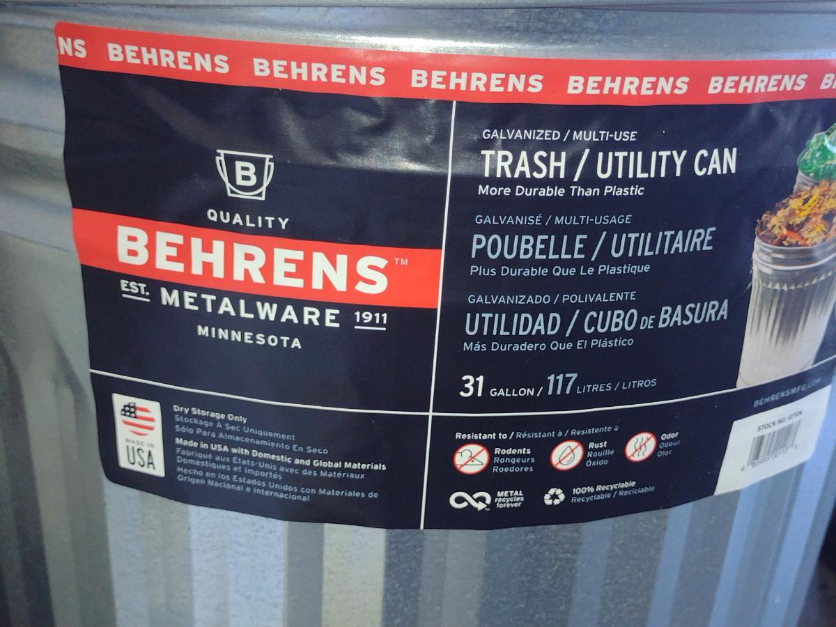Behrens Galvanized Metal Trash/Utility Can with Lid- 31 Gallon Size