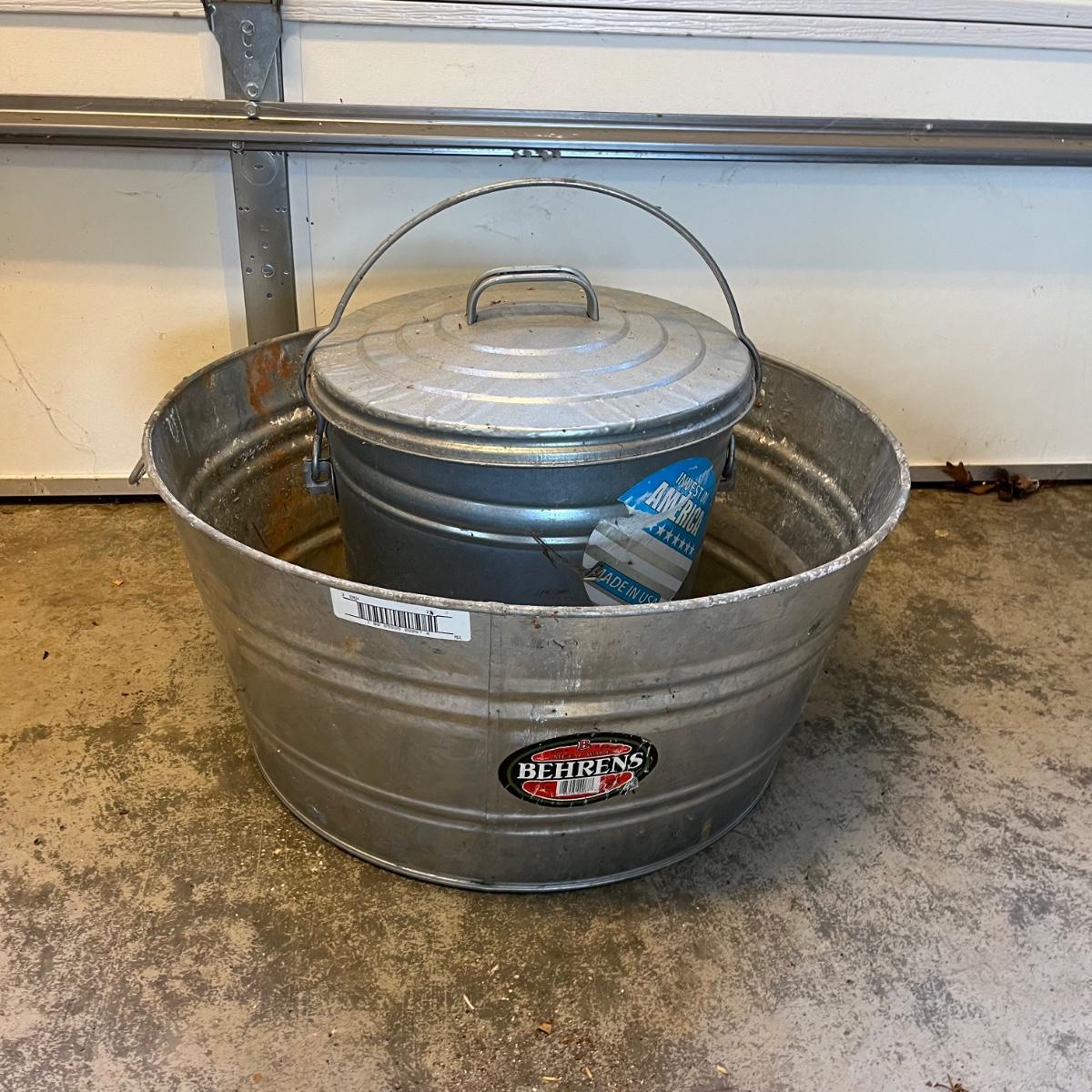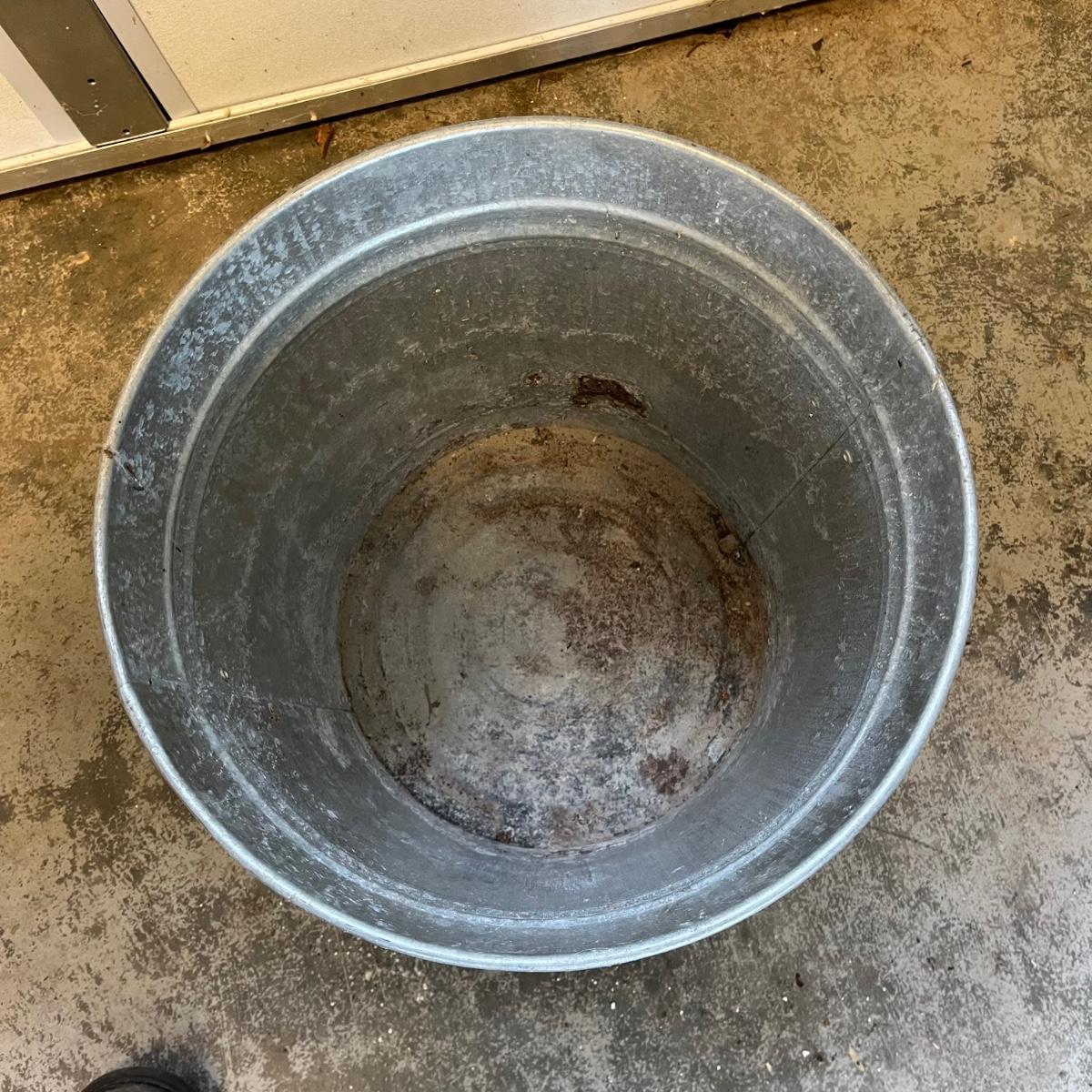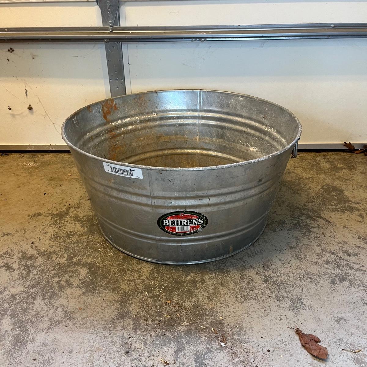 Lot includes a Behrens galvanized Round tub and a Behrens six gallon galvanized garbage pail. Tub measures 23”D x 11” tall.
