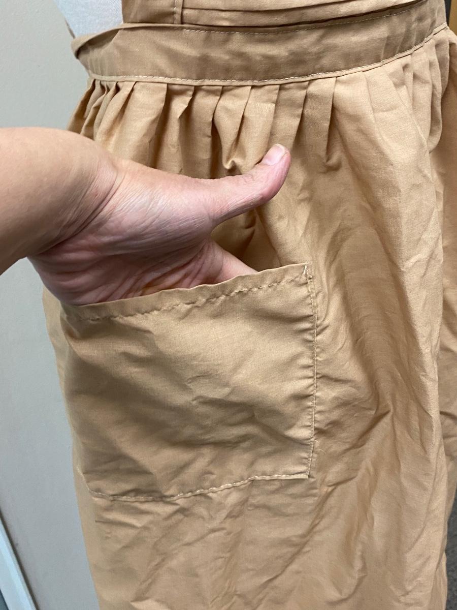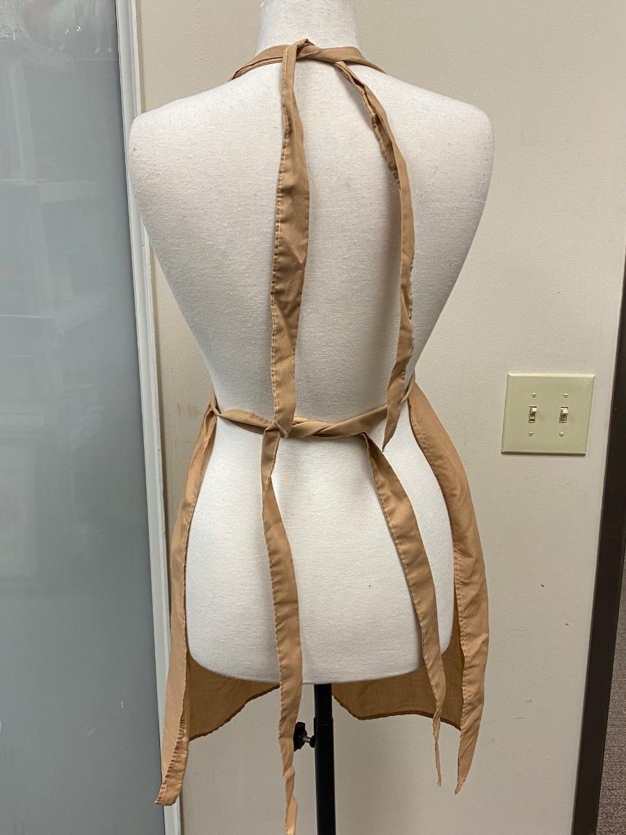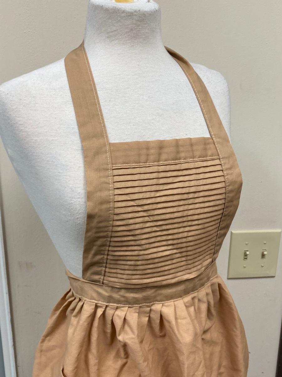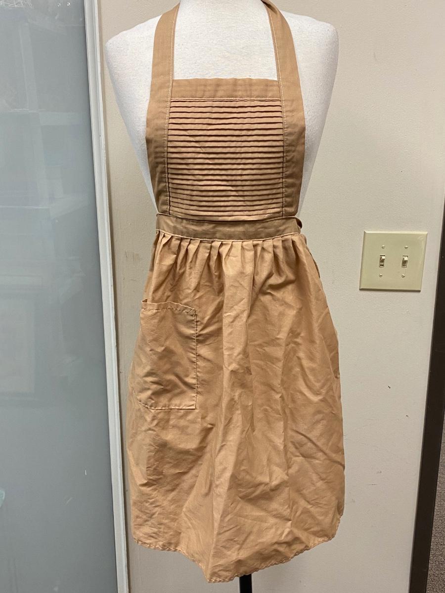 Beige full apron. Pleated across the chest. Ties around the neck and waist, single pocket. Good condition, small medium fit.