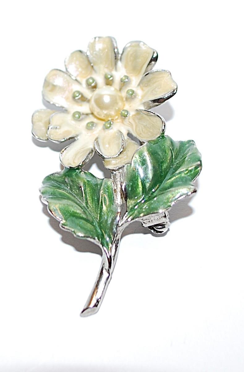 Beige FLOWER BROOCH (2" x 1") with Center Faux Pearl and Green Leaves on a Silver Tone Setting