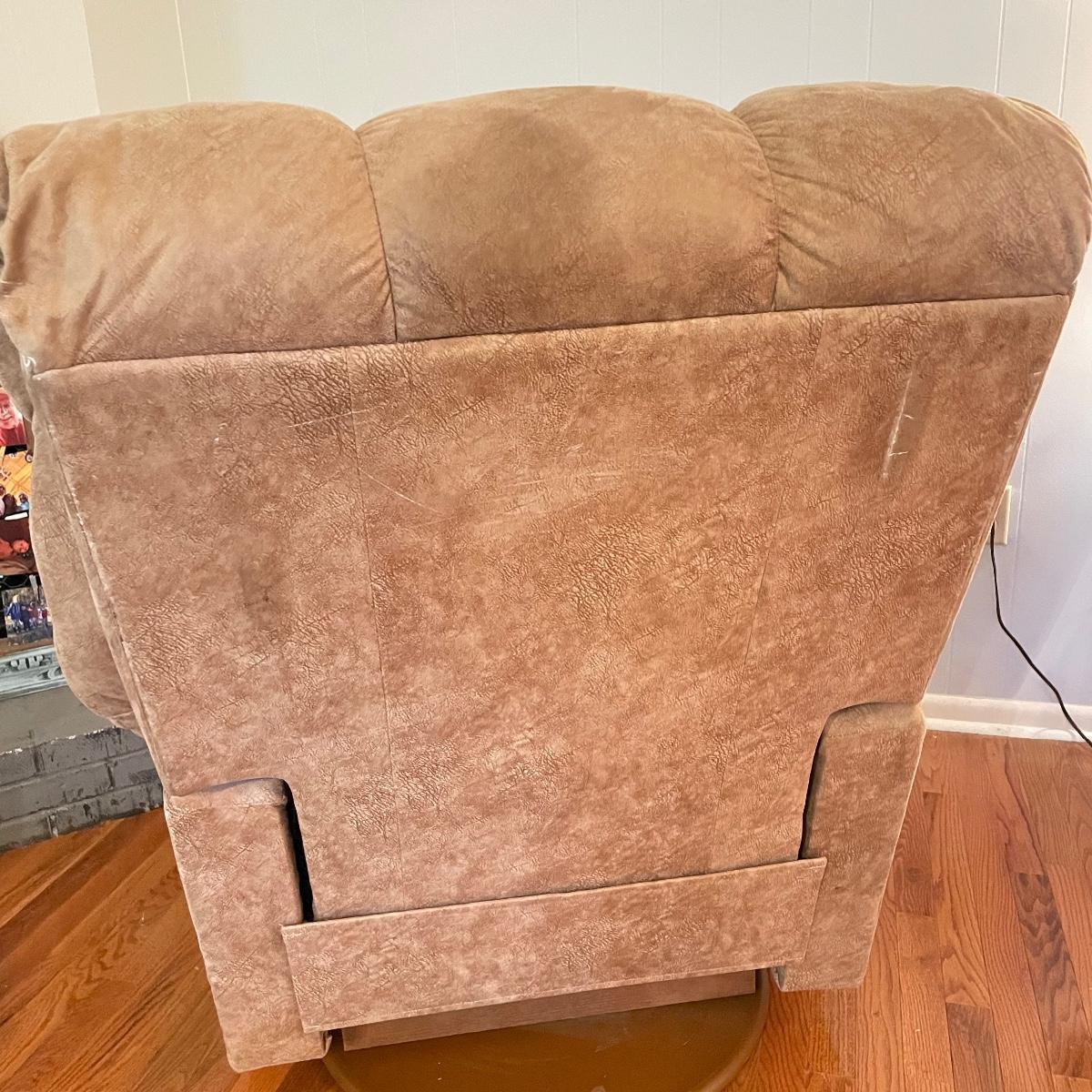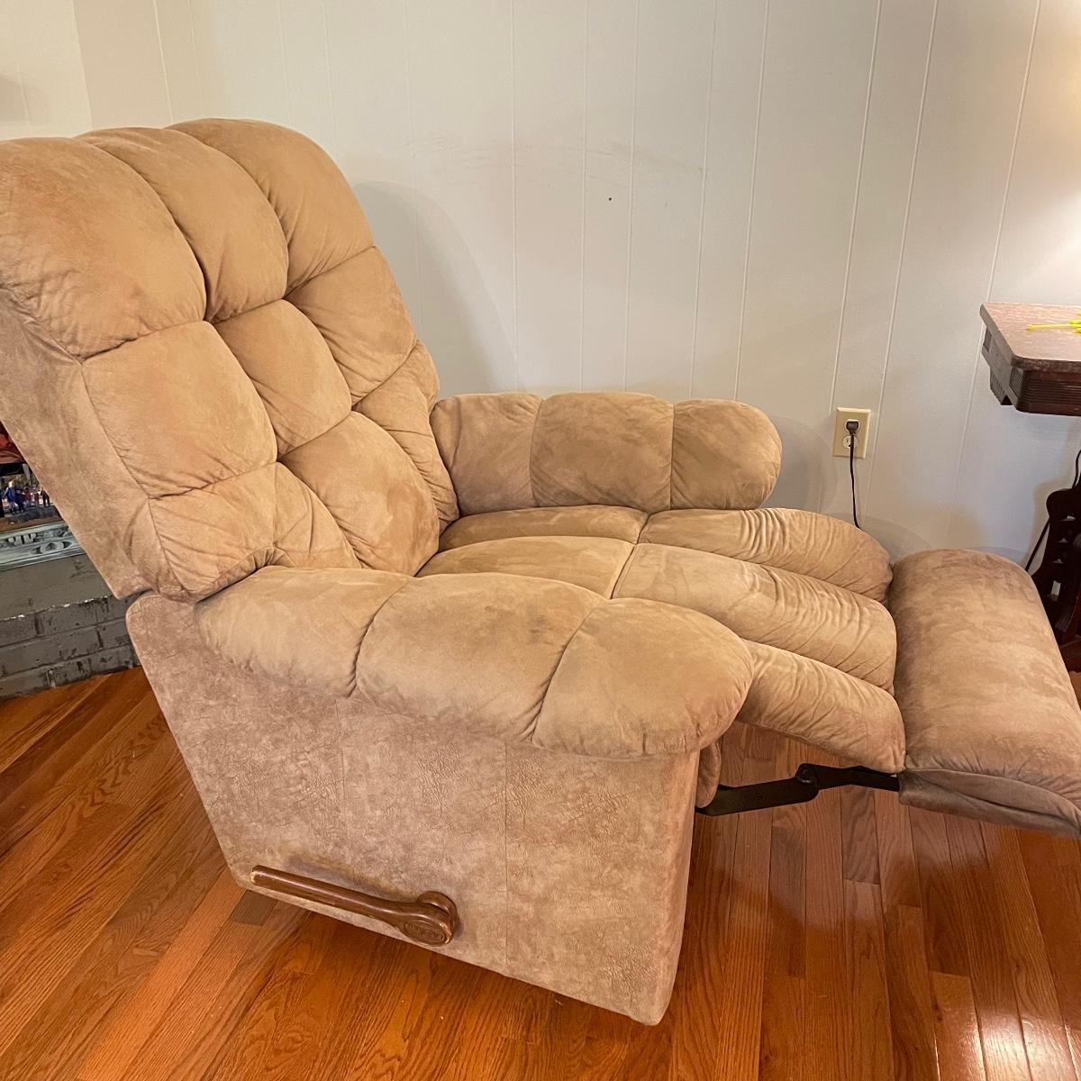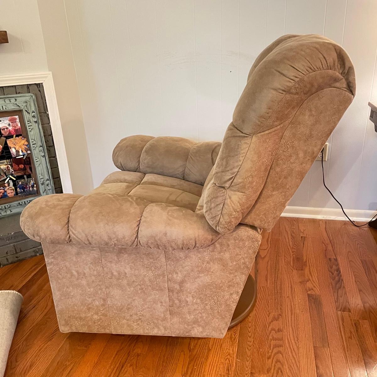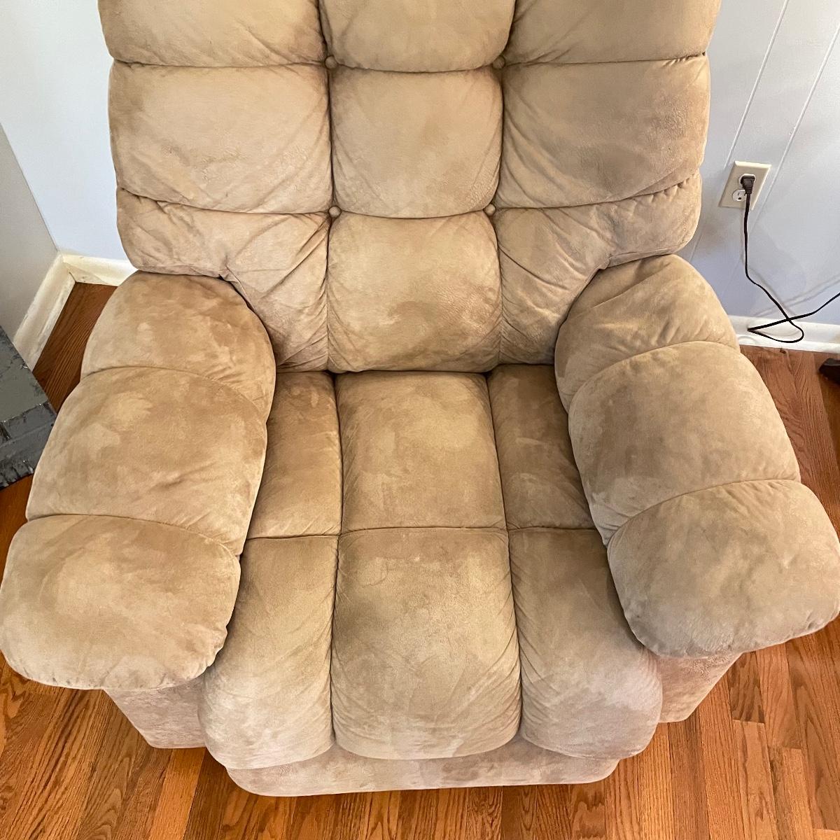 Comfortable beige LaZboy recliner with a swivel base. The soft upholstery appears to be a suede-like microfiber. Recliner has a hardly noticeable water ring on the seat and what appears to be paint rubbed on the back seat from motion. Chair reclines and swivels easily. LaZboy measures approximately 40” x 36” x 42” with a seat height at 19”. See images. Local pick up only. Please bring help to load.