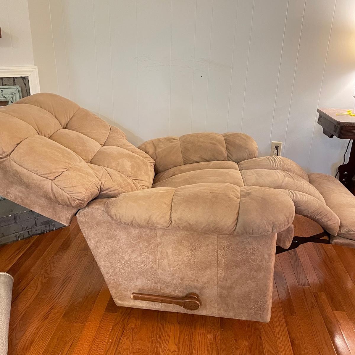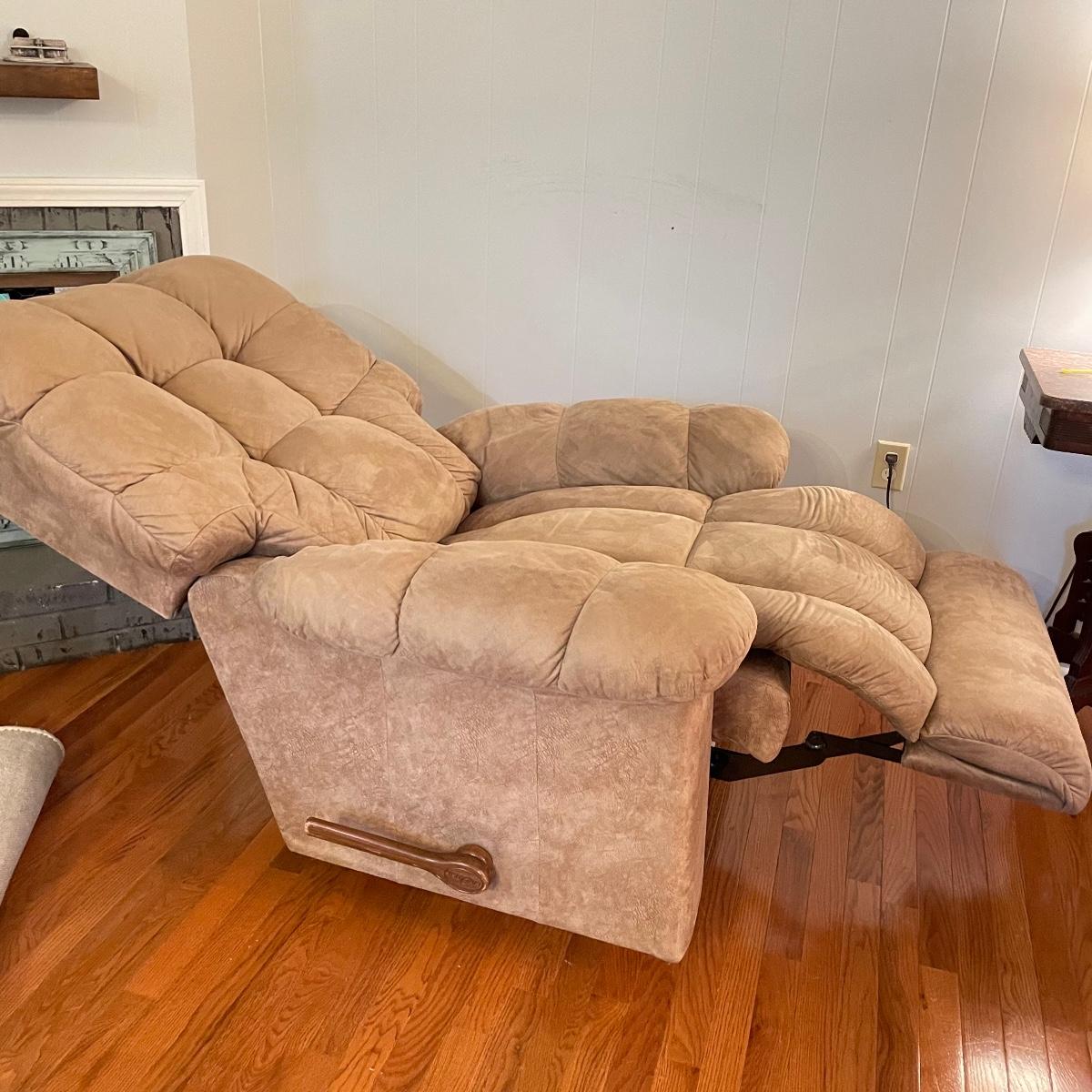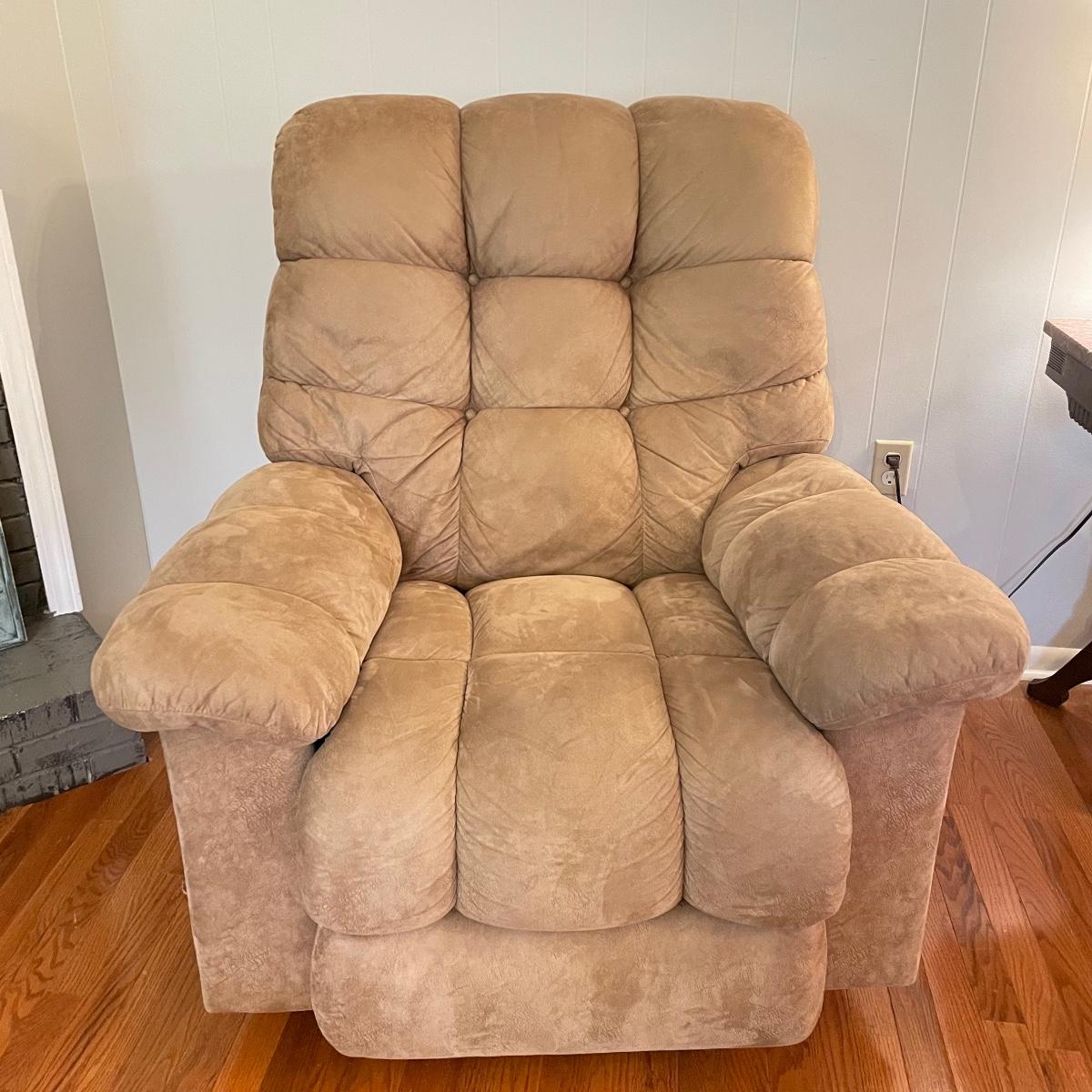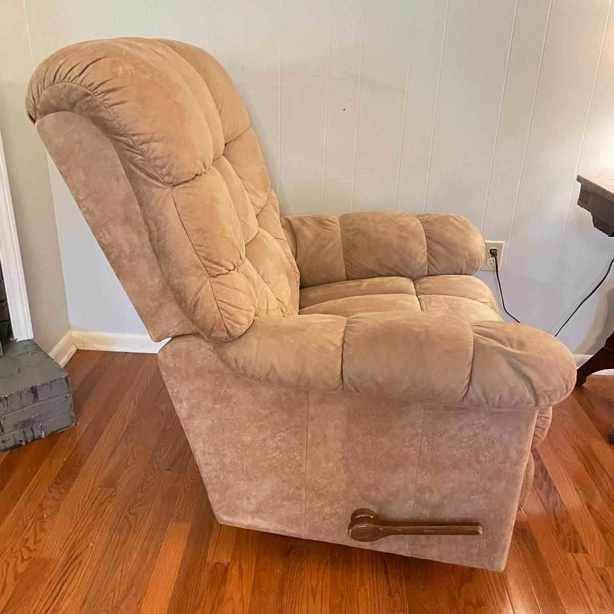 Comfortable beige LaZboy recliner with a swivel base. The soft upholstery appears to be a suede-like microfiber. Recliner has a hardly noticeable water ring on the seat and what appears to be paint rubbed on the back seat from motion. Chair reclines and swivels easily. LaZboy measures approximately 40” x 36” x 42” with a seat height at 19”. See images. Local pick up only. Please bring help to load.