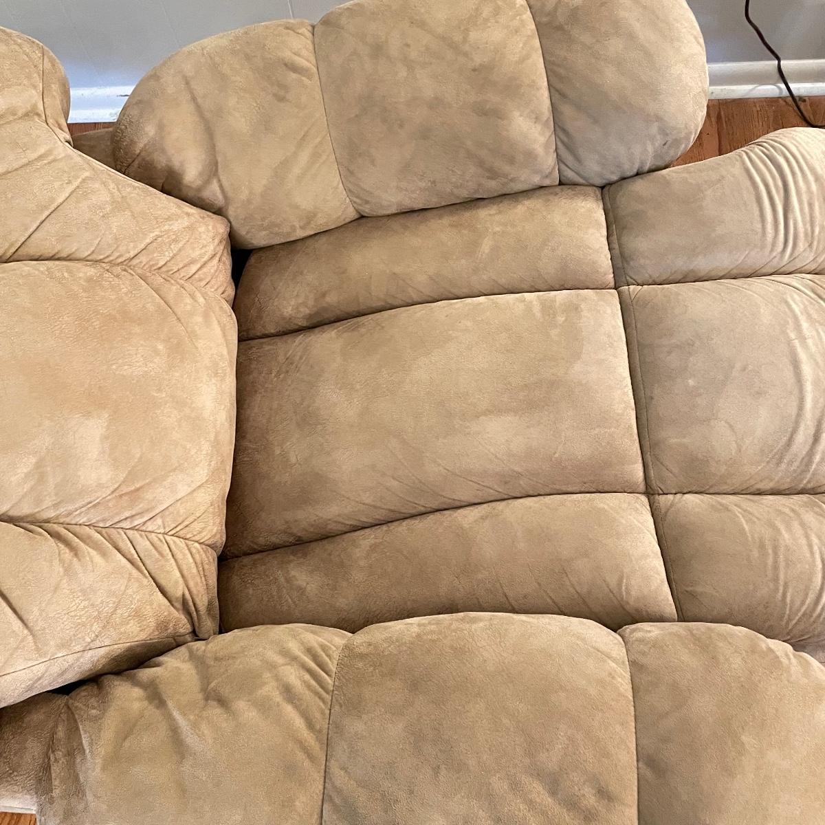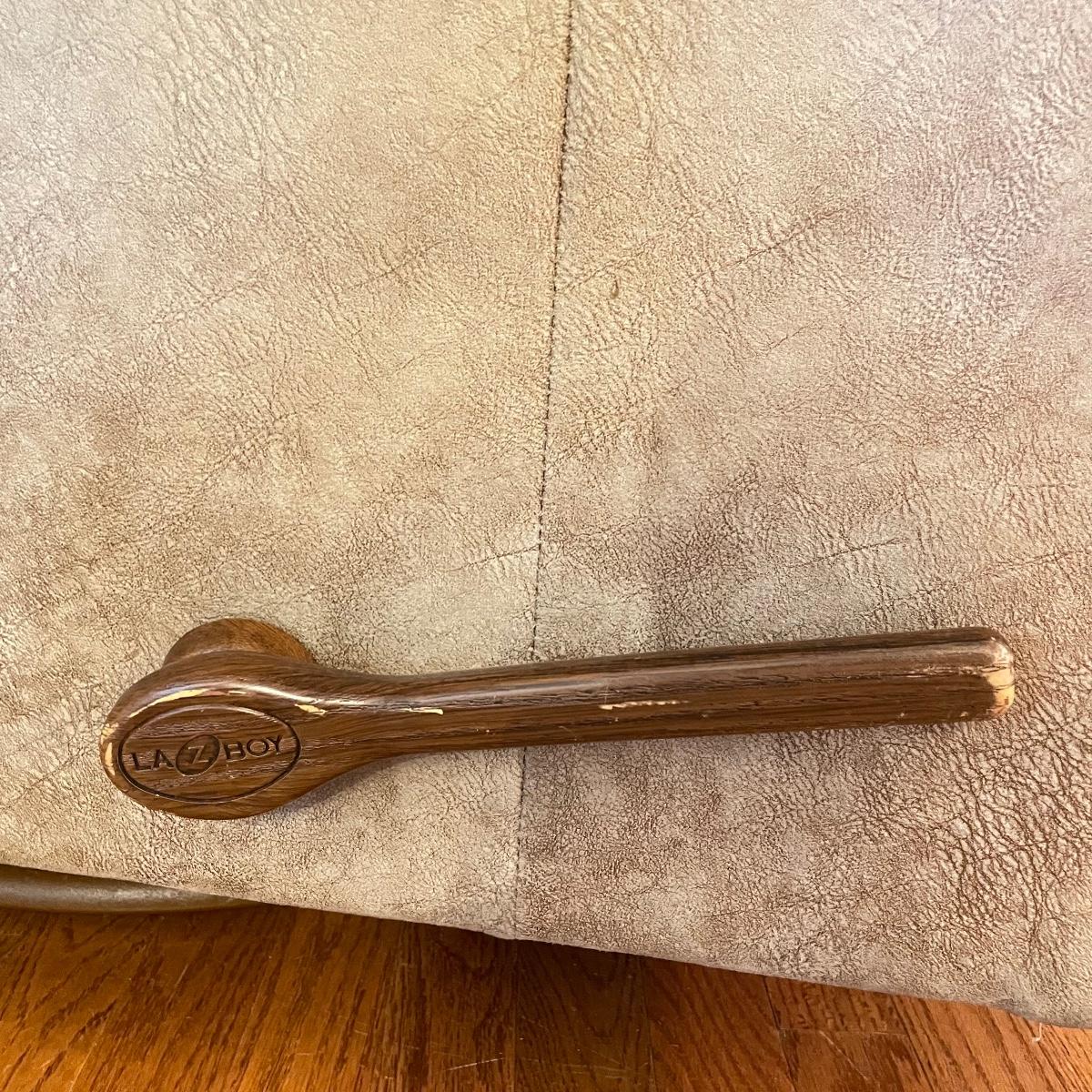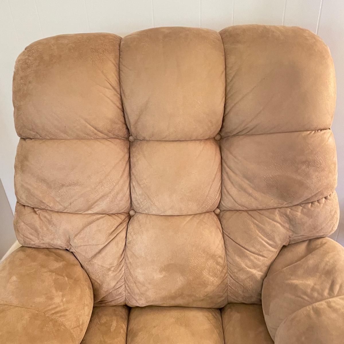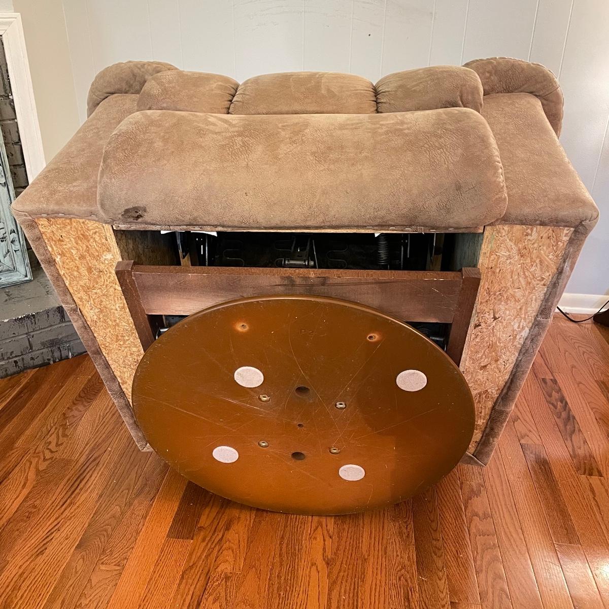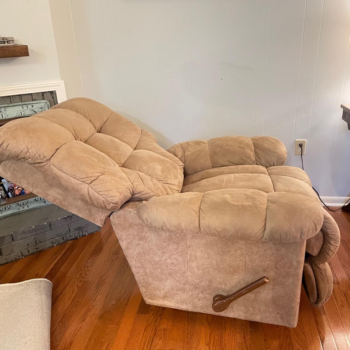 Comfortable beige LaZboy recliner with a swivel base. The soft upholstery appears to be a suede-like microfiber. Recliner has a hardly noticeable water ring on the seat and what appears to be paint rubbed on the back seat from motion. Chair reclines and swivels easily. LaZboy measures approximately 40” x 36” x 42” with a seat height at 19”. See images. Local pick up only. Please bring help to load.