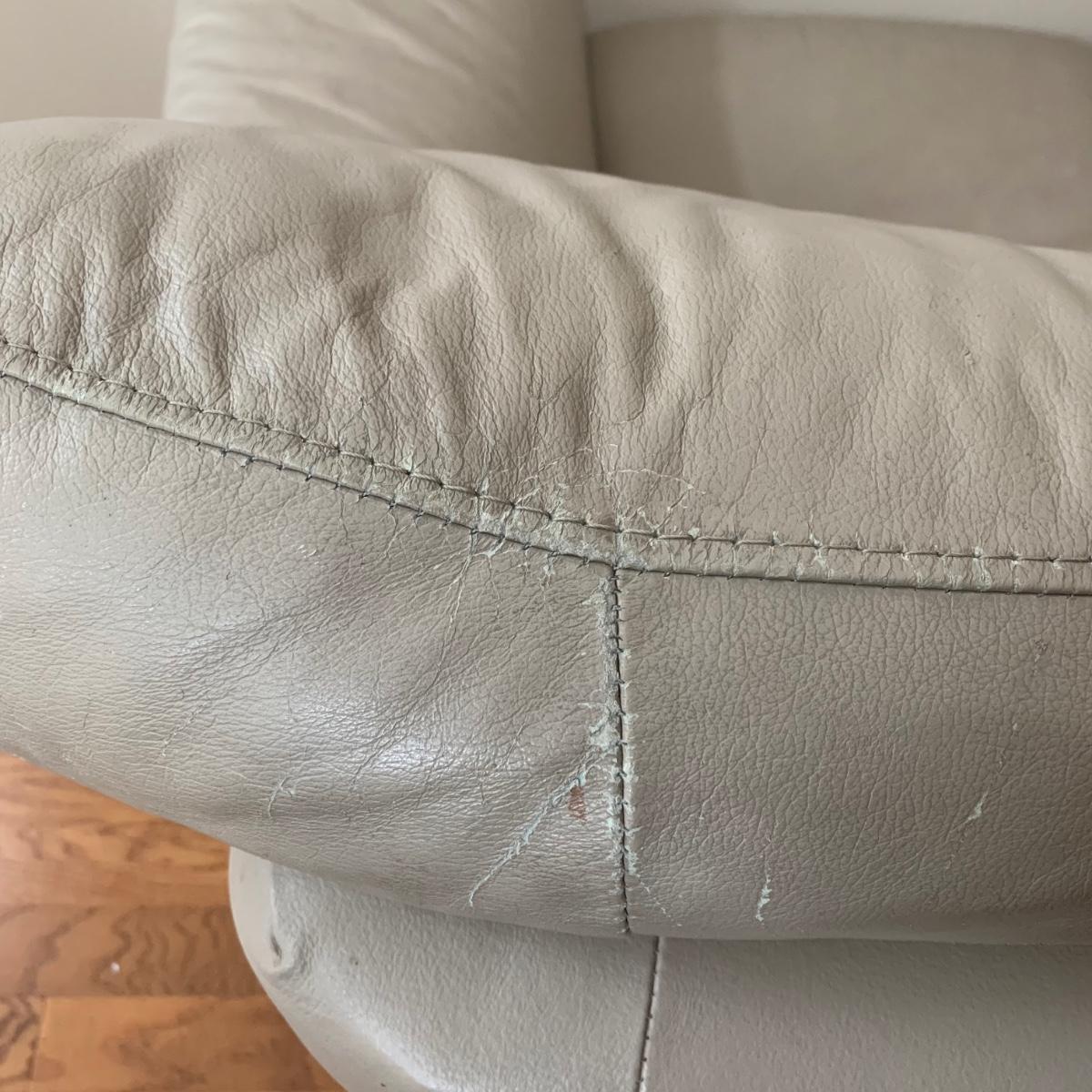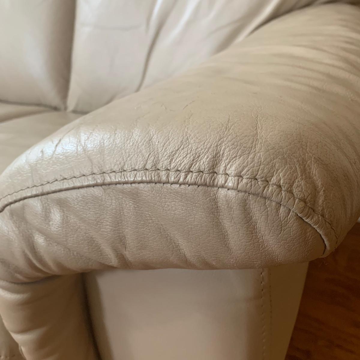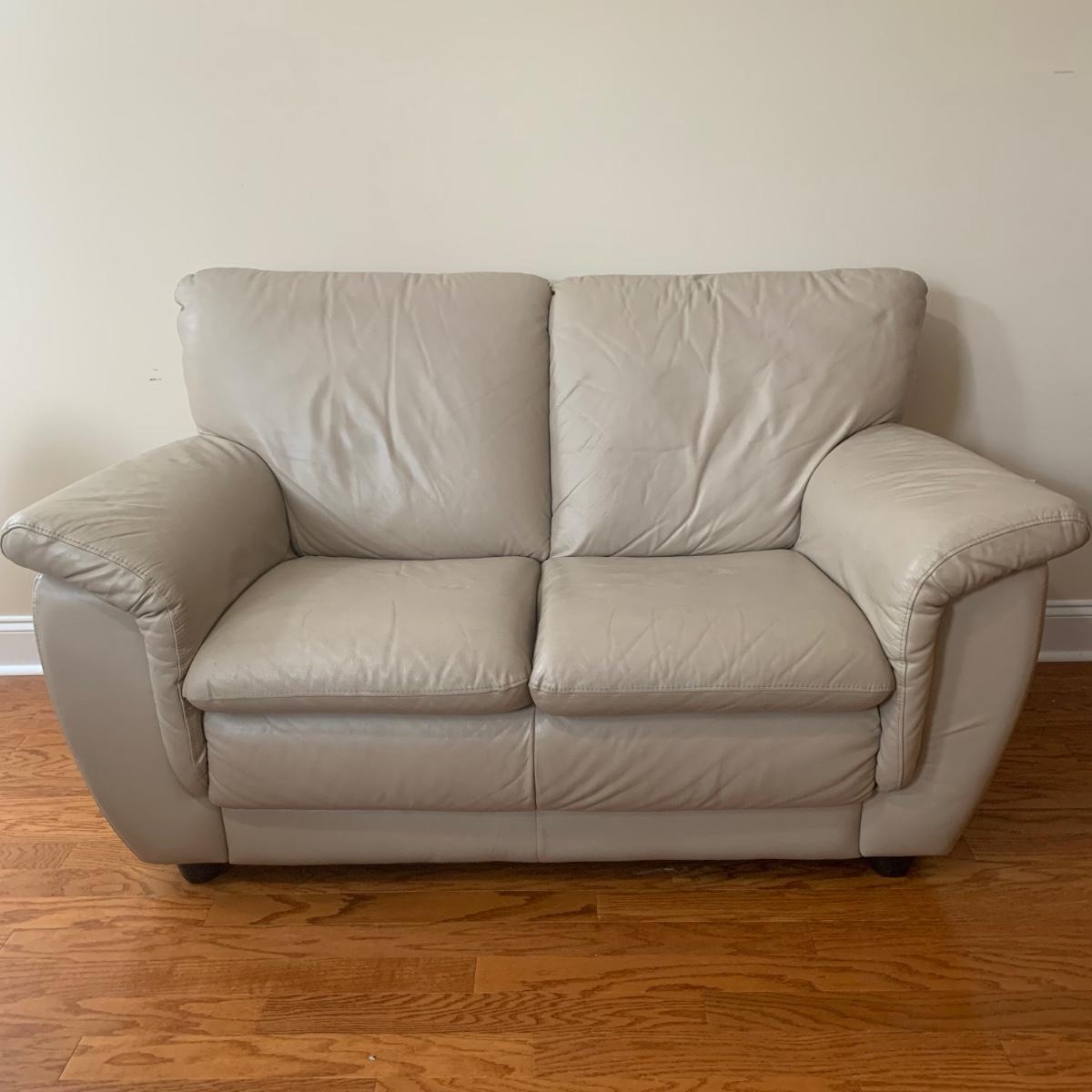 Beige faux leather loveseat by Chateau d’Ax. Exterior has multiple scratches, please see photo for more details. Loveseat measures 60” x 37” x 37”H with a seat height of 18”H. Loveseat is part of a living room set. You'll find a matching sofa and armchair with ottoman in this auction as well.