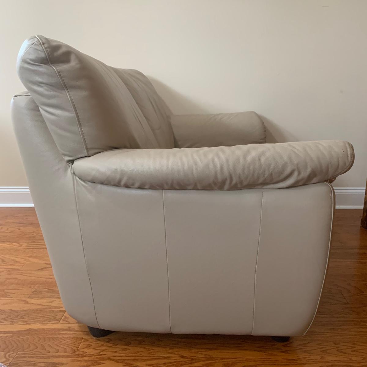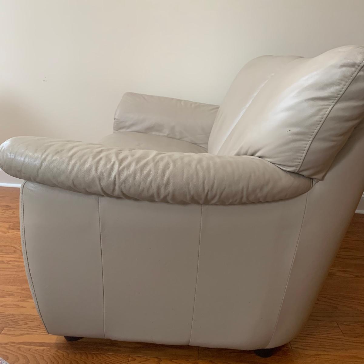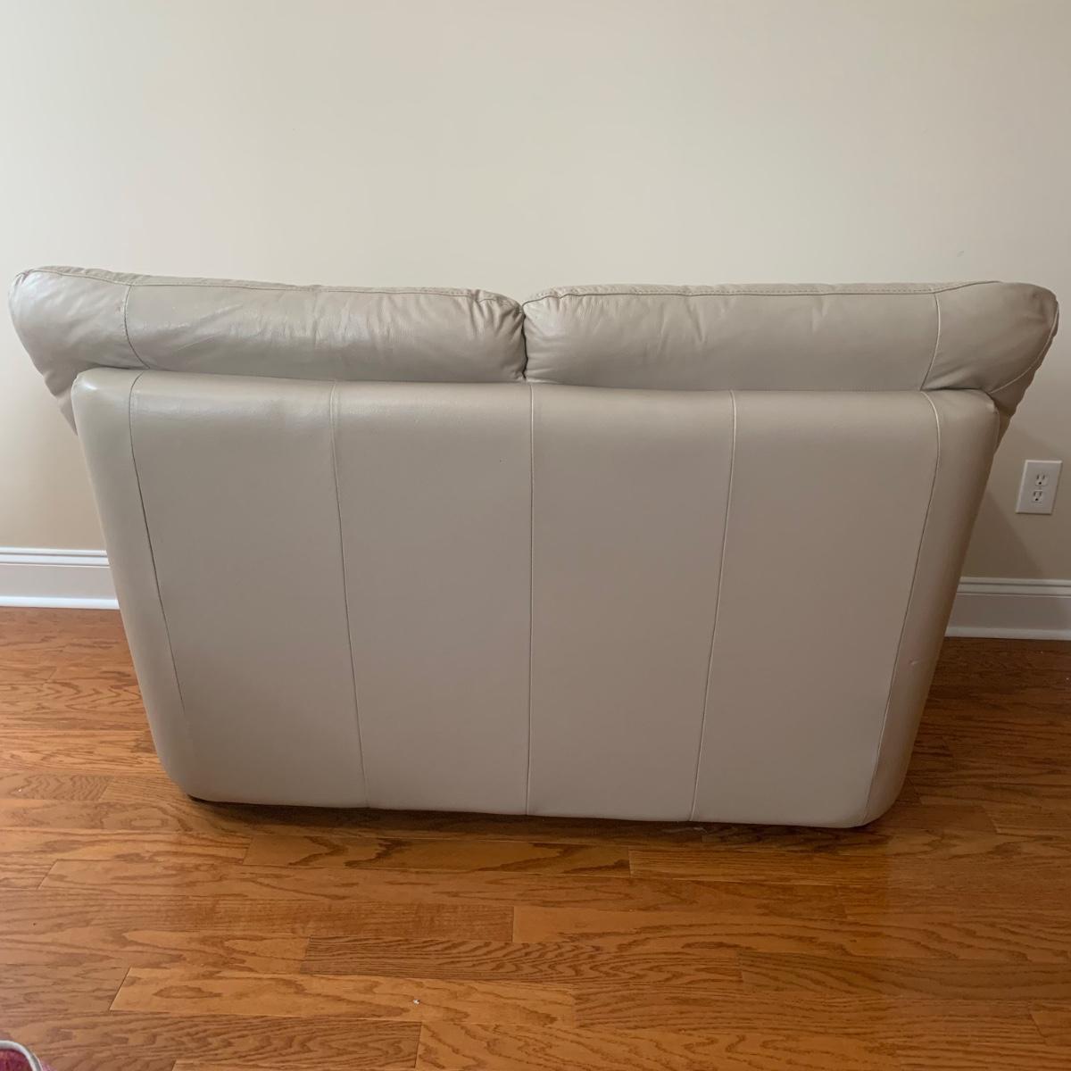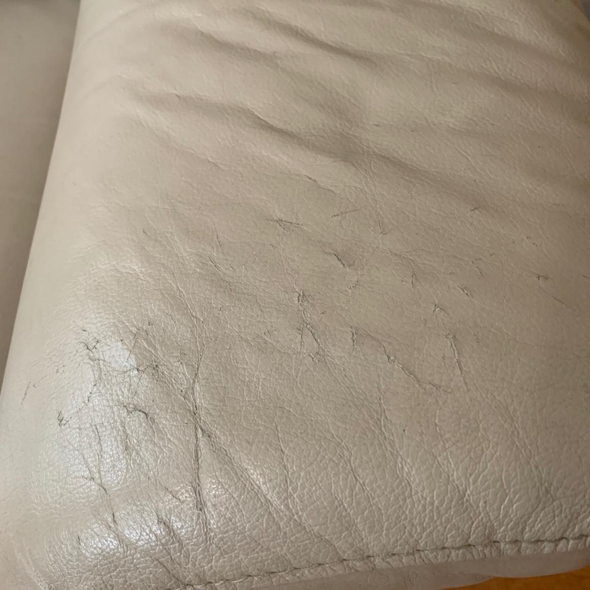 Beige faux leather loveseat by Chateau d’Ax. Exterior has multiple scratches, please see photo for more details. Loveseat measures 60” x 37” x 37”H with a seat height of 18”H. Loveseat is part of a living room set. You'll find a matching sofa and armchair with ottoman in this auction as well.