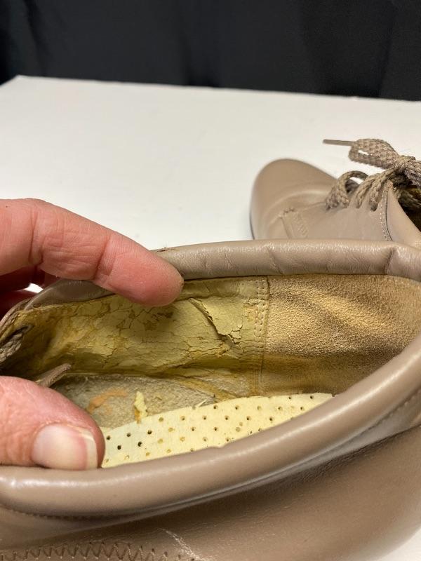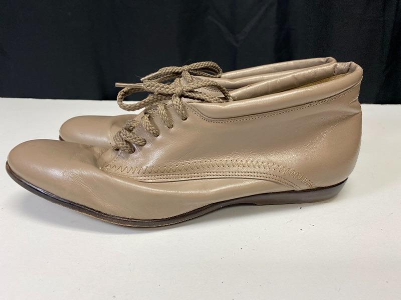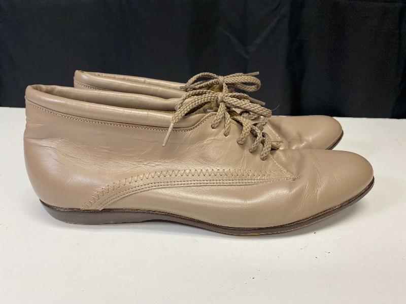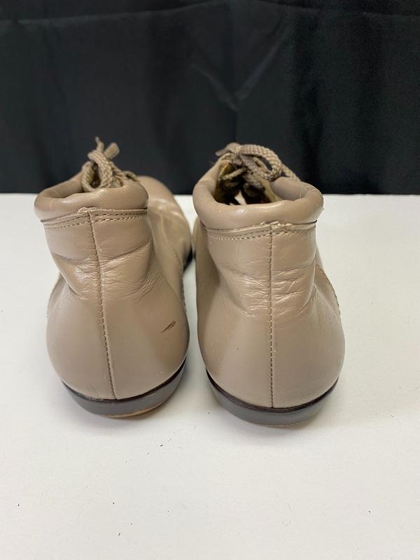 Pair of lace up ankle high loafers. Beige/ nude color. Hard soles, well worn. Previous owner had place insoles in them covering the foot pad. Size 9.