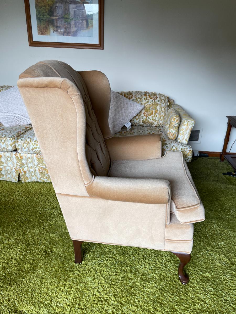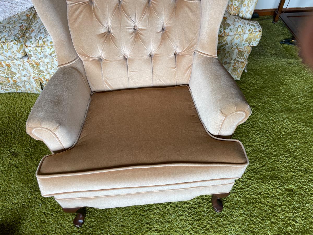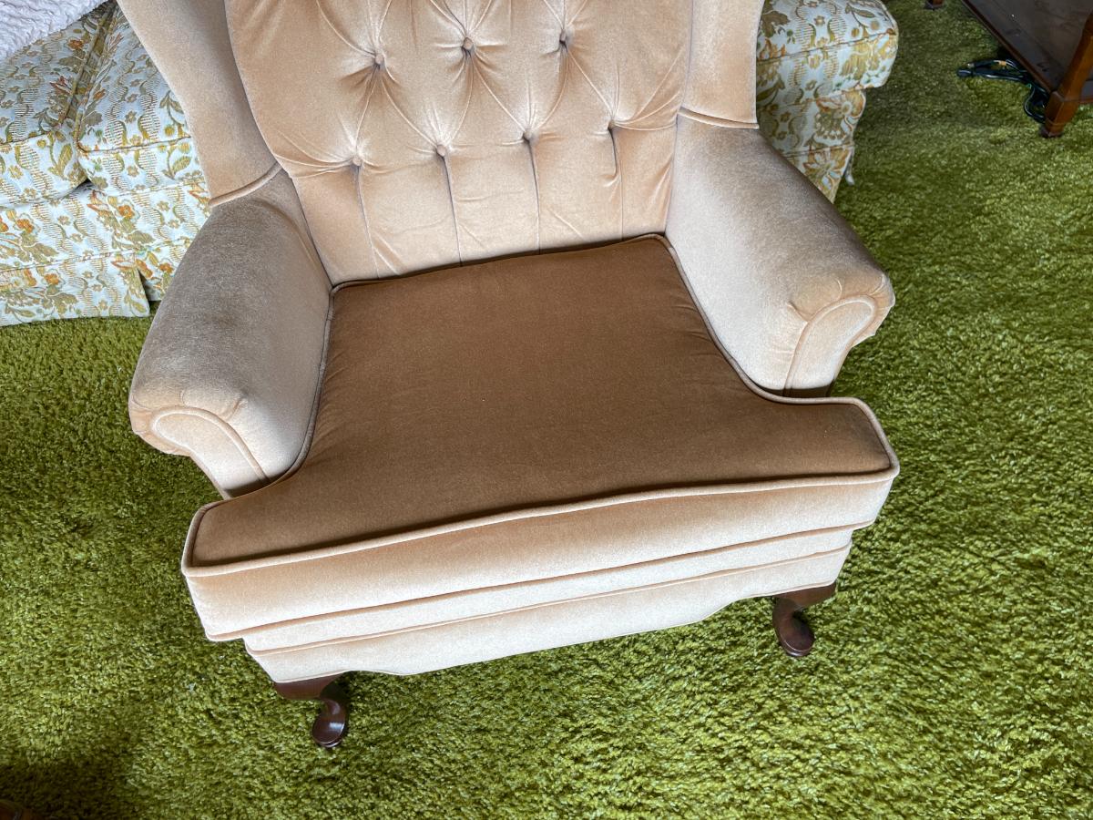 A beige wingback chair featuring a tufted backrest and Queen Anne style wooden legs. The chair measures approximately 39 inches tall, 32 inches wide, and 29 inches deep. It includes a removable seat cushion and displays classic upholstered craftsmanship. The condition appears well-maintained, with no visible tears or damage noted.