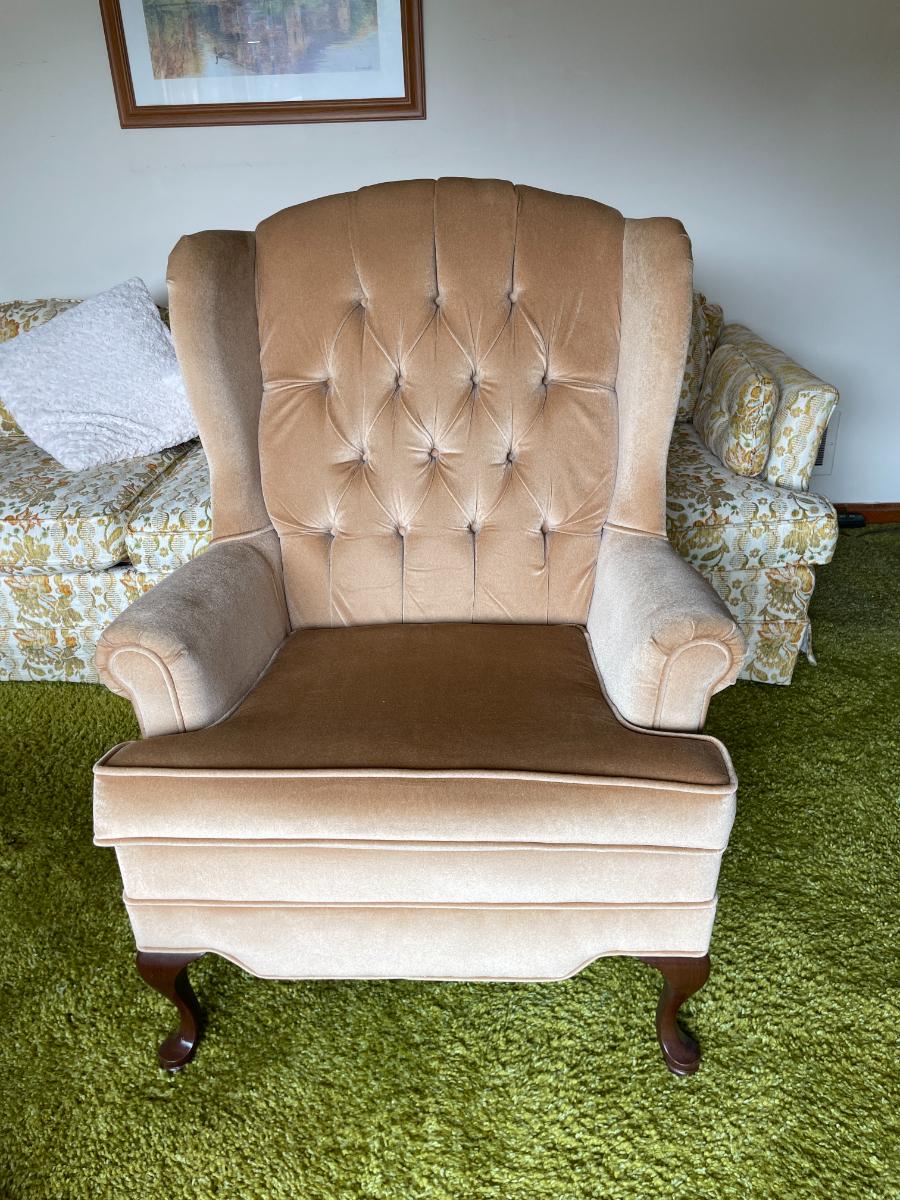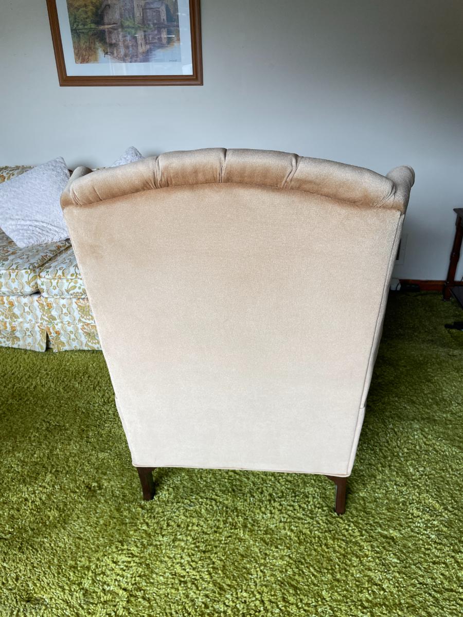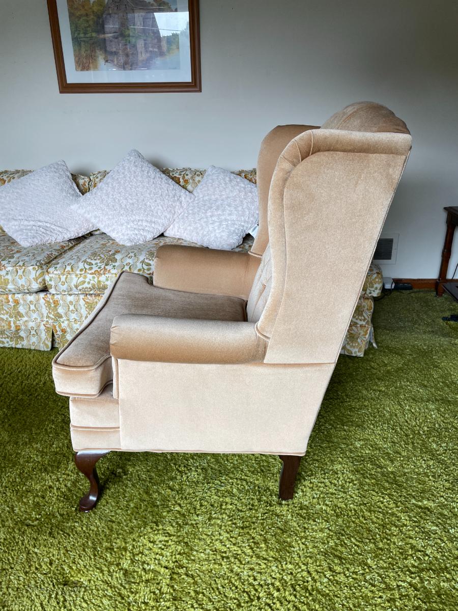 A beige wingback chair featuring a tufted backrest and Queen Anne style wooden legs. The chair measures approximately 39 inches tall, 32 inches wide, and 29 inches deep. It includes a removable seat cushion and displays classic upholstered craftsmanship. The condition appears well-maintained, with no visible tears or damage noted.