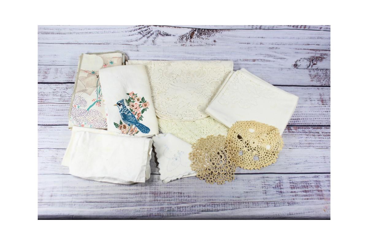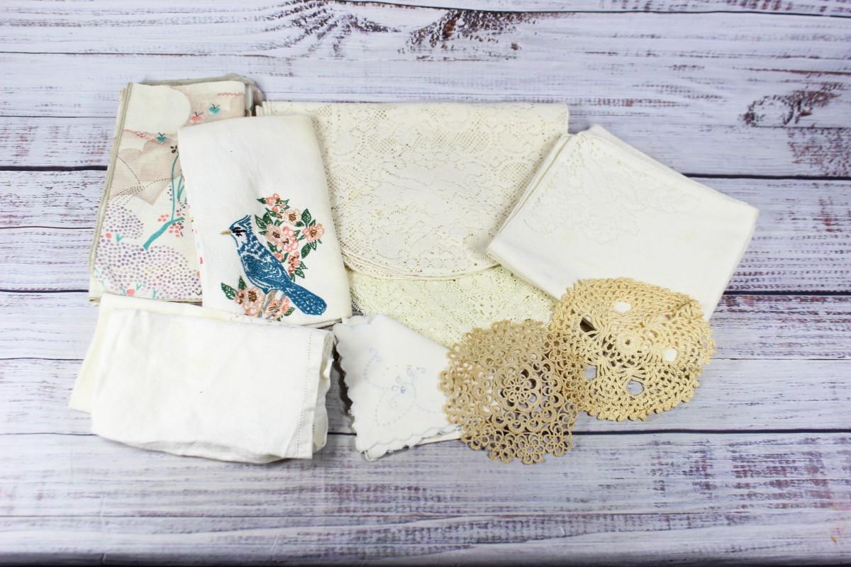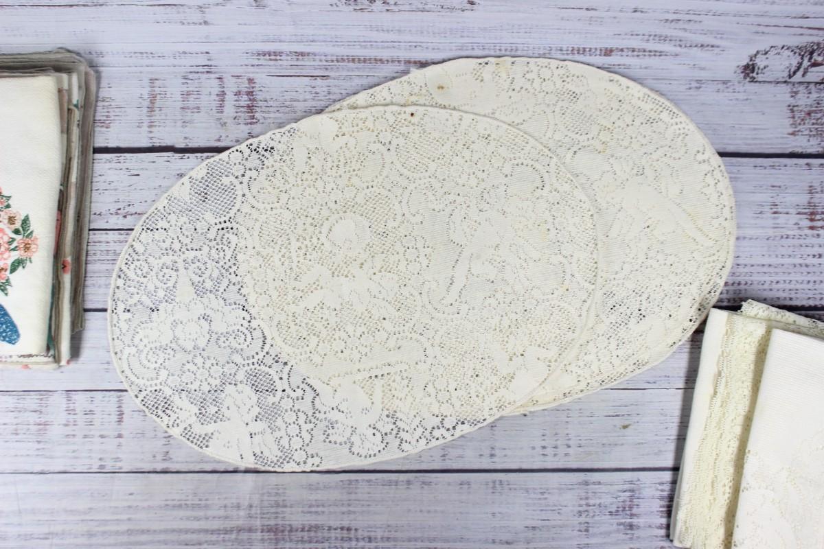 Beige White Home Decor Doilies, Tablecloths, Placemats and More, there are no significant tears or rips to any of the pieces and is in fair useable condition. Some pieces might have discoloration, check pictures for more details and for sizing.