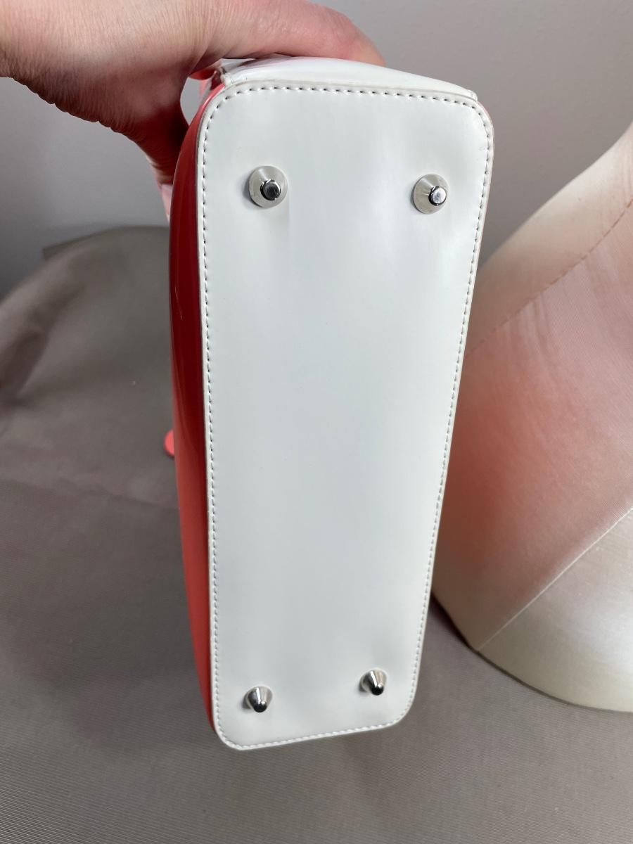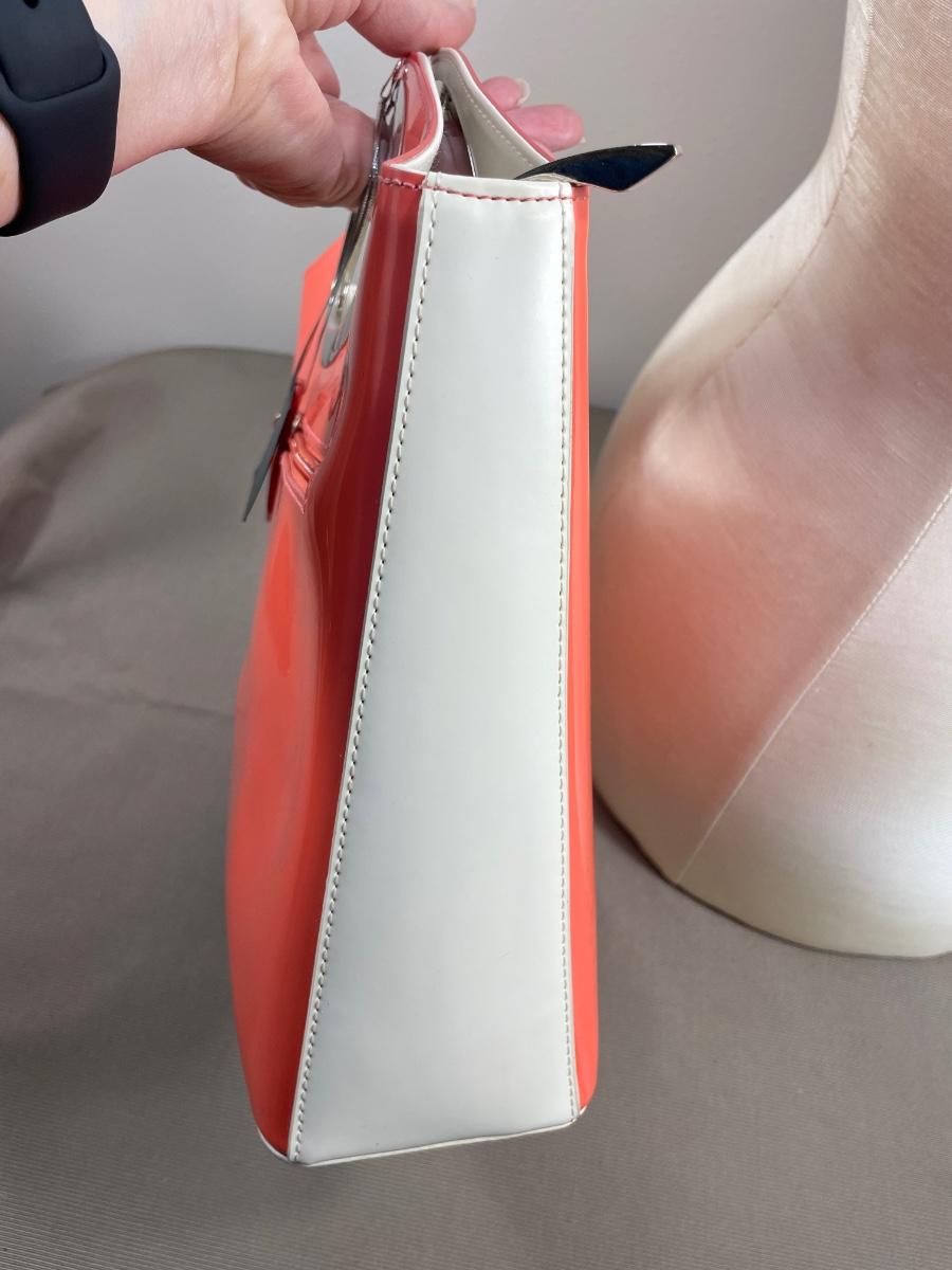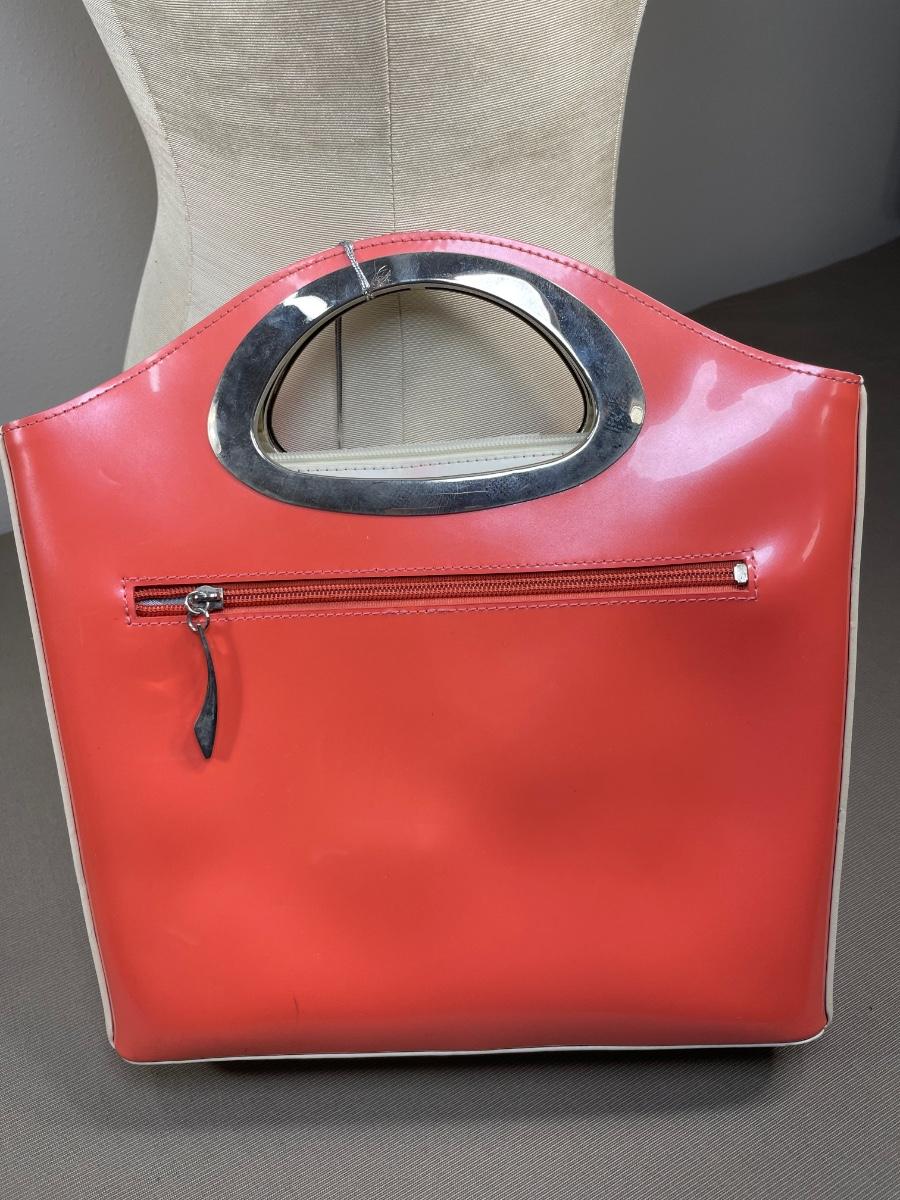 Vintage style in salmon/cream patent look with silver tone hardware. Some scratches on handle otherwise very good condition, new with tag.