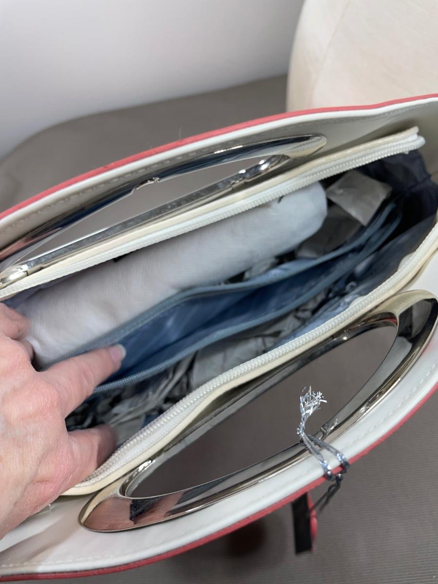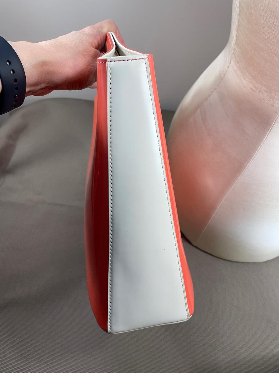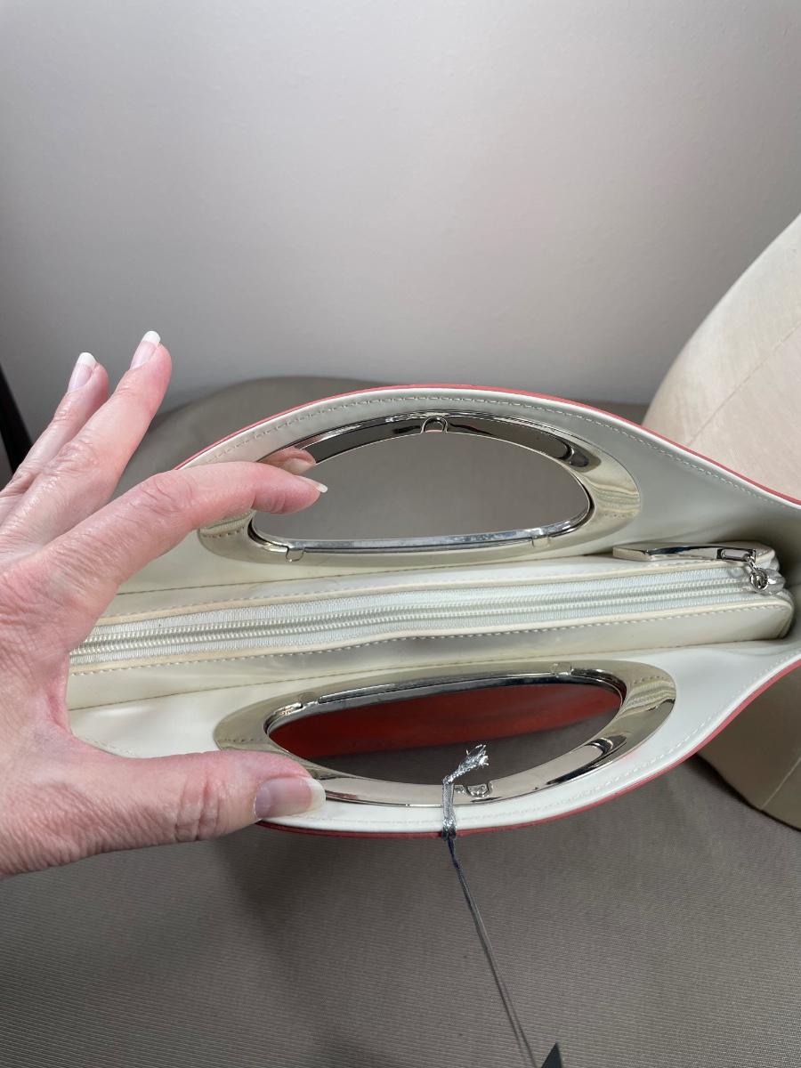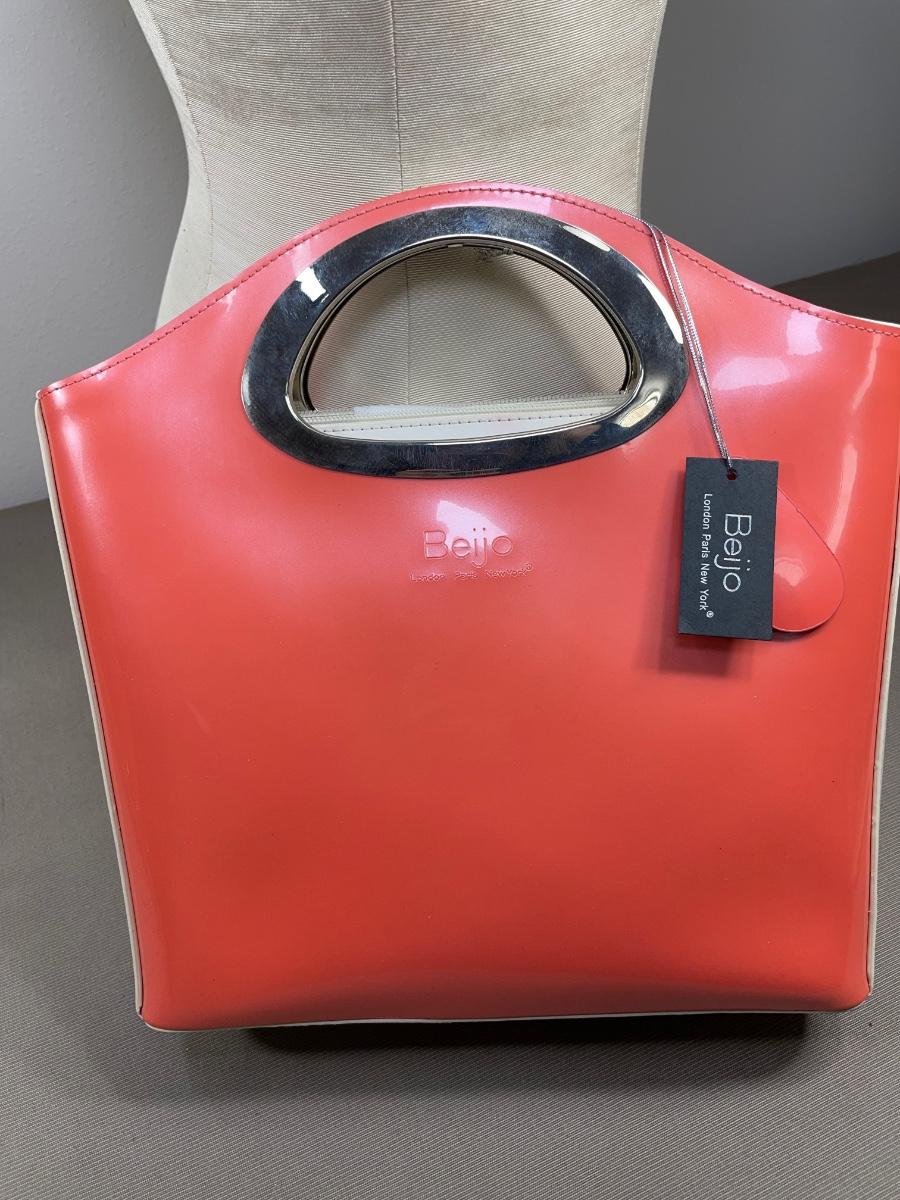 Vintage style in salmon/cream patent look with silver tone hardware. Some scratches on handle otherwise very good condition, new with tag.