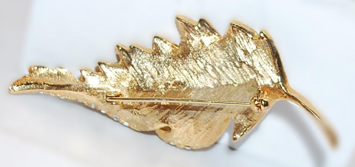 Bejeweled "Curled Gold Leaf" BROOCH (3" x 1¼") with Clear Round Accent Stones on a Gold Tone Setting