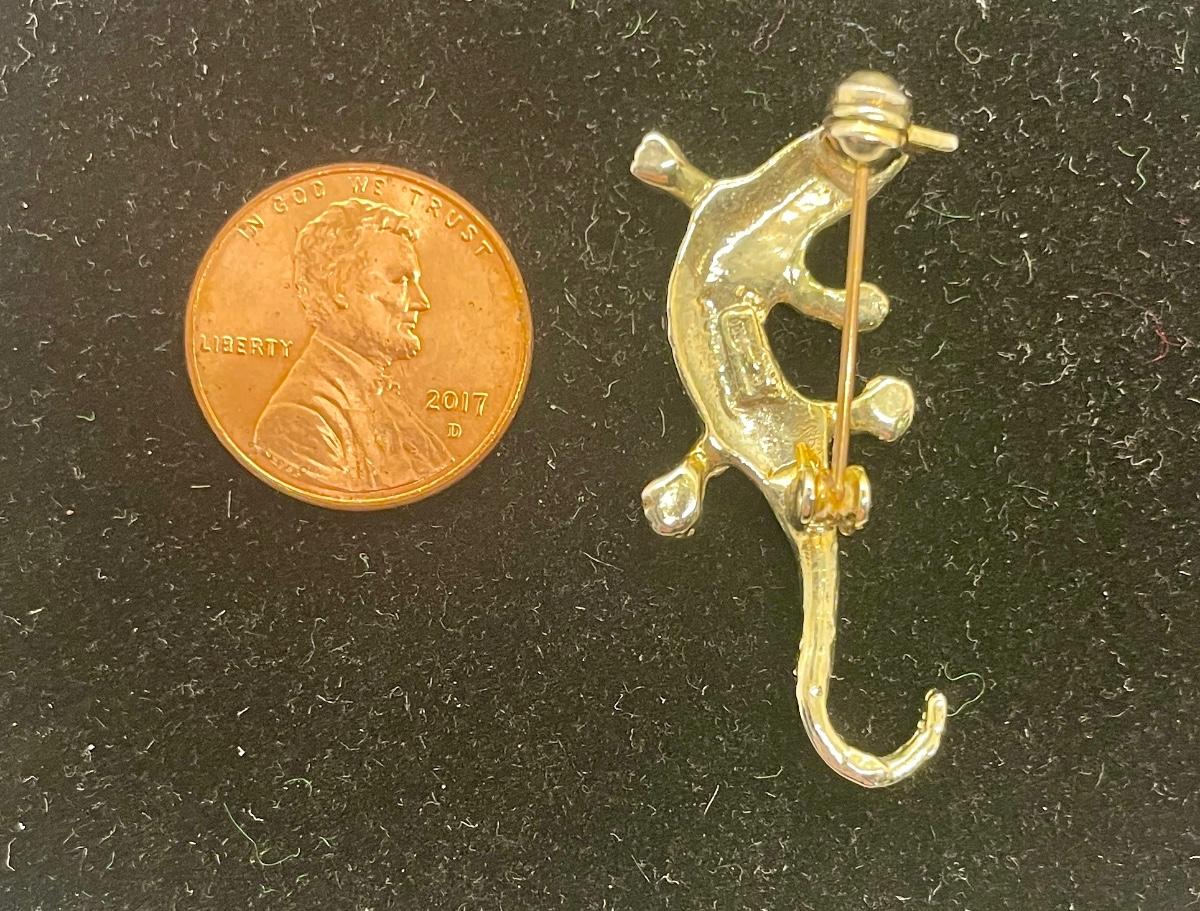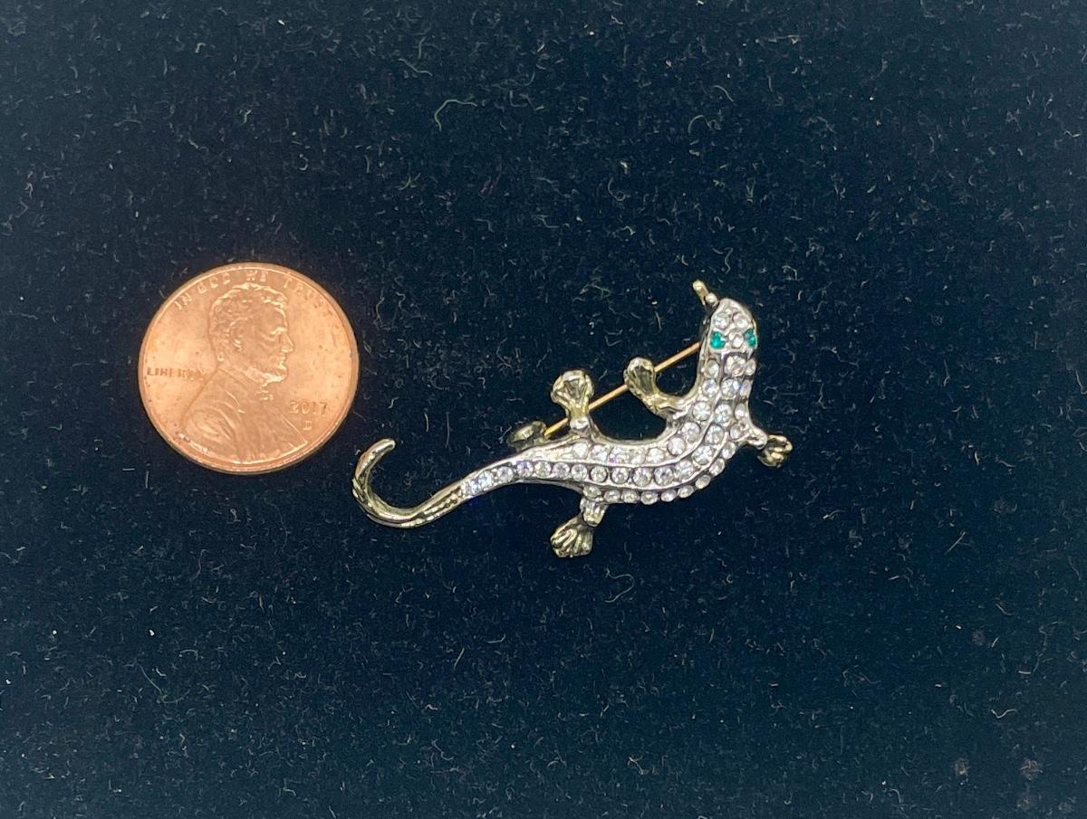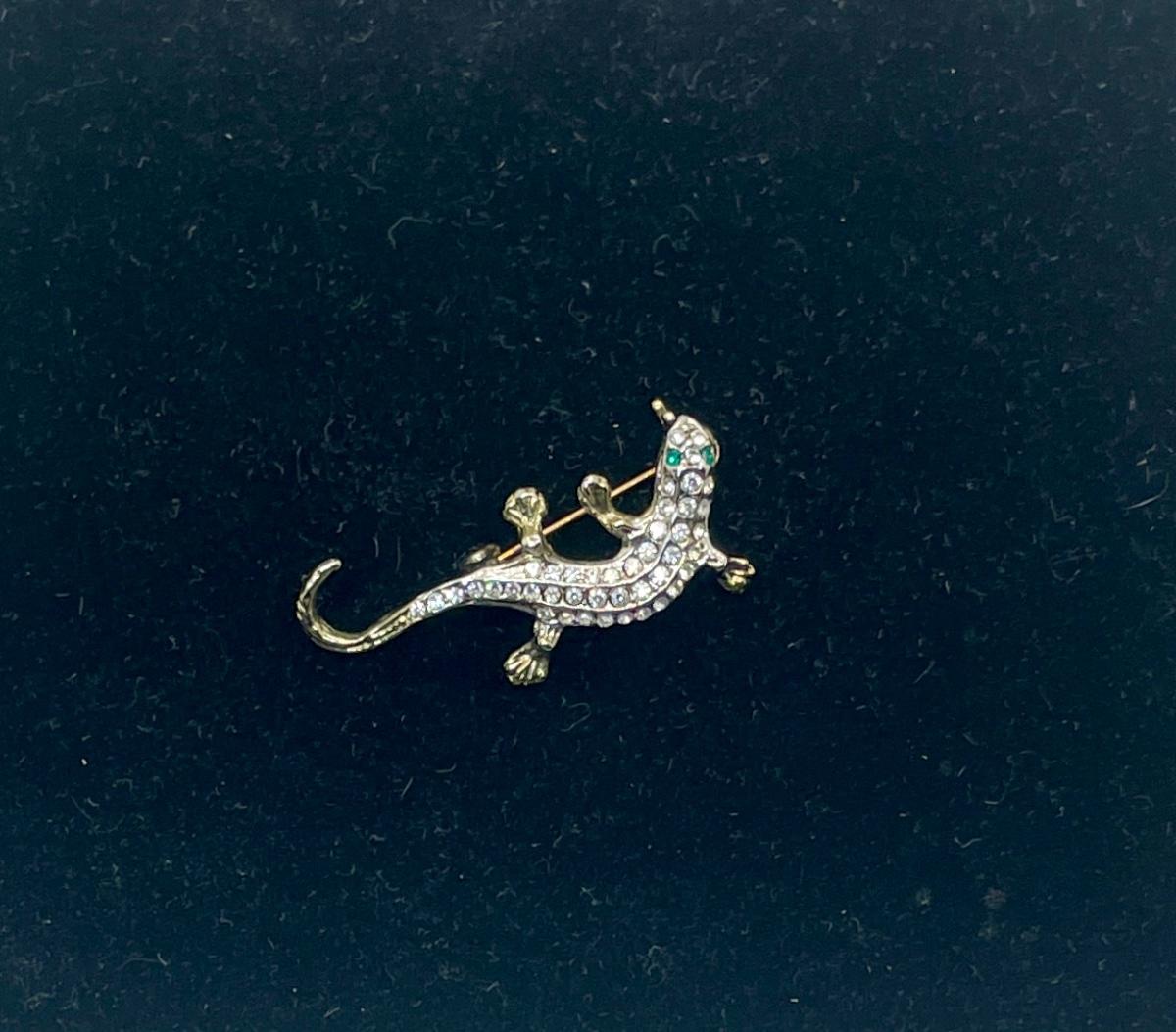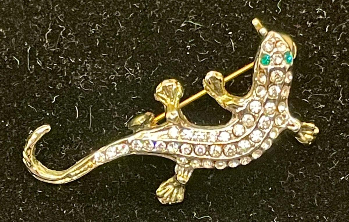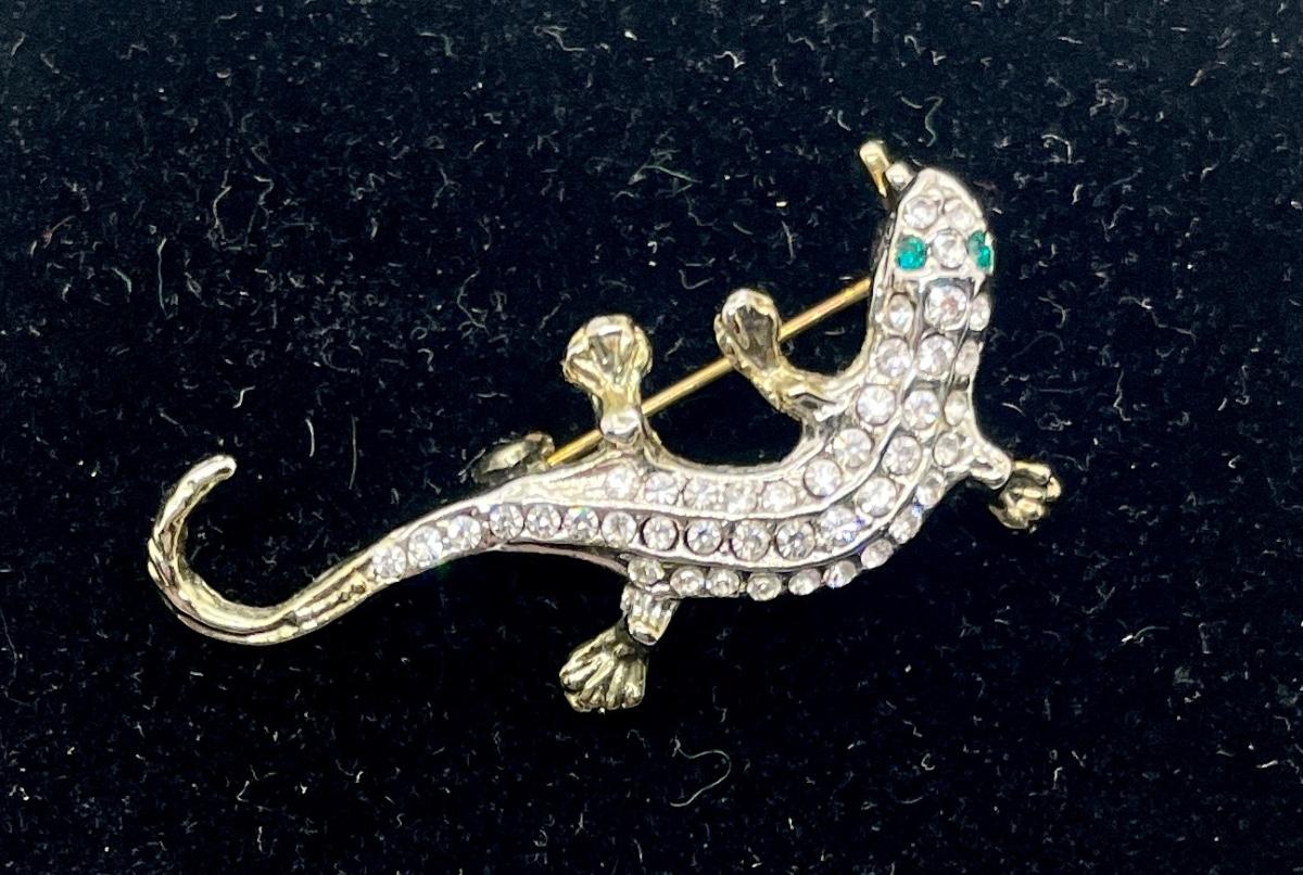 Silvertone with clear rhinestones and green eyes. In good condition.