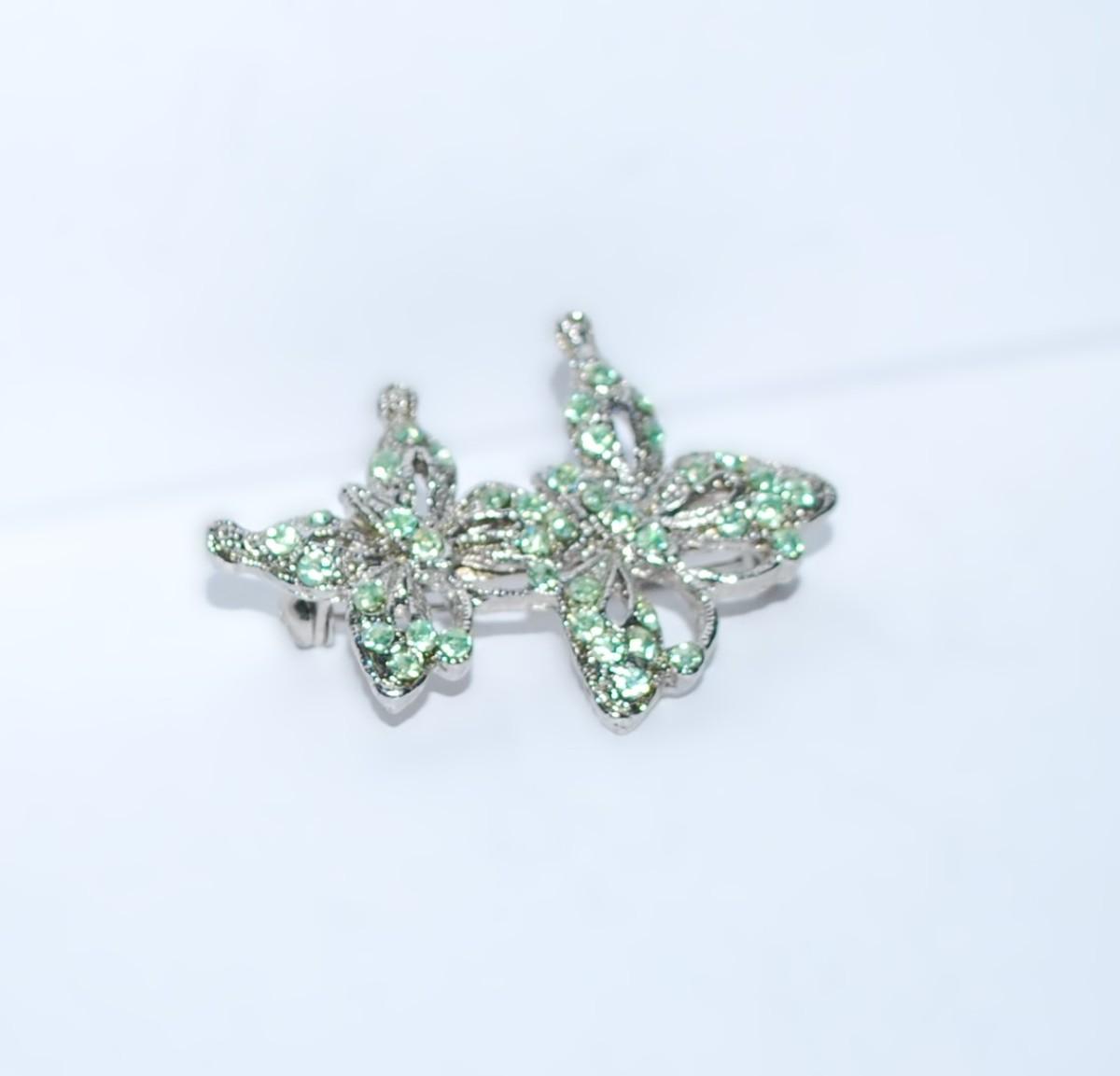 Bejeweled MINT GREEN DOUBLE BUTTERFLY BROOCH (1½" x 1¼") on a Silver Tone Setting