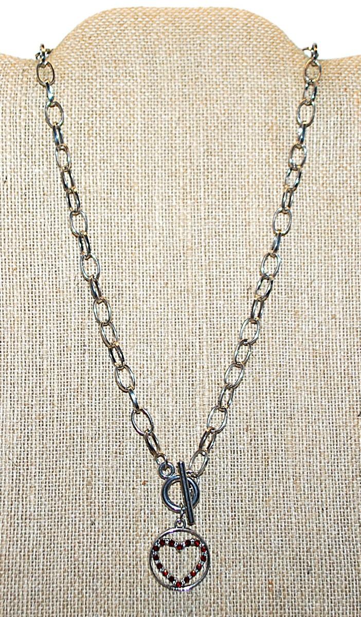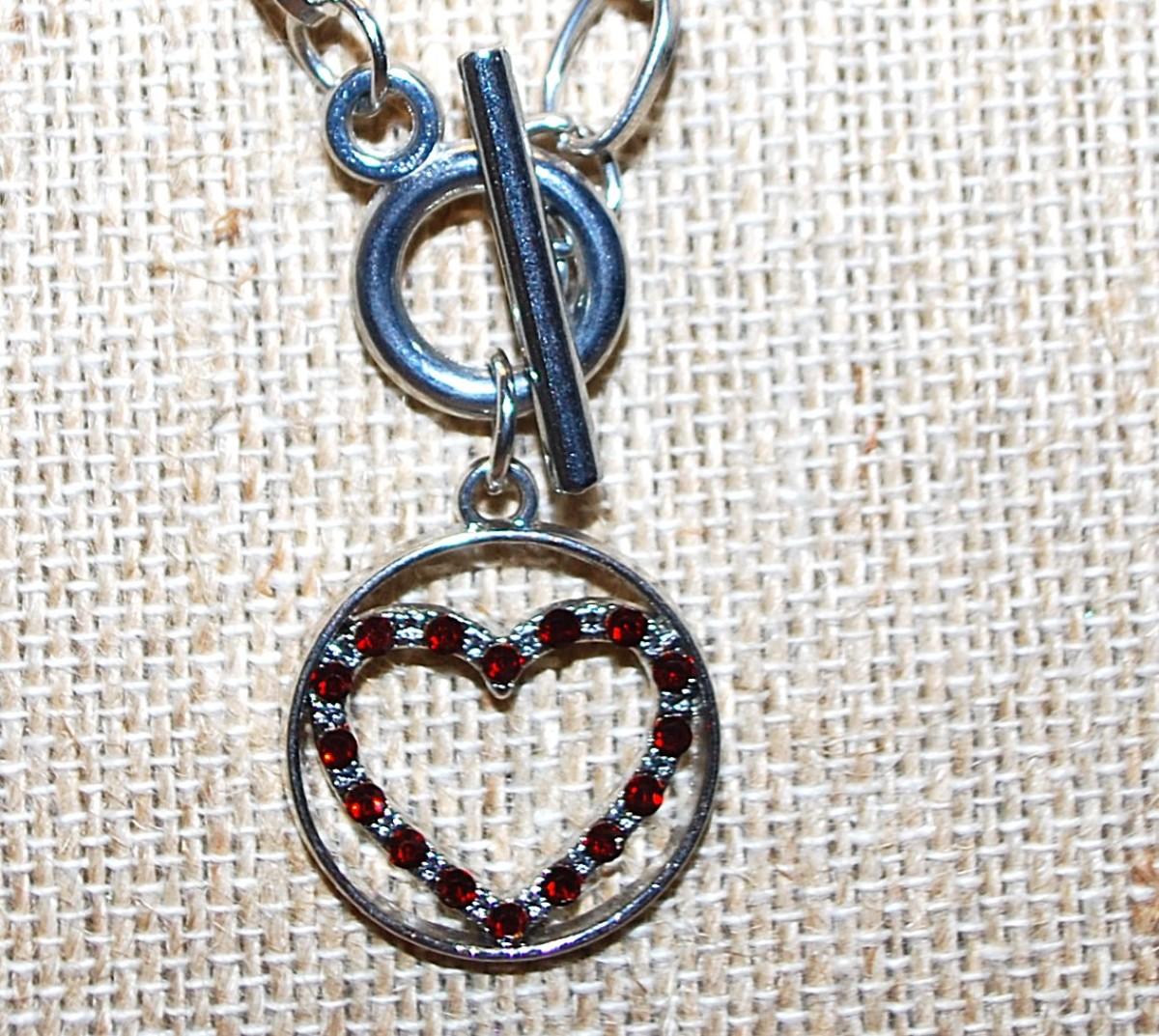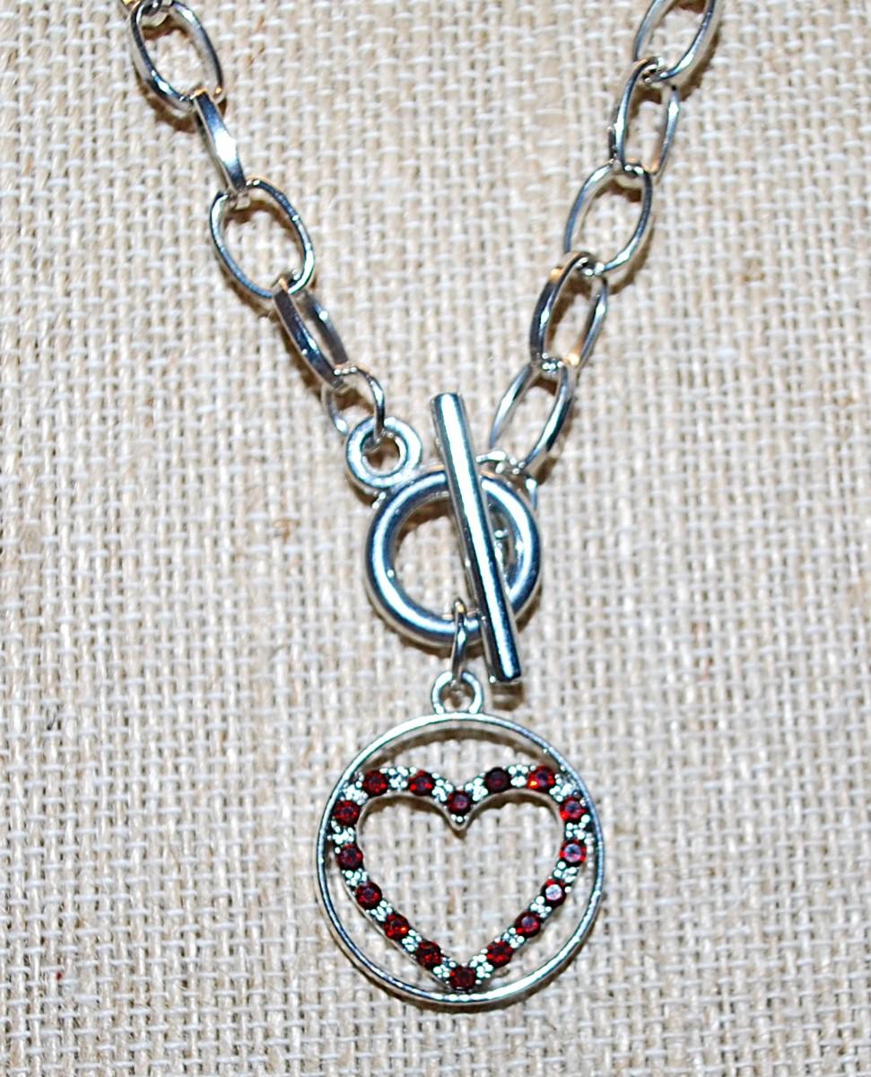Bejeweled RED & CLEAR STONES HEART PENDANT NECKLACE Set in a Silver Tone CIRCLE and Thin Link Chain & TOGGLE CLASP 20" L