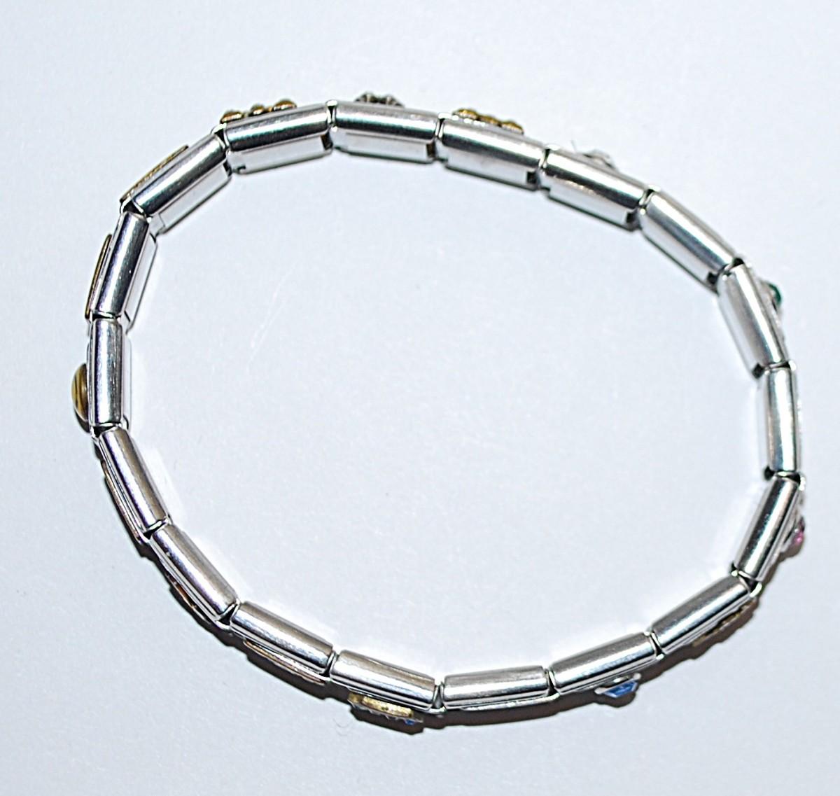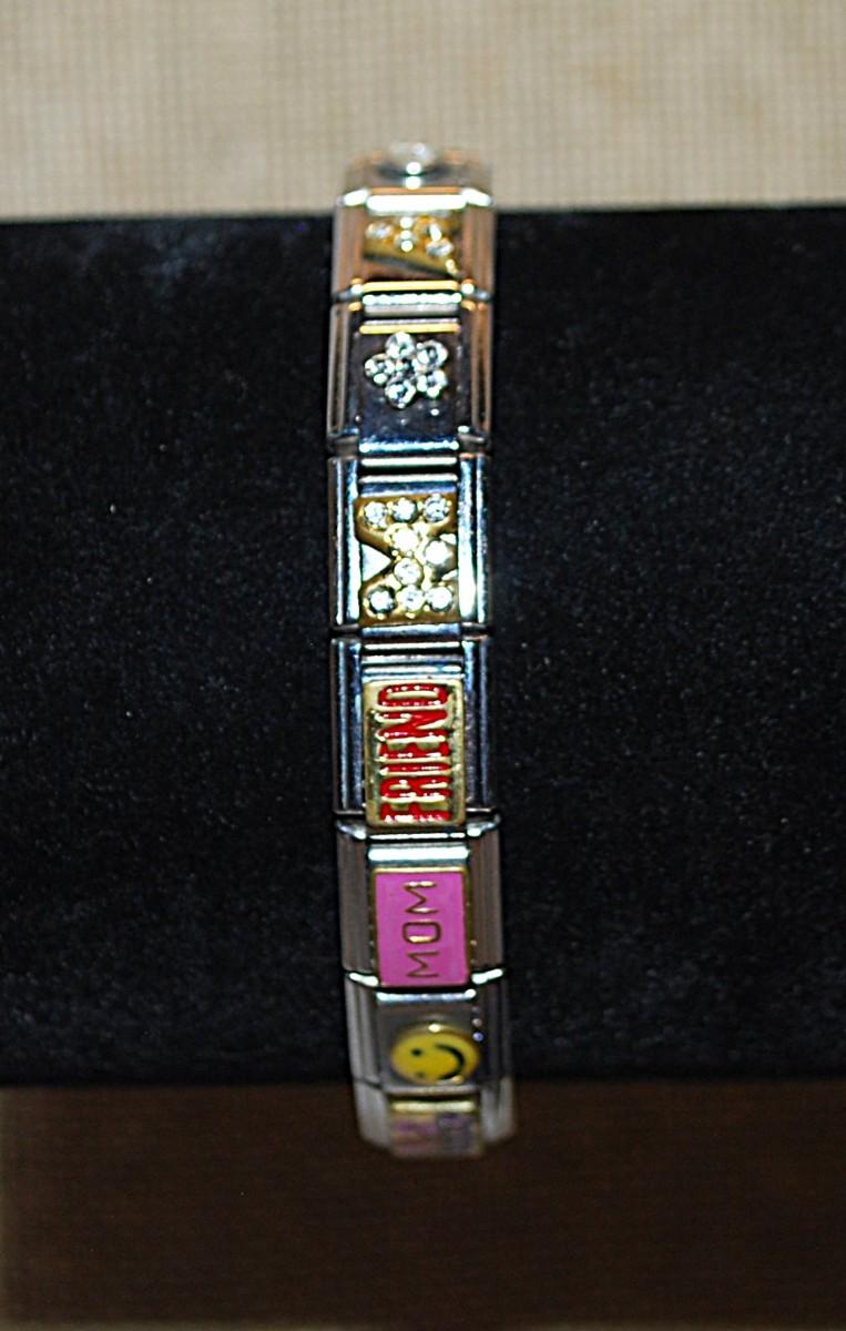 Bejeweled Segmented Elastic BRACELET (2¼" Opening) with Charms-Style Panels of "Mom, Friend, USA, Etc.