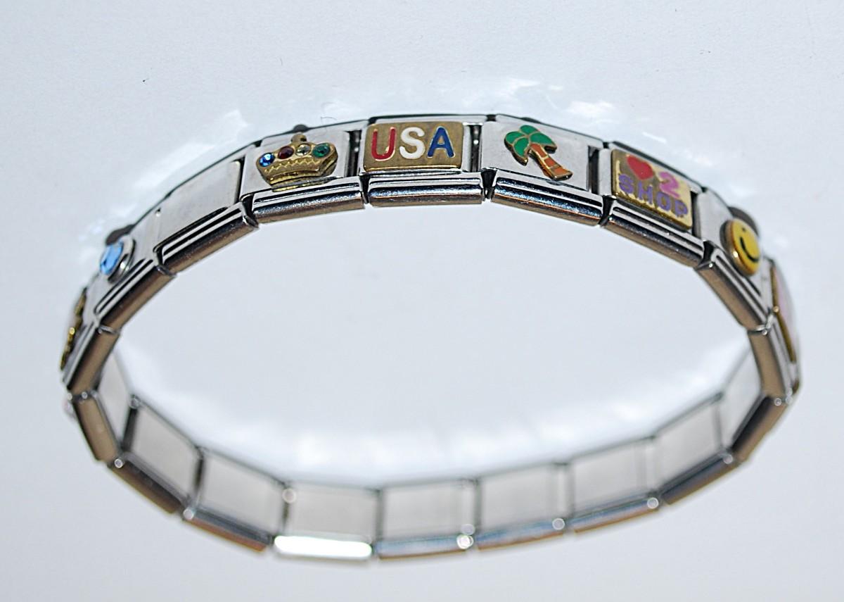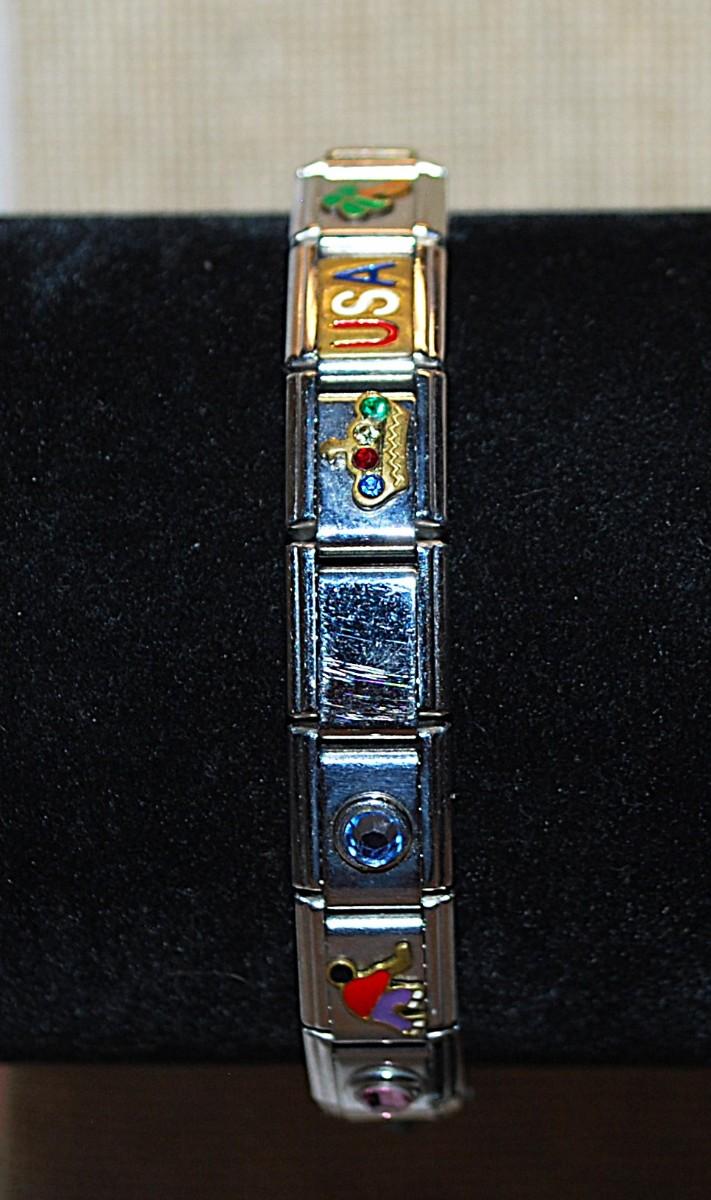 Bejeweled Segmented Elastic BRACELET (2¼" Opening) with Charms-Style Panels of "Mom, Friend, USA, Etc.