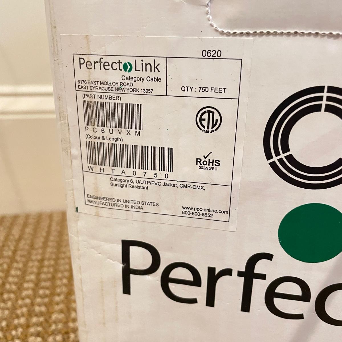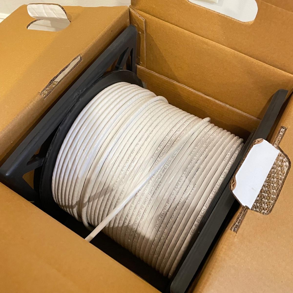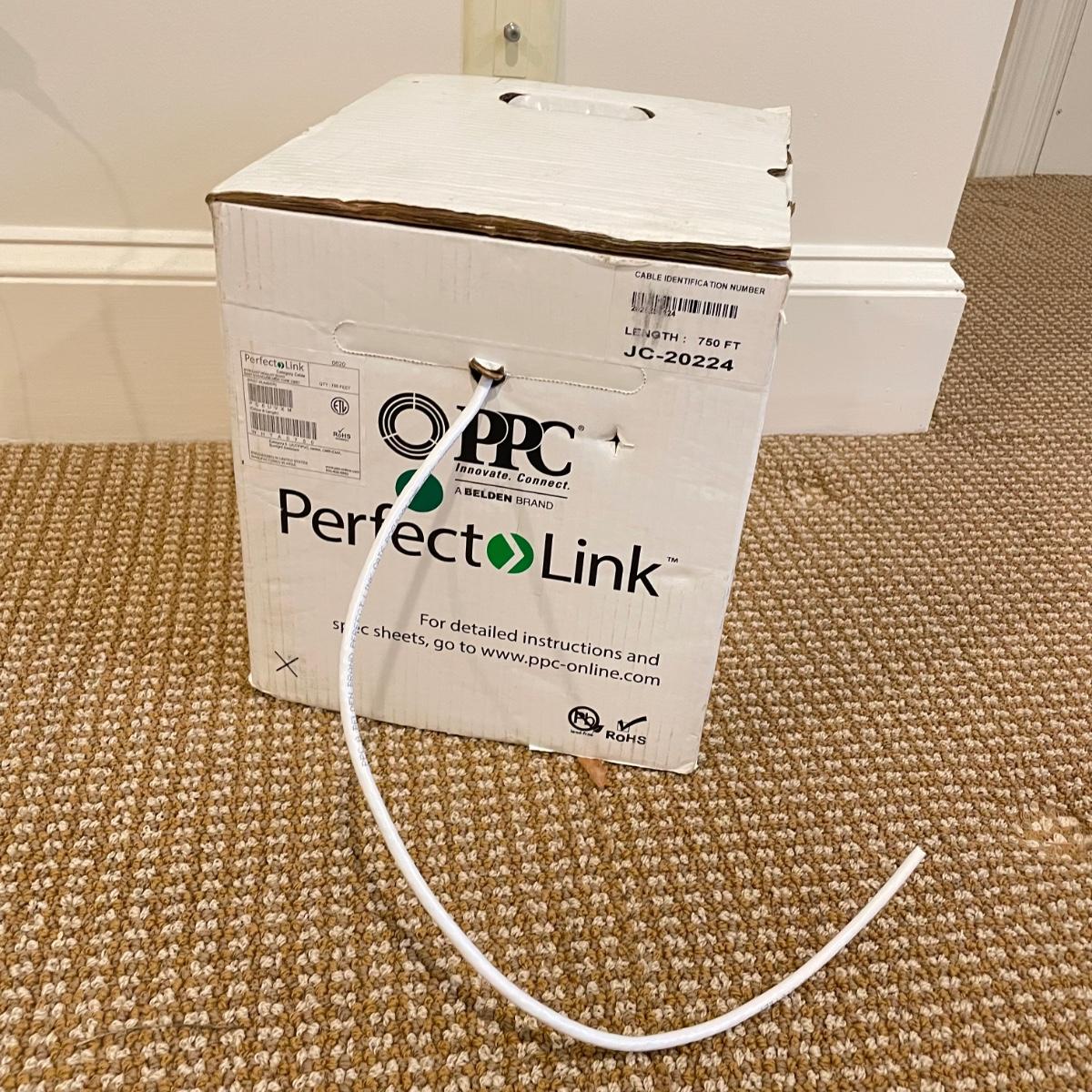 An opened box of what was once 750ft of PPC Belden category 6 U/UTP/PVC Jacket outdoor cable. We do not know how much cable was used, but box is still heavy and reel seems fairly full, see images. Box measures 12” x 10.5” x 12H. Local pick up only.