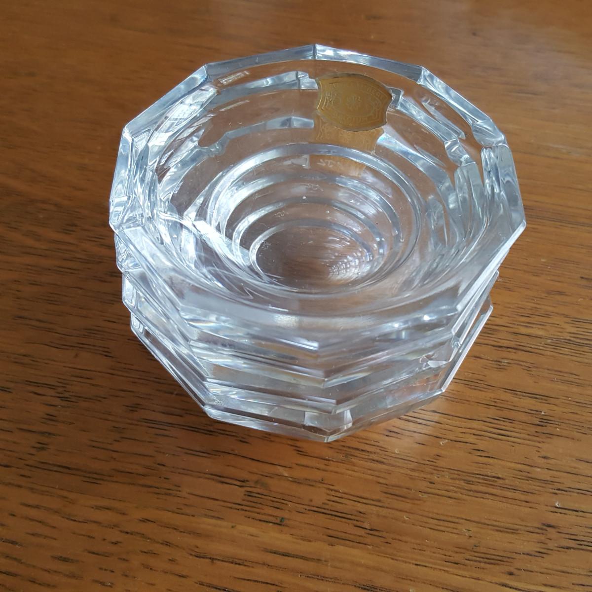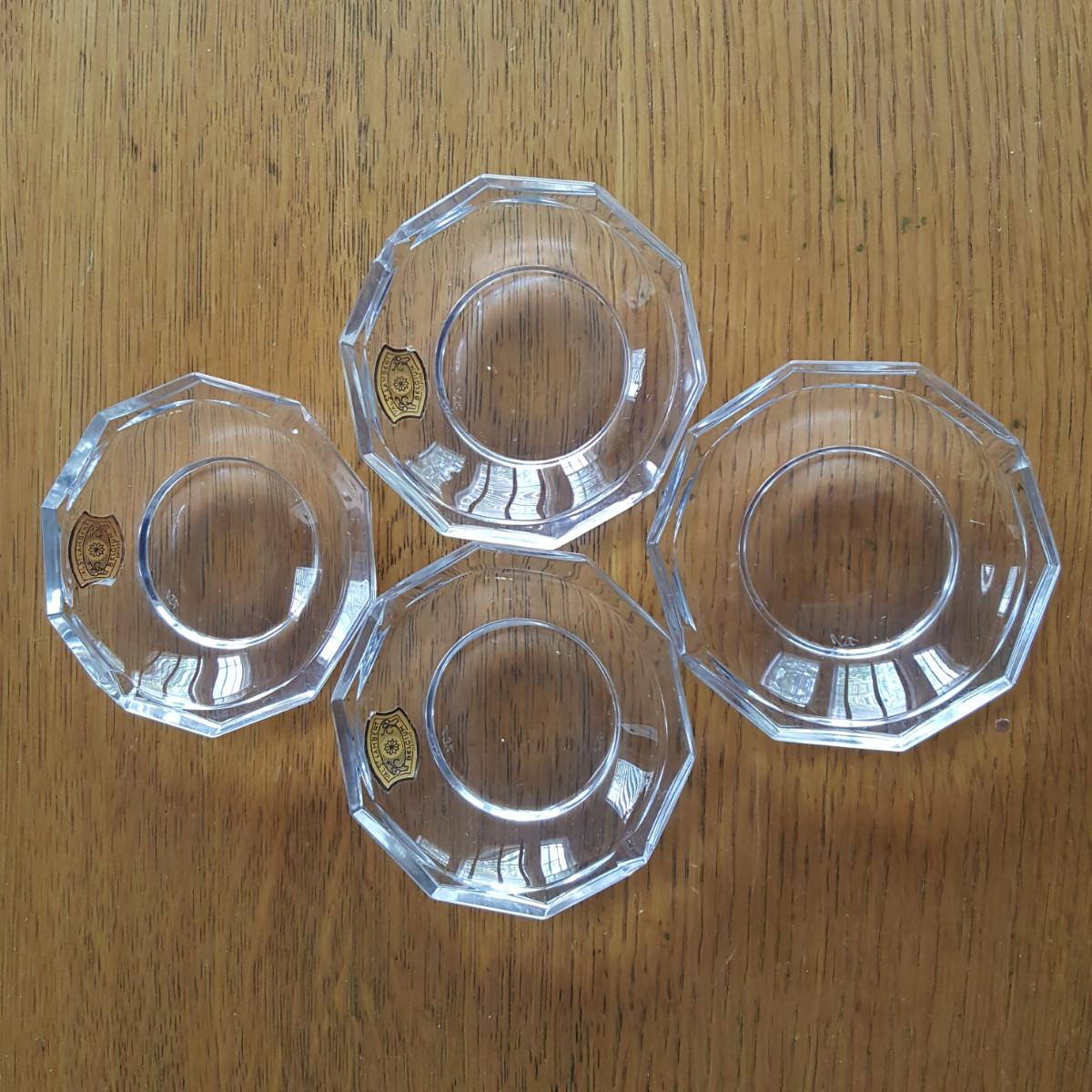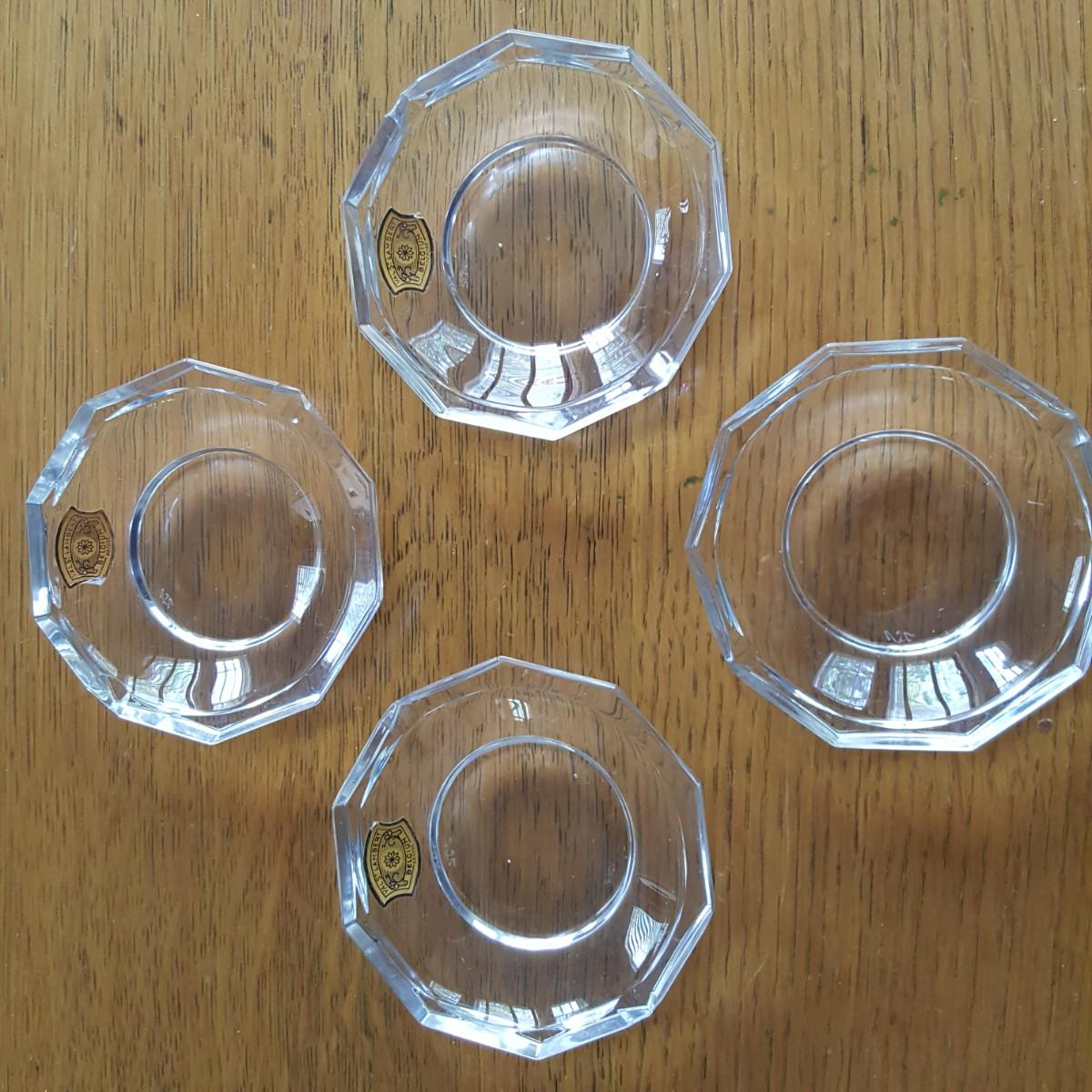This auction lot is for a set of 4 Belgium Crystal Ashtrays. These are small, card table-sized ash catchers. Three of the four are marked Val St. Lambert, Belgium. They are heavy as any lead crystal would be.