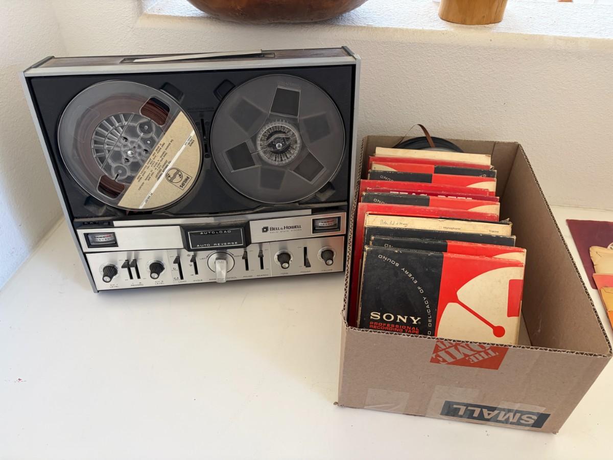 Bell and Howell reel to reel, box of reel-to-reel tapes