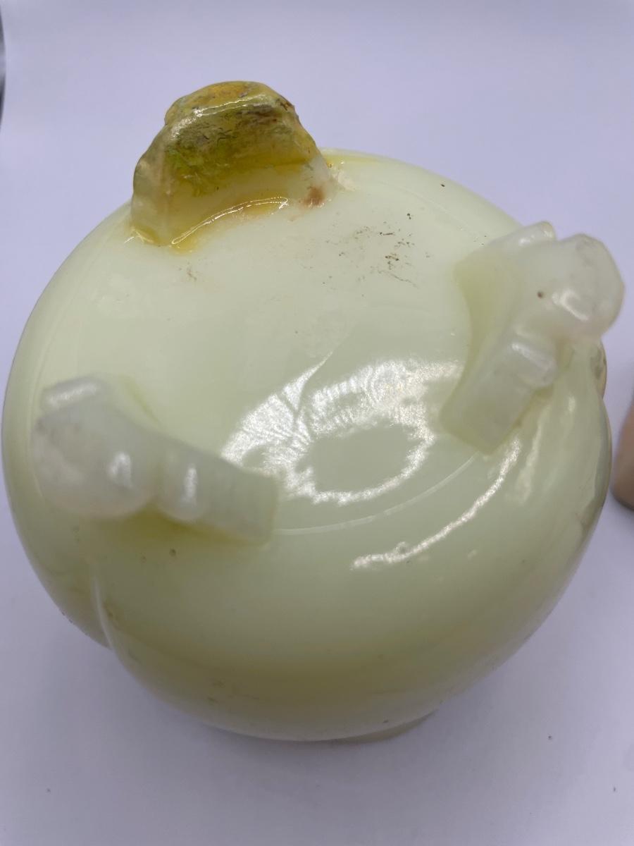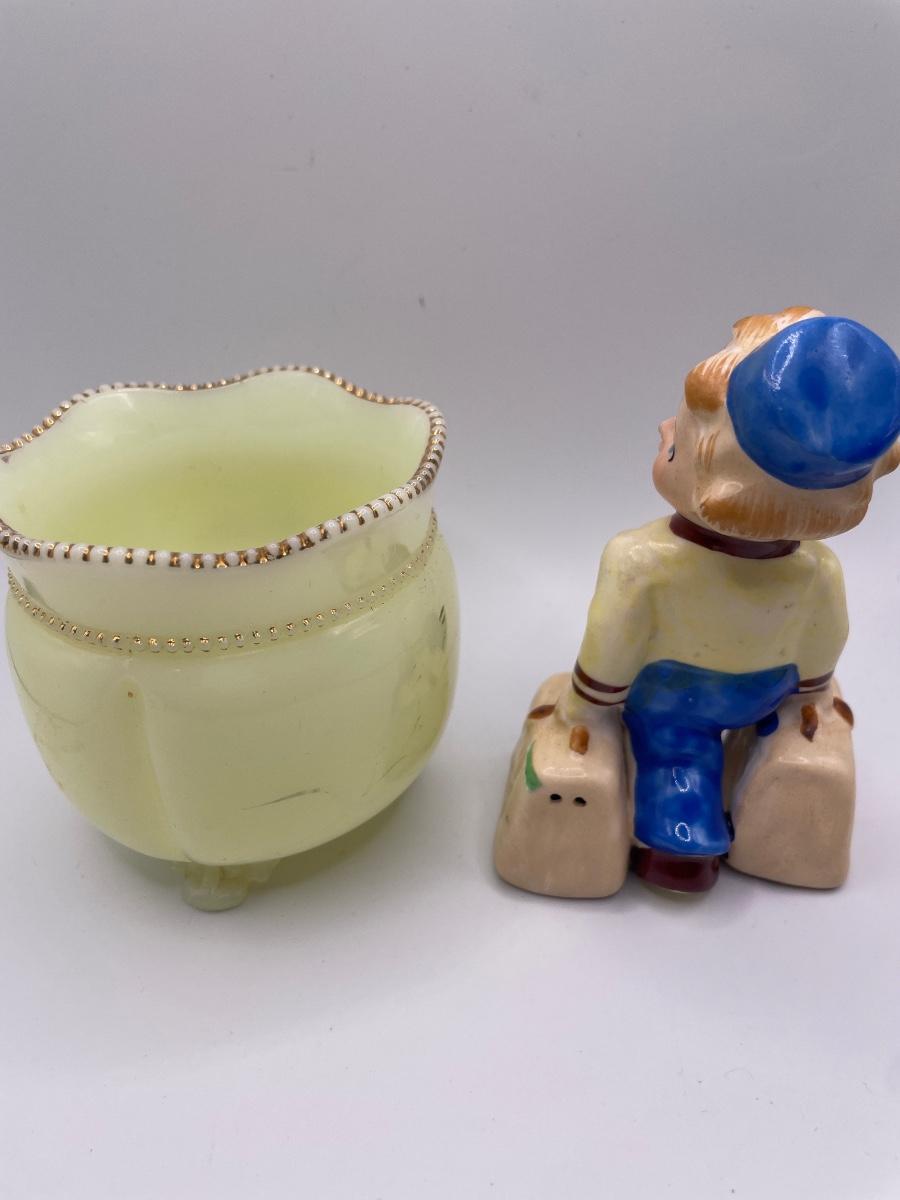 Small custard glass footed jar has a different color foot