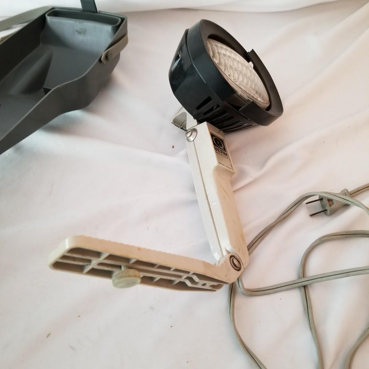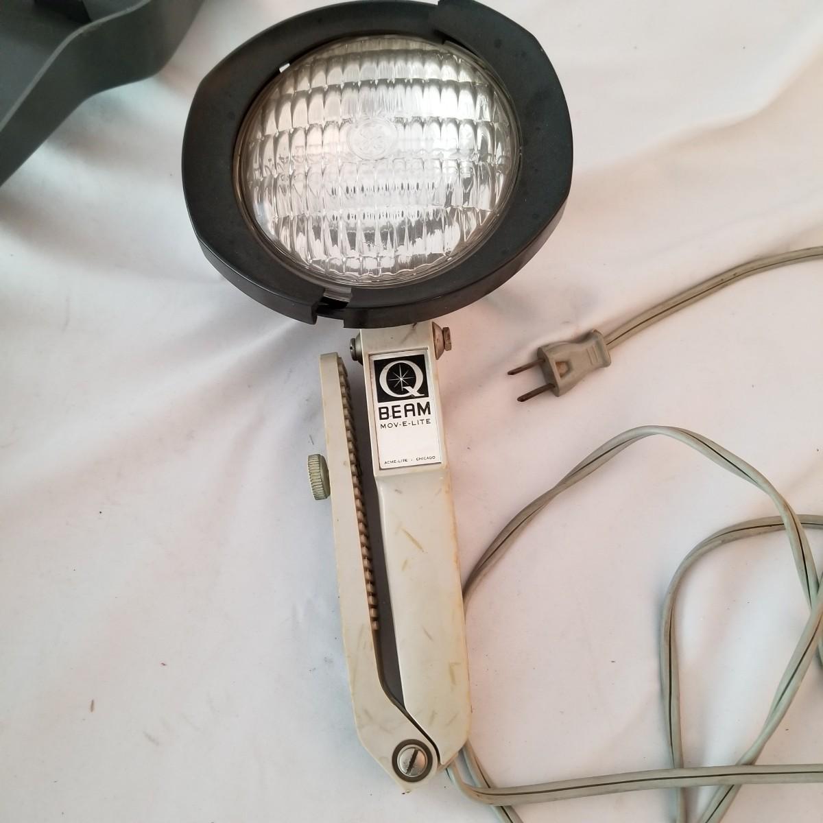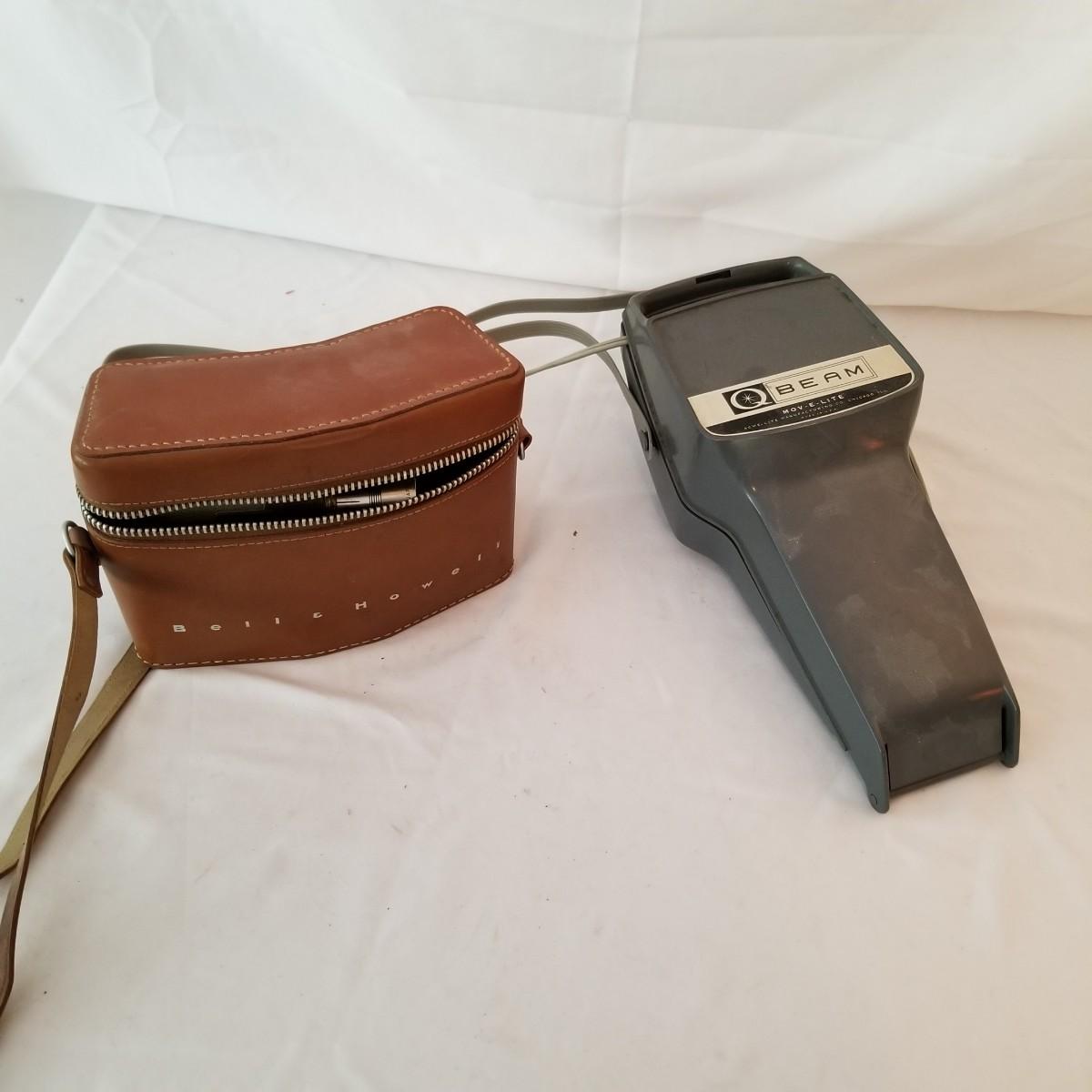 Vintage Bell & Howell 8mm movie camera model 314 with leather case. Has an old style hand crank. Camera comes with original manual and shoulder strap for case. Untested. Also includes a Beam Mov-E-Lite with case. Light plugs into standard AC socket. Did not power up on test, may need bulb. Case around head is also cracked. See photos for detail. Shipping available.