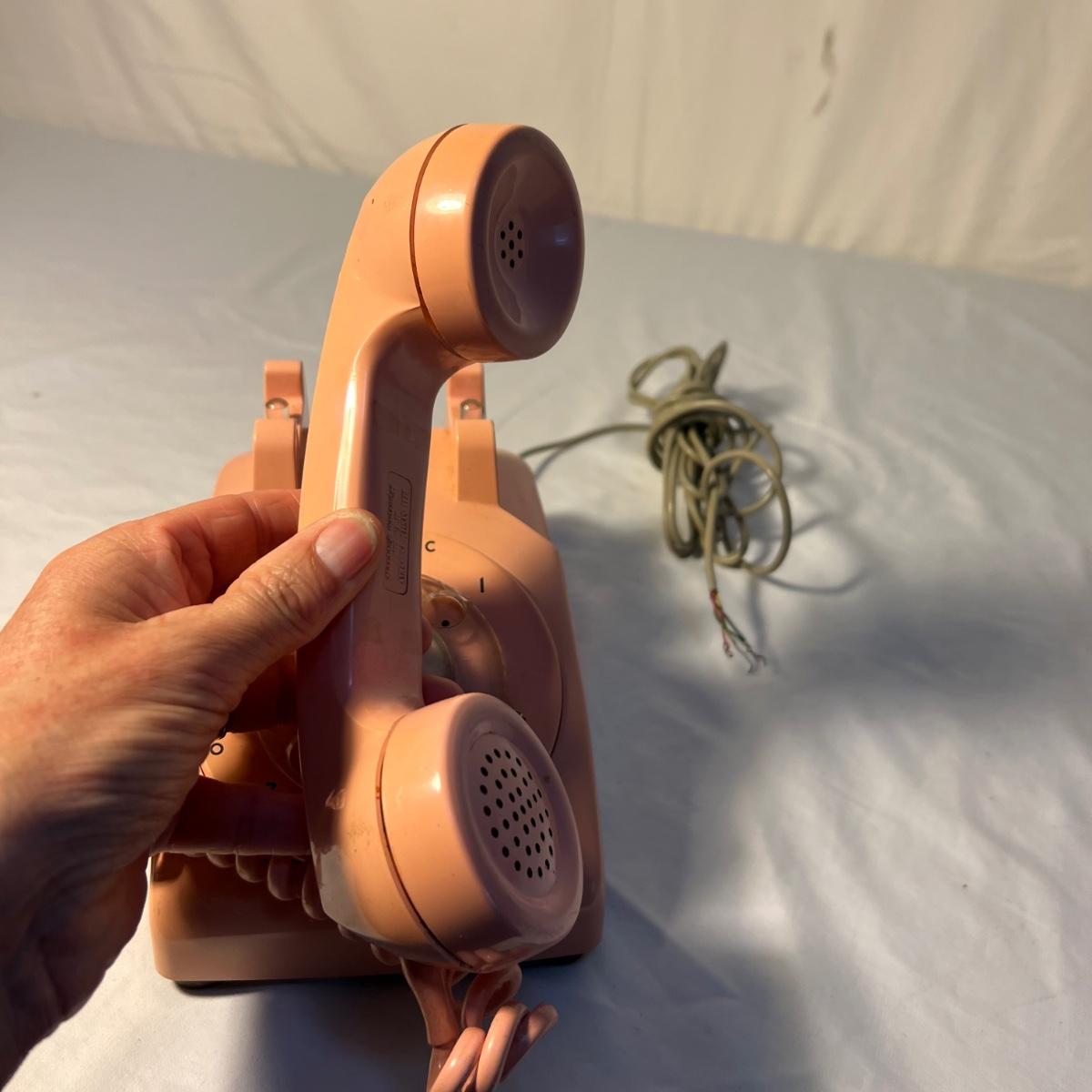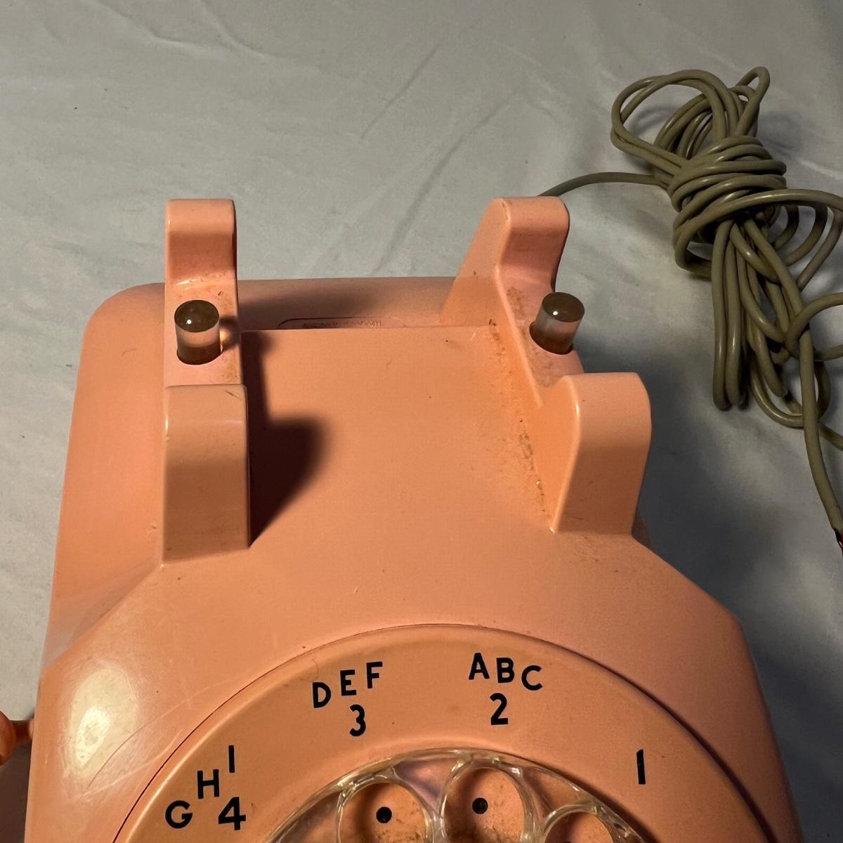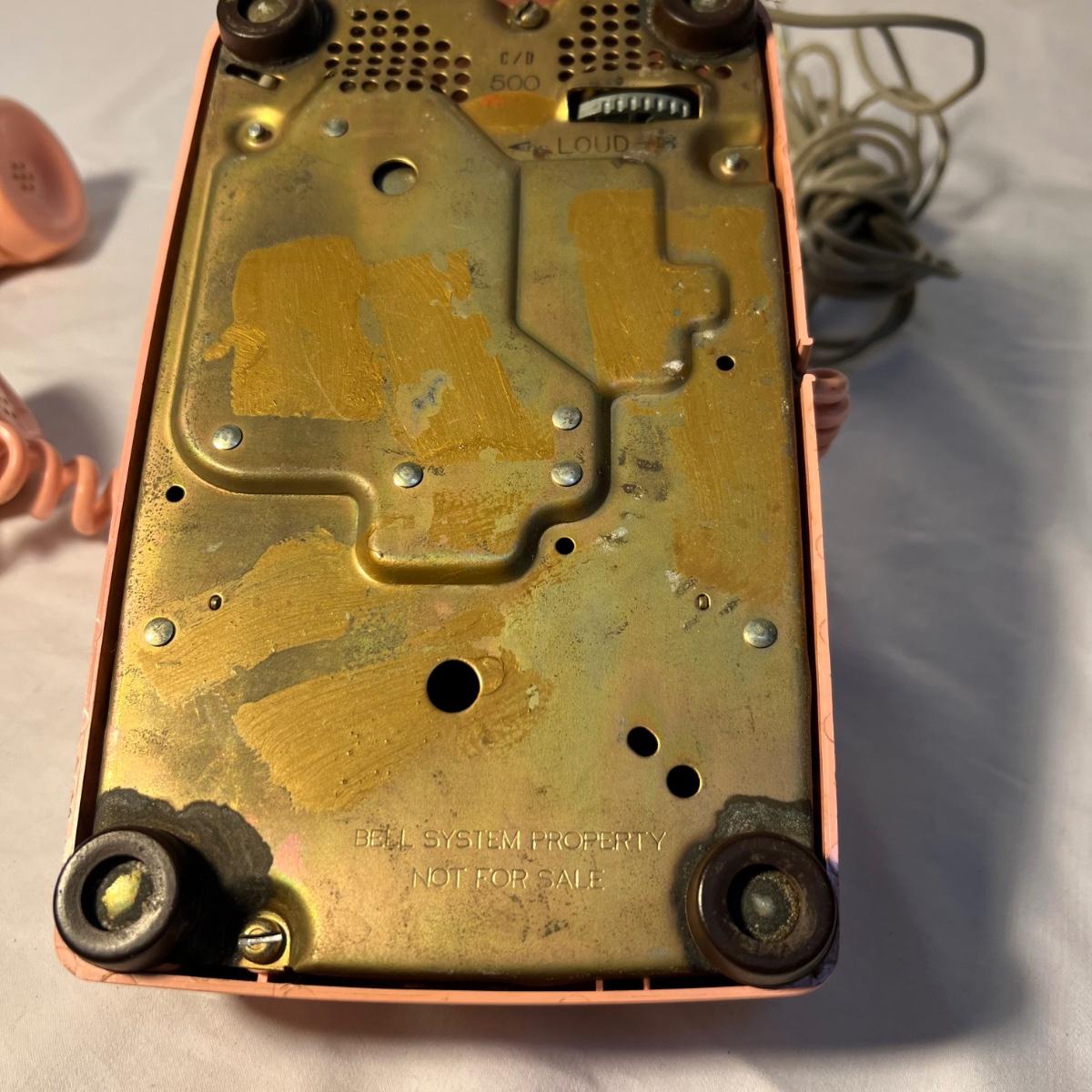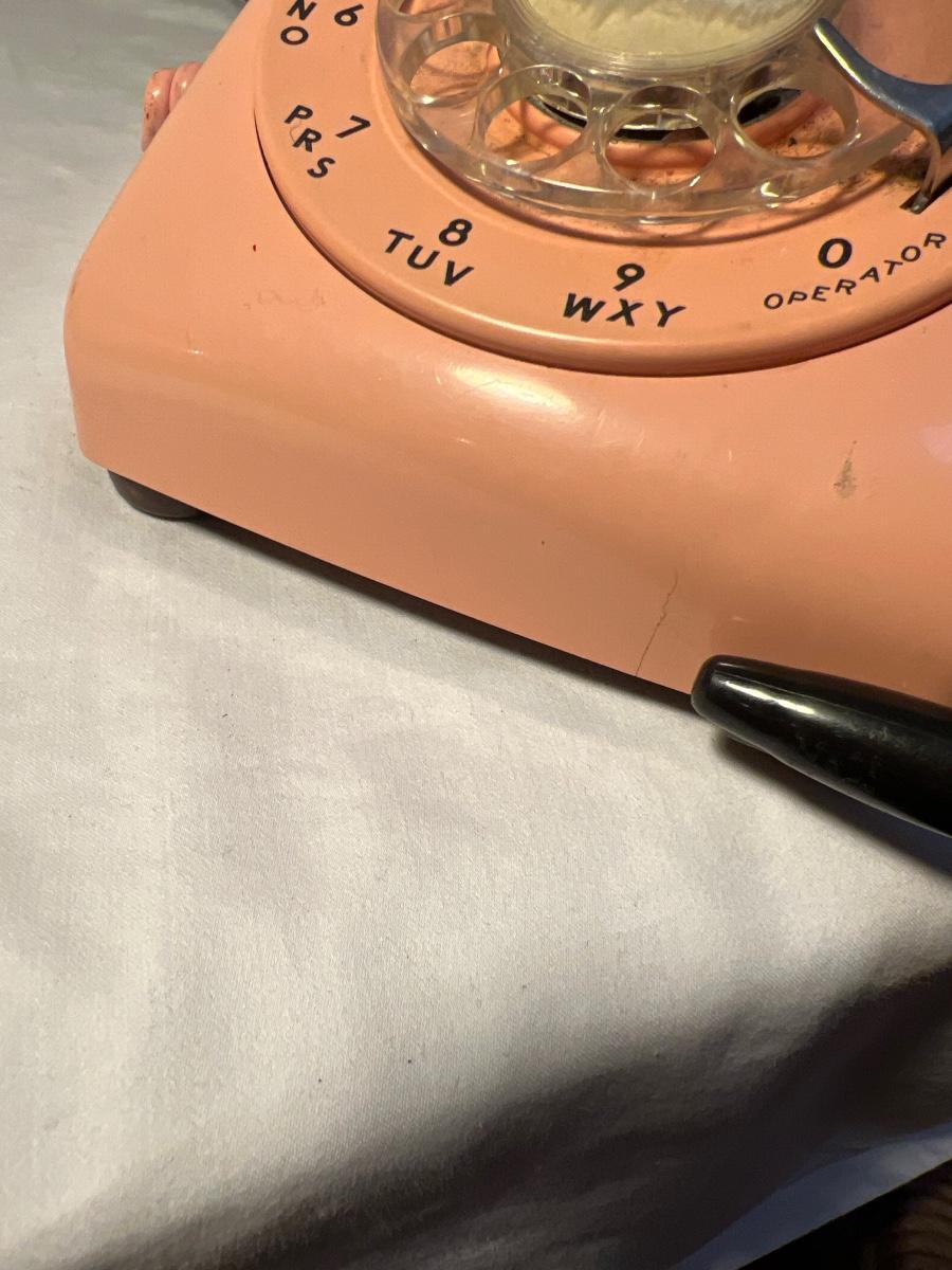 A fabulous pink rotary phone by Western Electric. Stamped C/D 500 on the base. Dial rotates easily and smoothly. Phone does have a small crack, see image. It needs cleaning and the end is missing to the cable.
