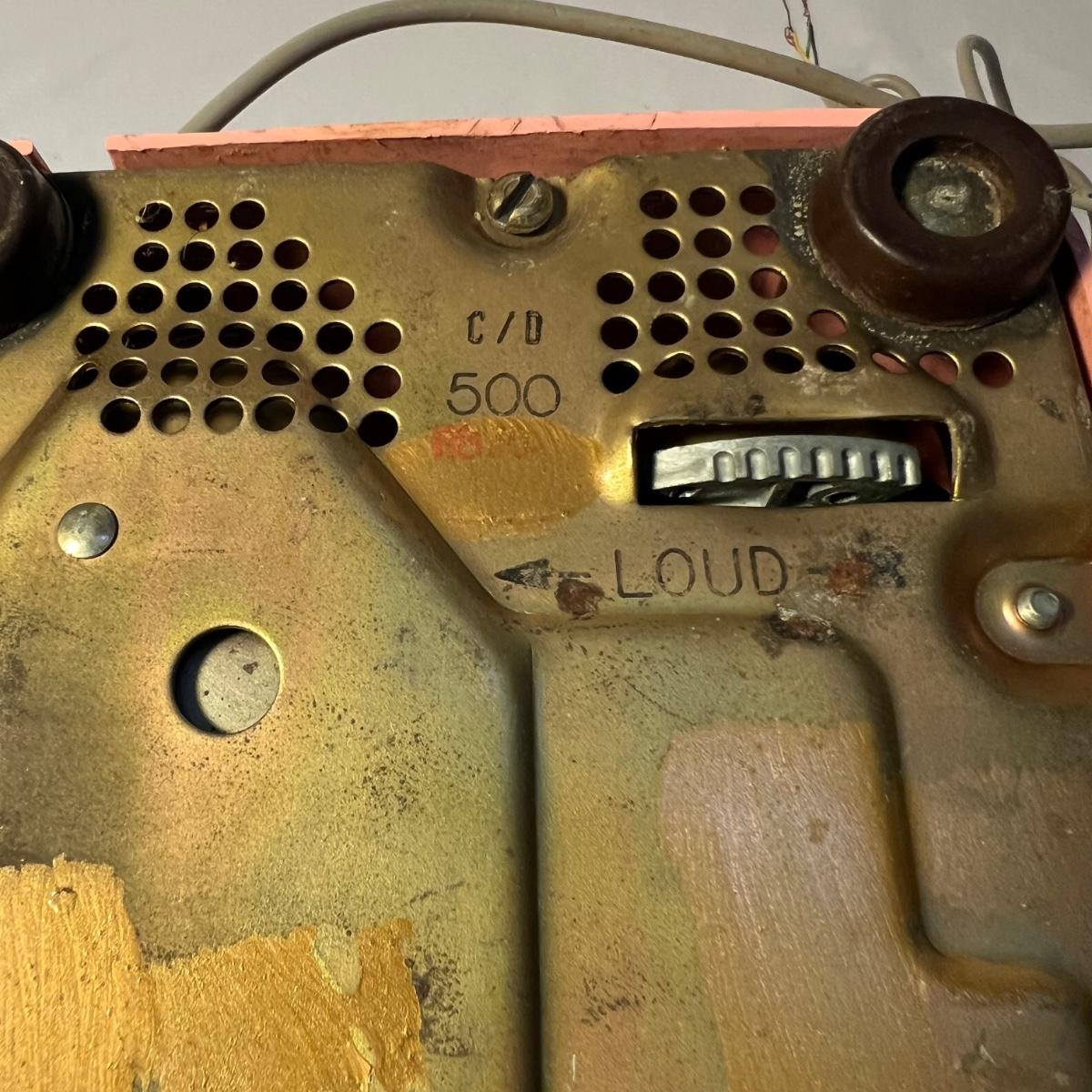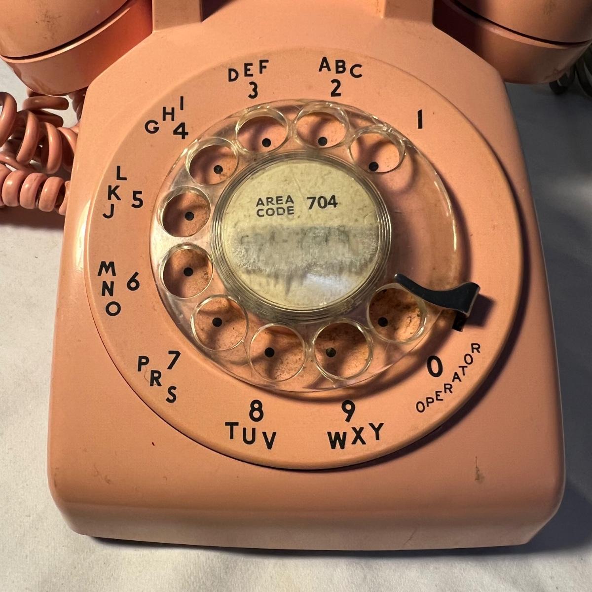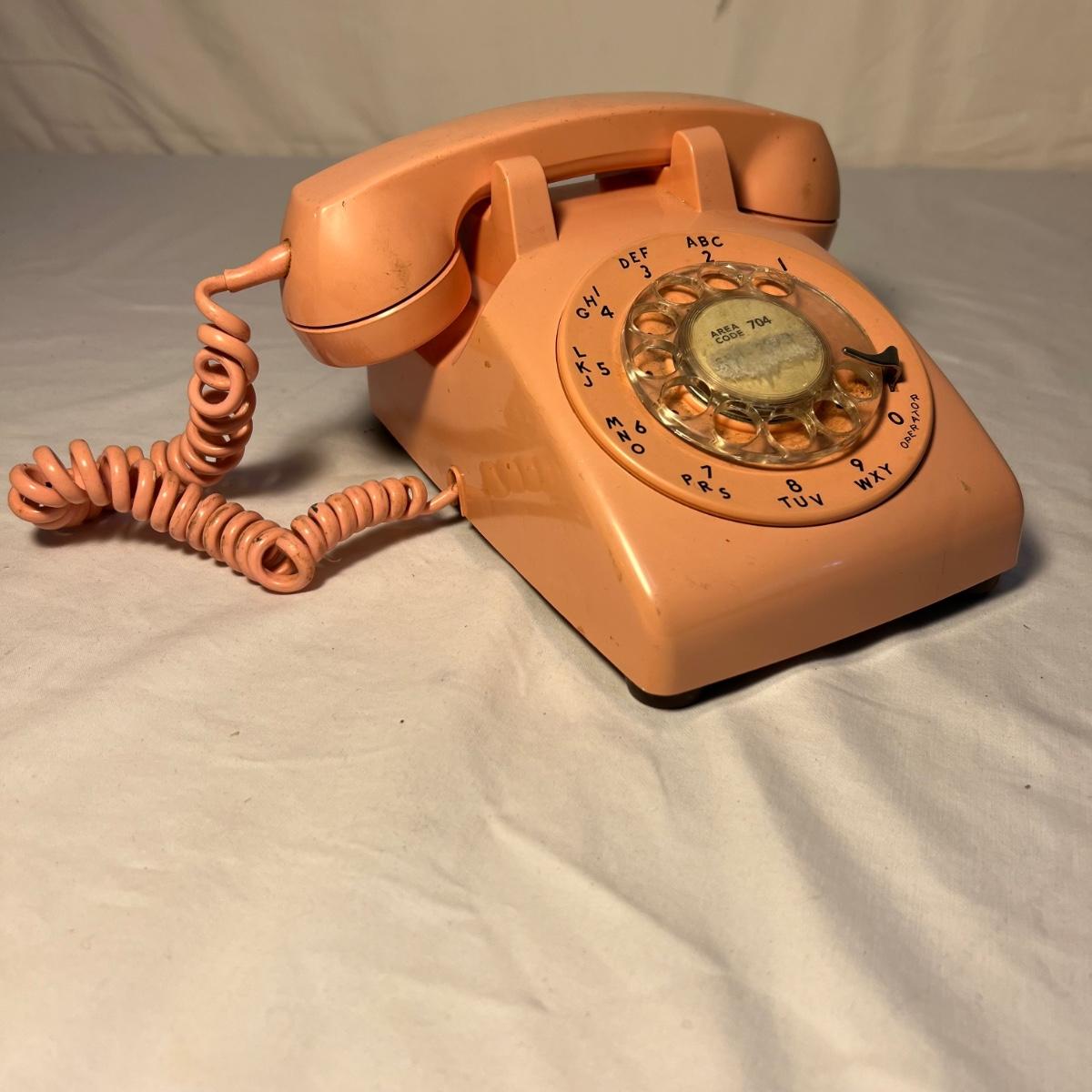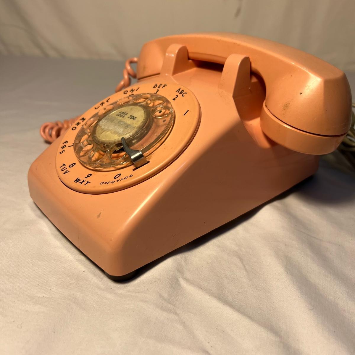 A fabulous pink rotary phone by Western Electric. Stamped C/D 500 on the base. Dial rotates easily and smoothly. Phone does have a small crack, see image. It needs cleaning and the end is missing to the cable.