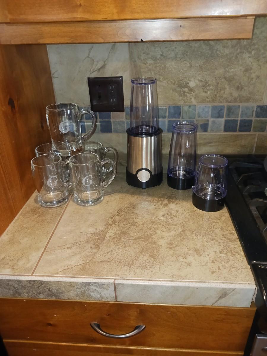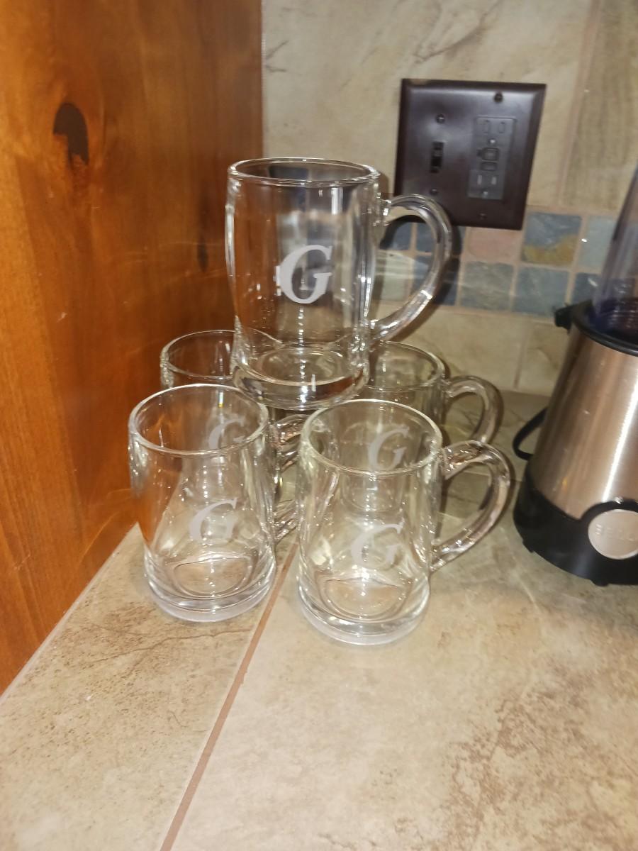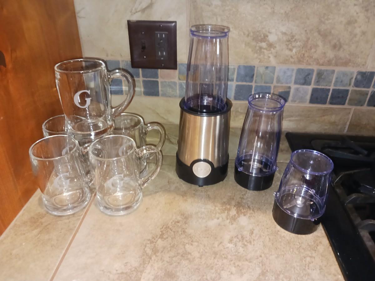 BELLA BLENDER AND 5 GLASS MUGS W/ A "G" MONOGRAM